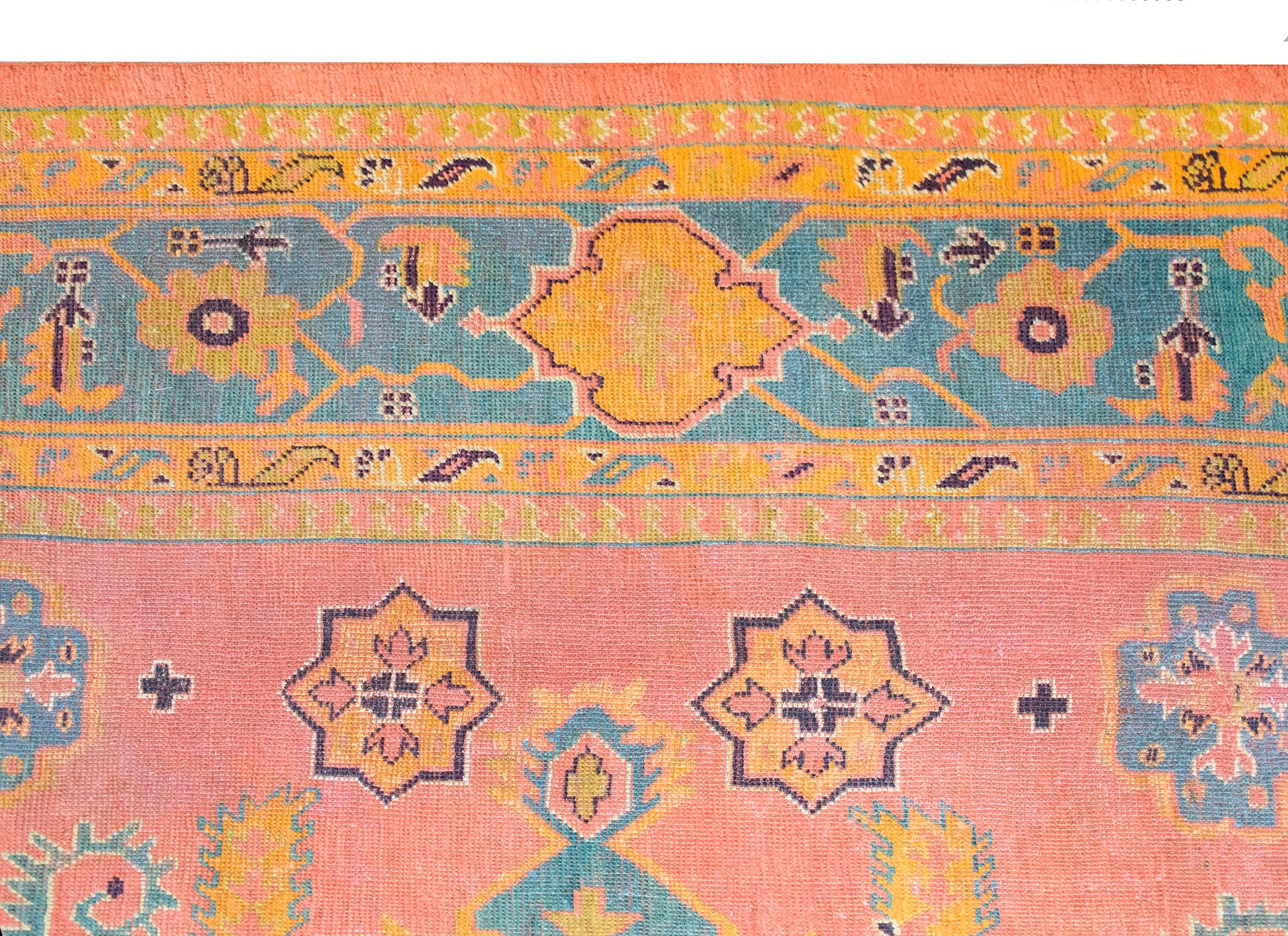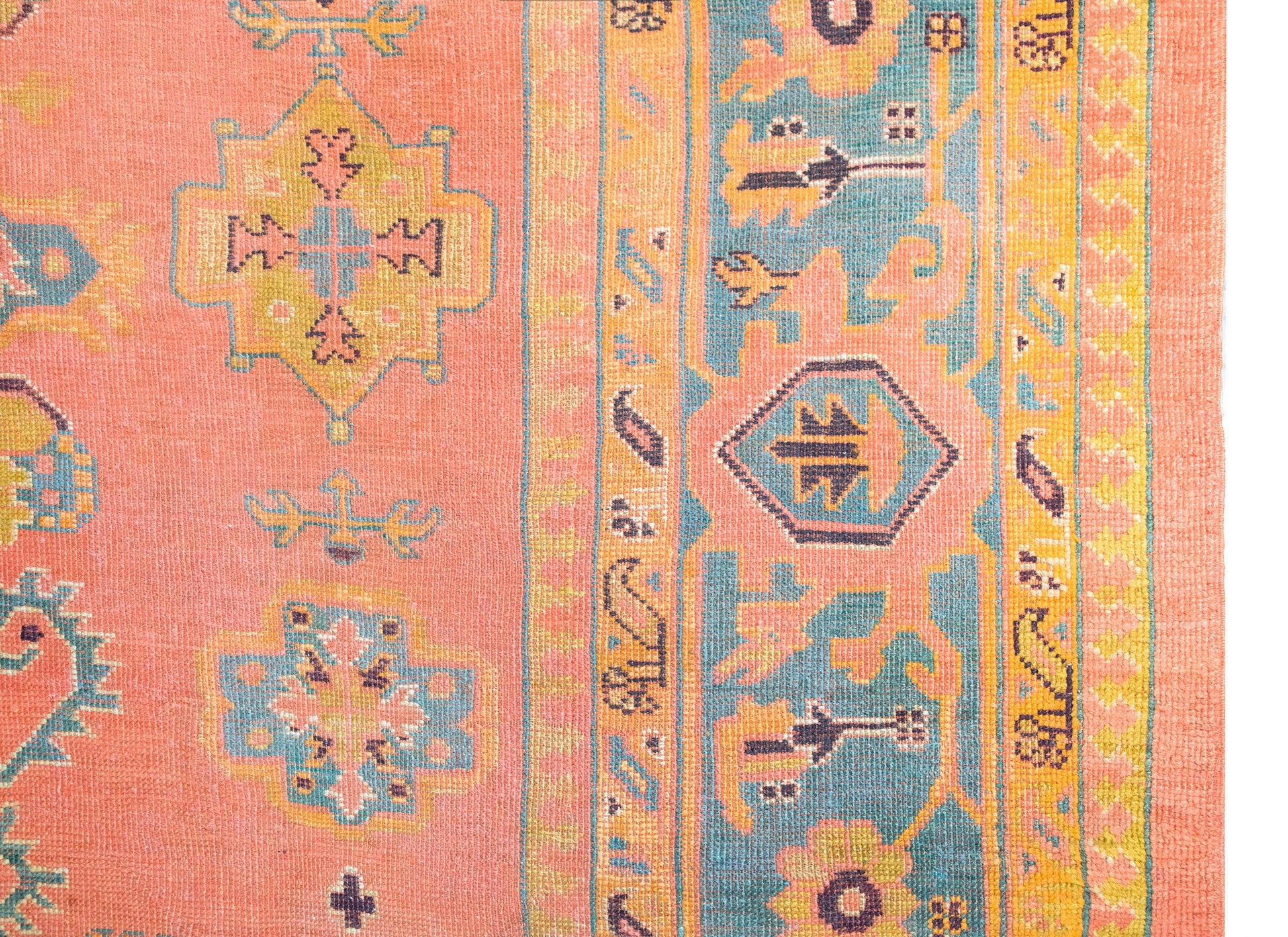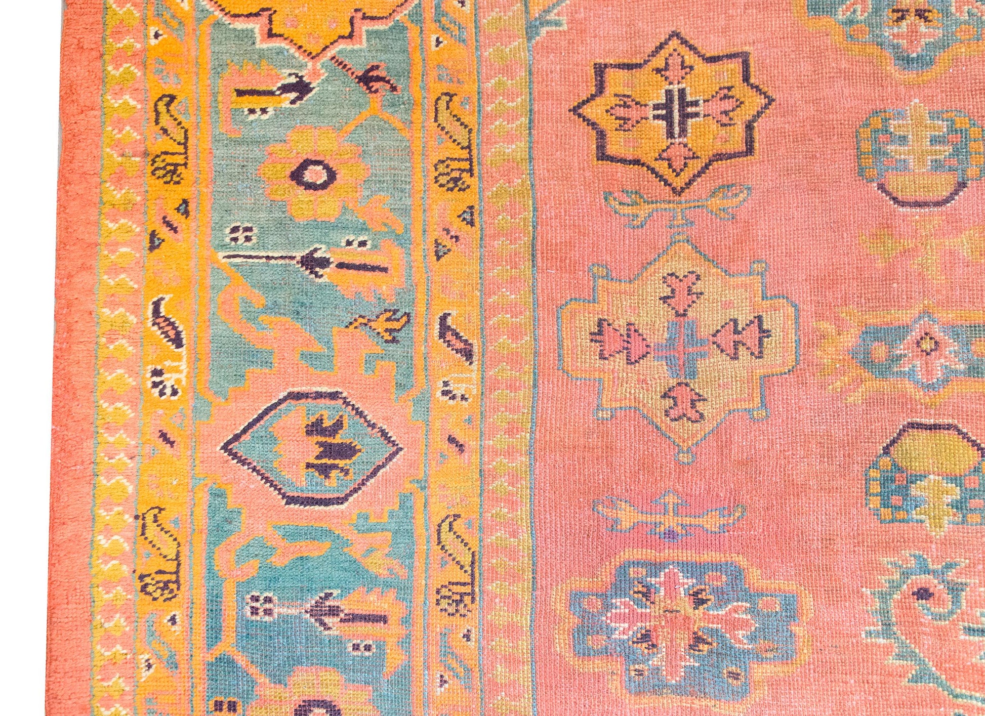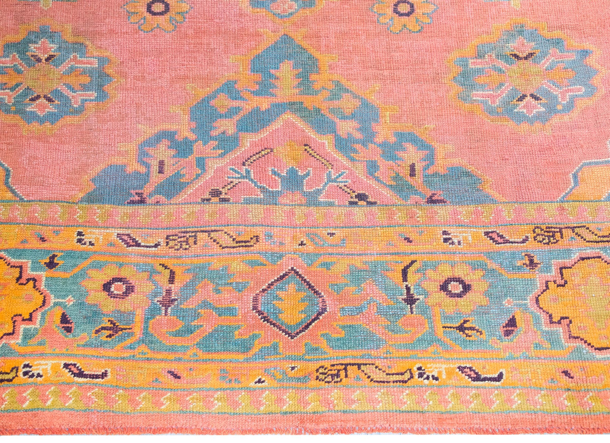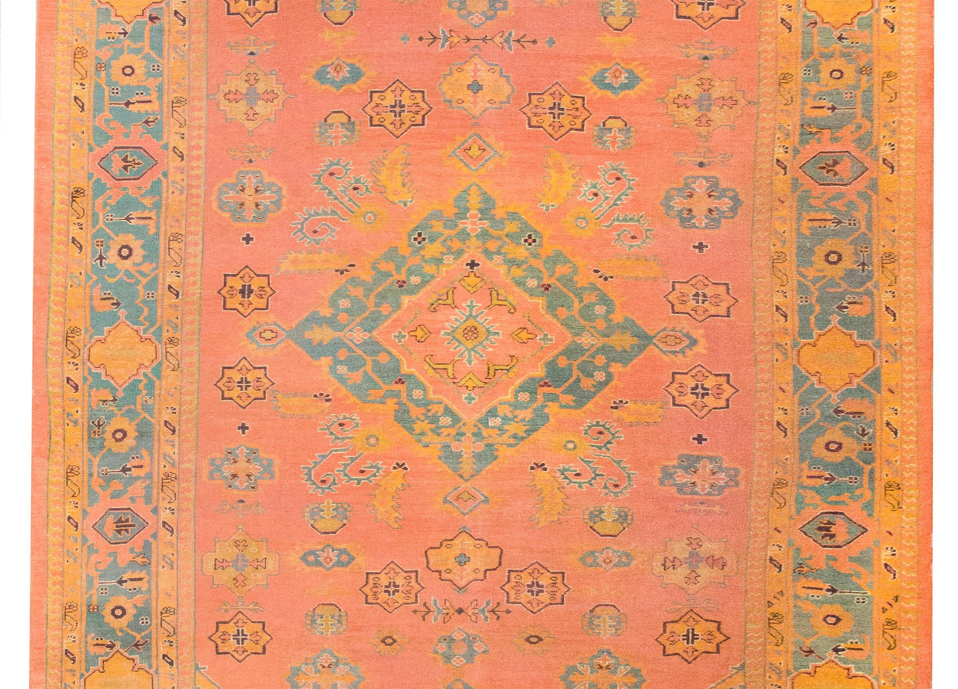 A stunning early 20th century Turkish Oushak rug with an incredible pattern with a large central diamond medallion living amidst a field of more diamonds and stylized flowers and leaves, surrounded by a wide border with a. repeated floral pattern, and all woven in varying shades of brilliant pinks, corals, oranges, and indigos.