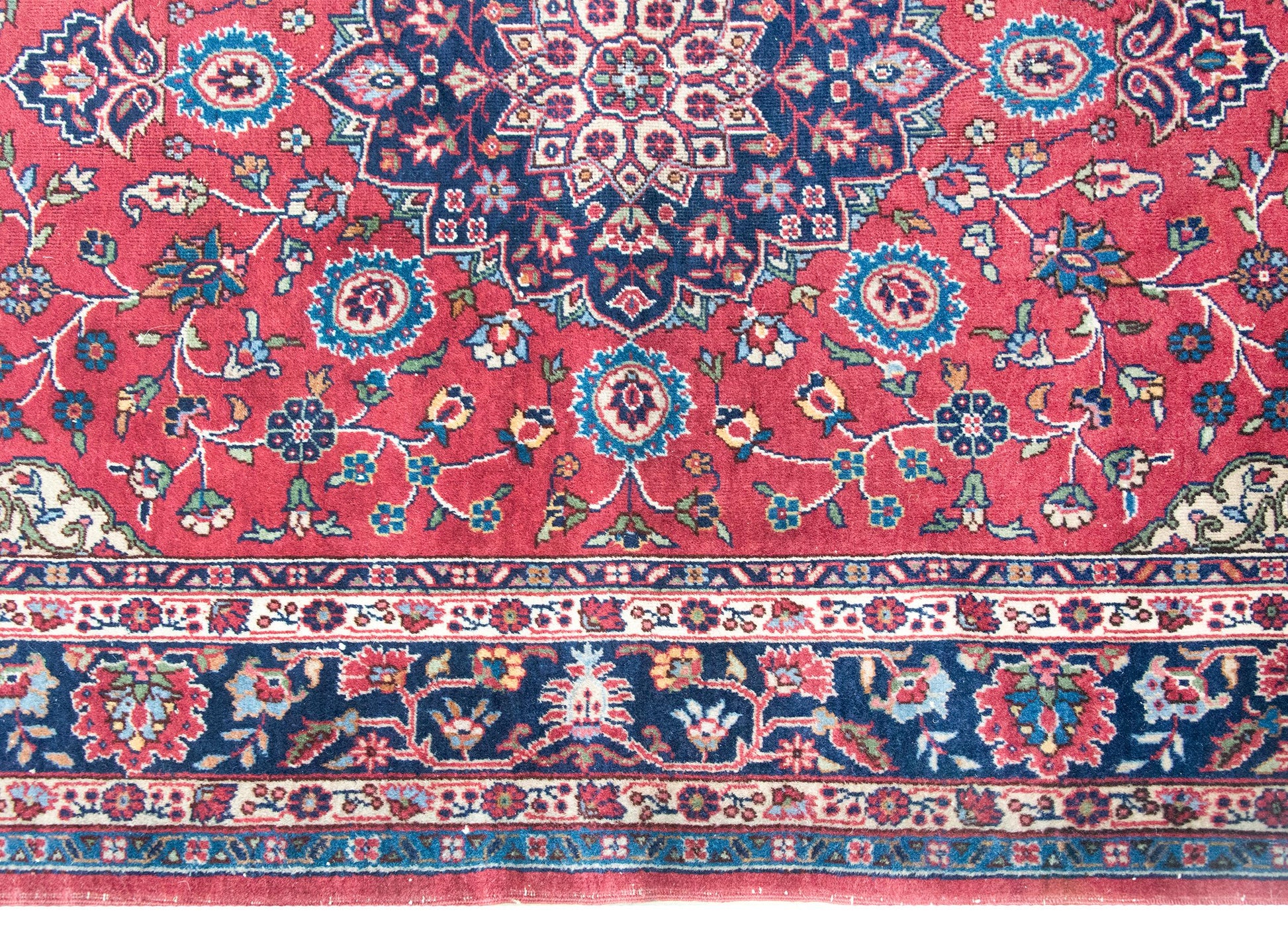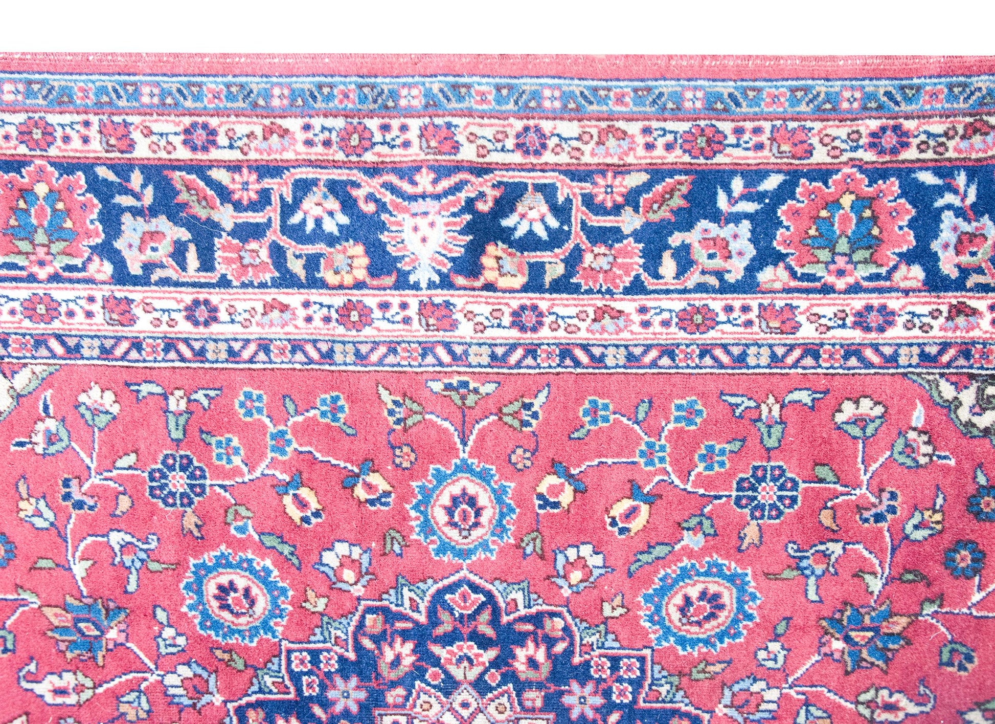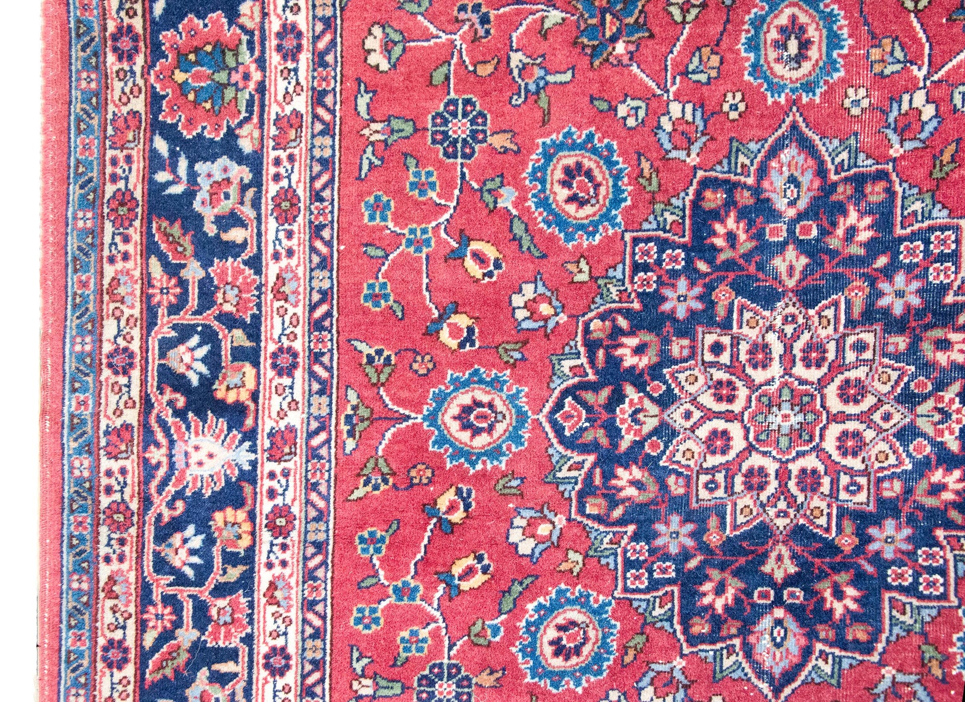 An elegant early 20th century hand-knotted Sparta rug from western Turkey, woven in richly dyed wool with a classical Persian floral medallion design. The central field features a deep navy medallion radiating over a ground of saturated rose, scattered with stylized blossoms, palmettes, and scrolling vines. Pale indigo and ivory corner spandrels frame the field, leading to a wide navy border filled with large-scale lotus flowers and curling saz leaves, flanked by delicate guard stripes.