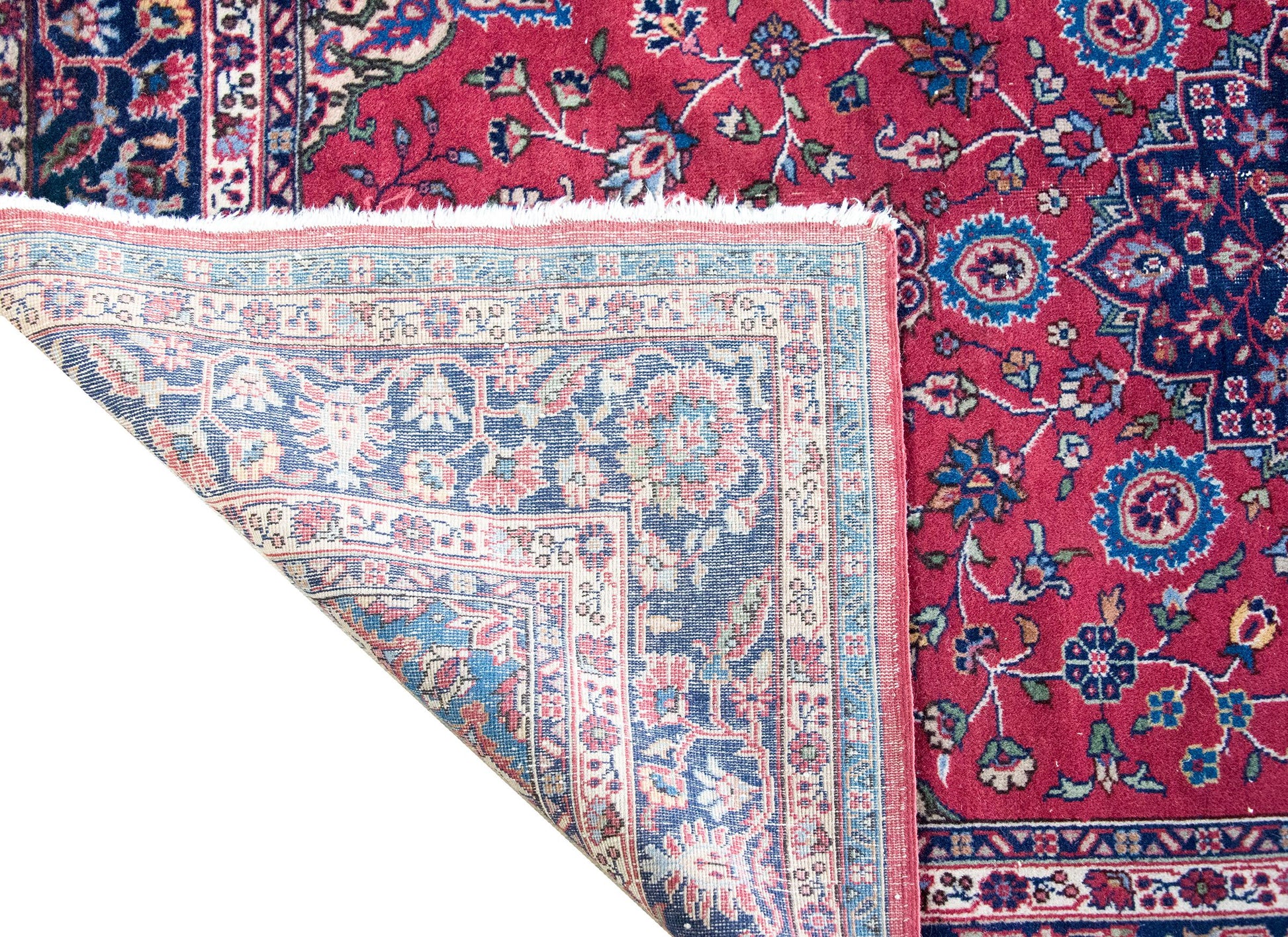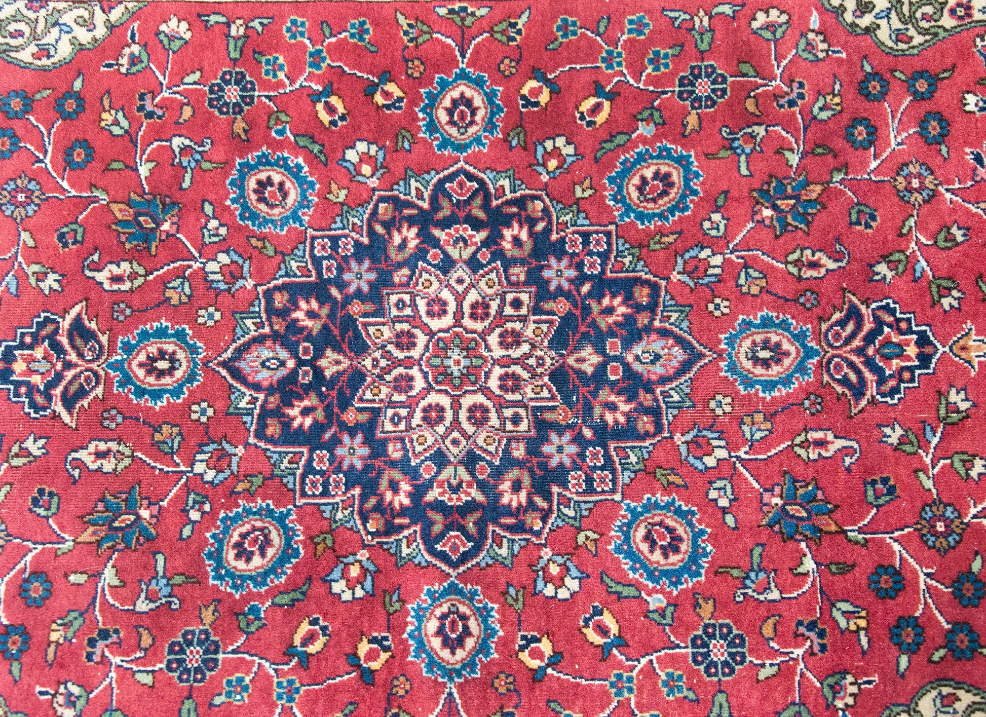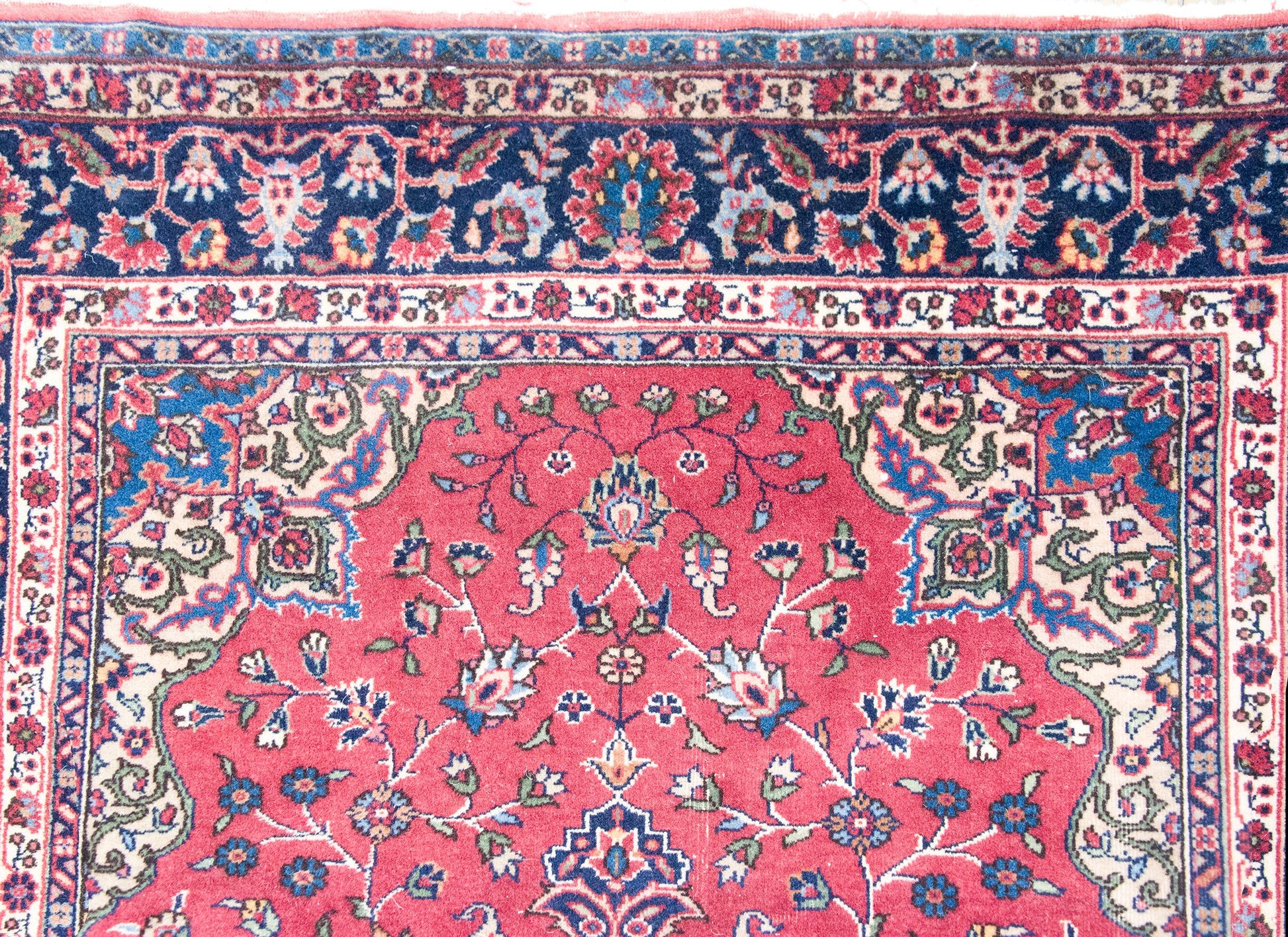 An elegant early 20th century hand-knotted Sparta rug from western Turkey, woven in richly dyed wool with a classical Persian floral medallion design. The central field features a deep navy medallion radiating over a ground of saturated rose, scattered with stylized blossoms, palmettes, and scrolling vines. Pale indigo and ivory corner spandrels frame the field, leading to a wide navy border filled with large-scale lotus flowers and curling saz leaves, flanked by delicate guard stripes.