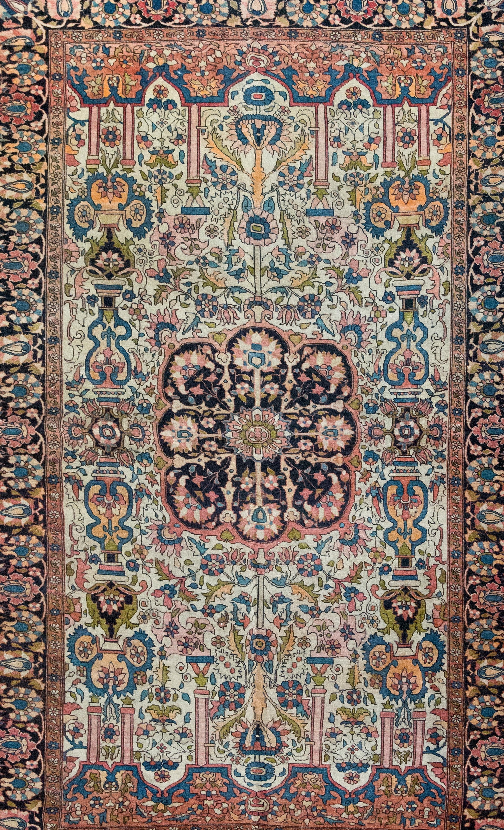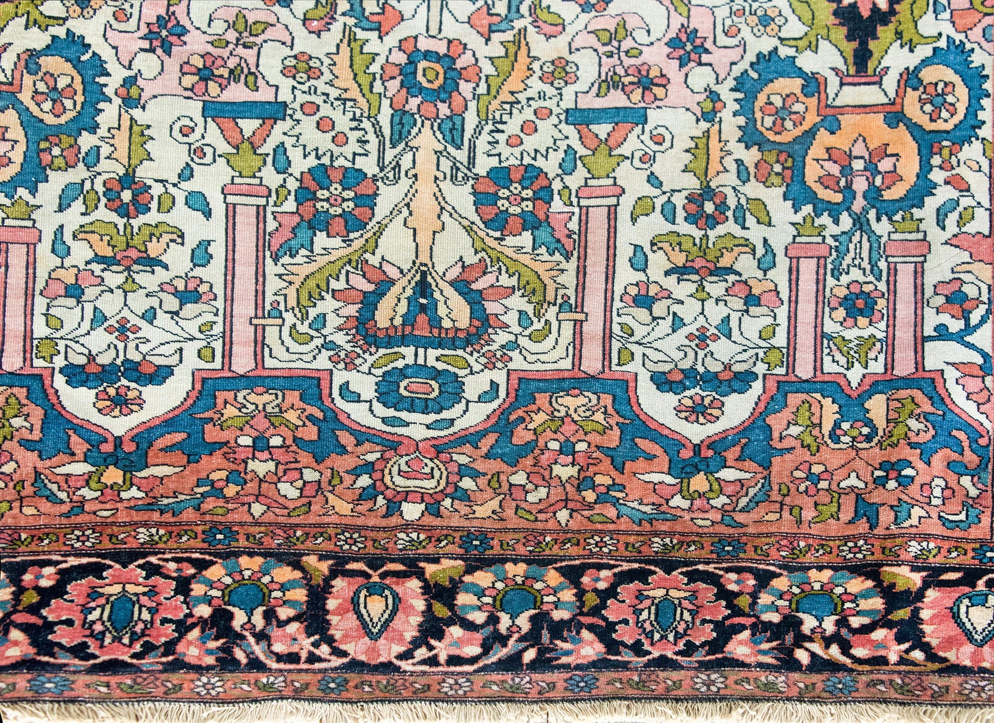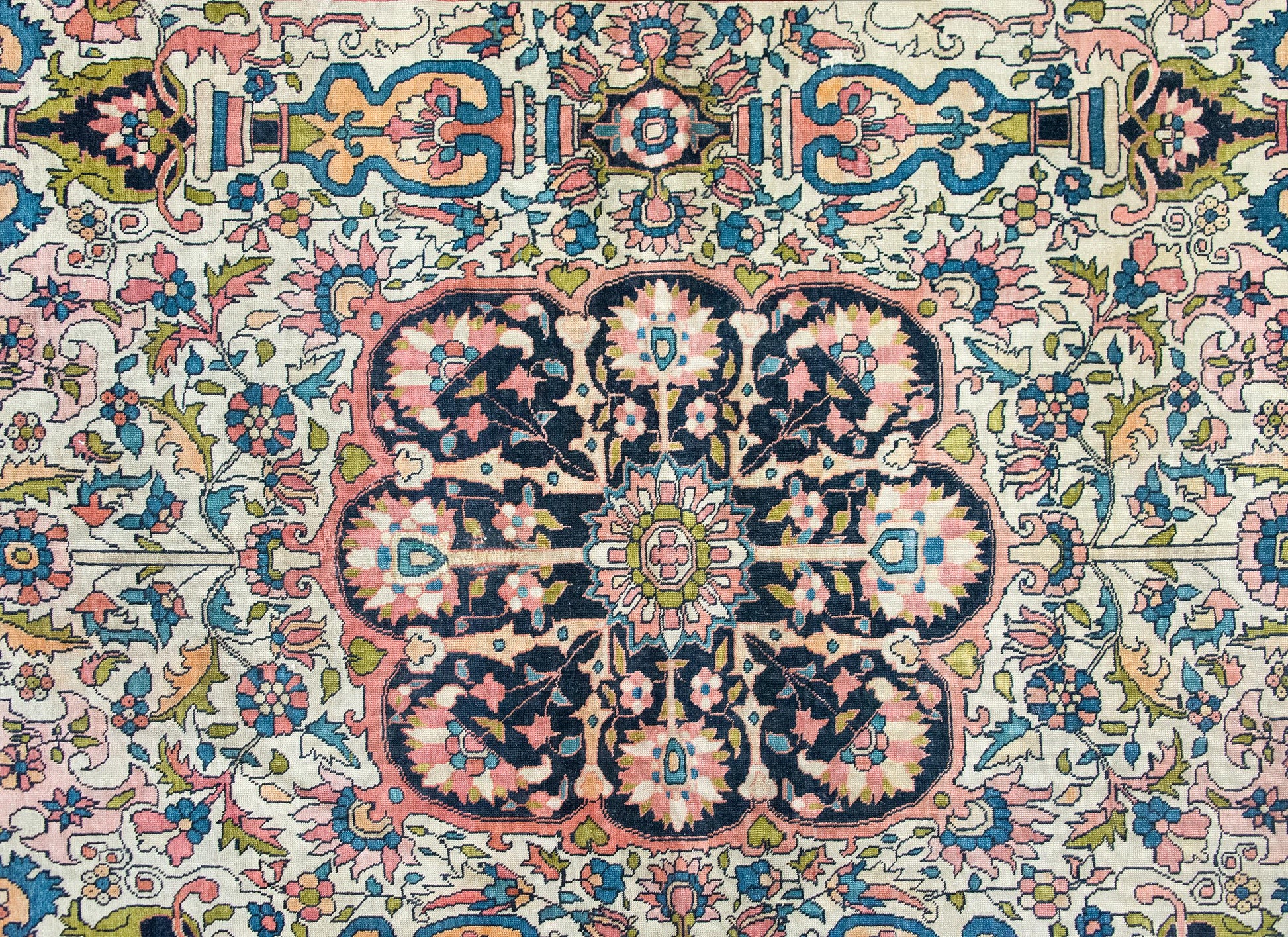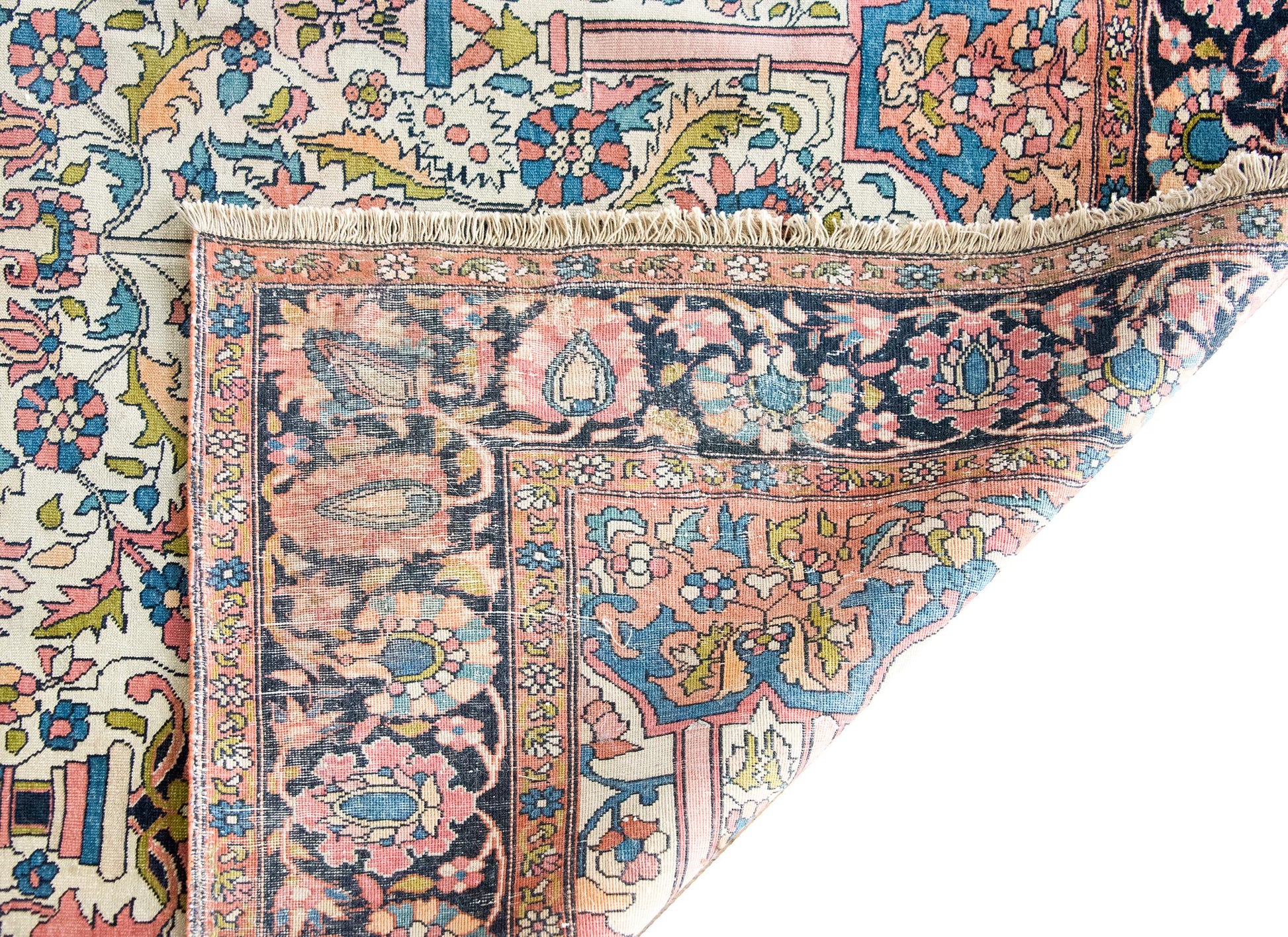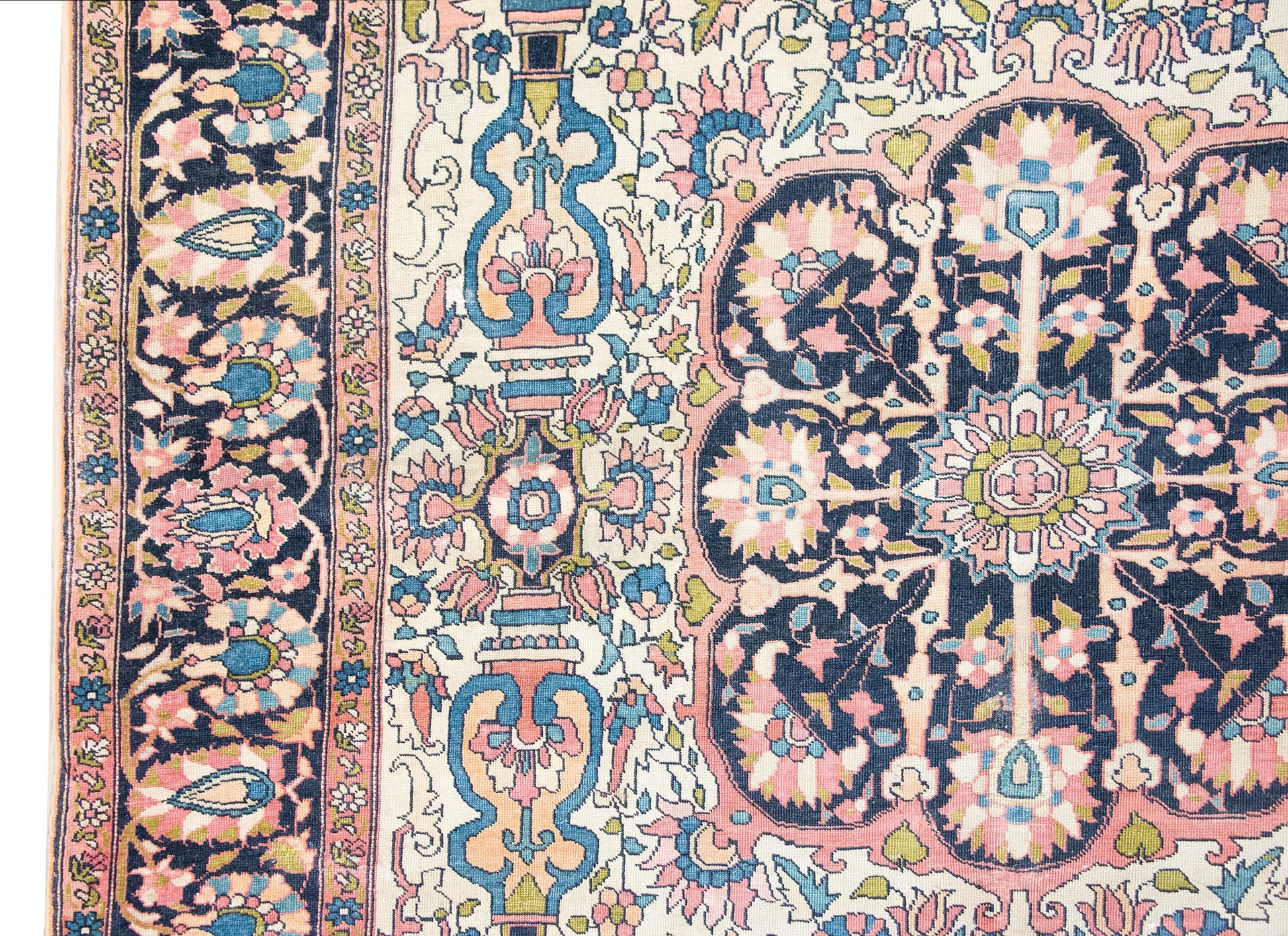 Woven circa 1900, this Sarouk Farahan rug is a refined example of one of the most collectible Persian rug styles. Made in the Farahan district of west-central Iran by highly skilled Persian artisans, Sarouk Farahan rugs are known for their crisp drawing, balanced composition, and exceptional dye work. This piece features a delicate ivory field anchored by a navy and rose medallion, surrounded by an explosion of stylized floral motifs—vases, palmettes, vines, and blossoms—all rendered in coral, soft blue, peach, teal, and moss green. The border is equally lyrical, a scrolling garden of florals on a midnight ground. Prized by collectors and decorators alike, Farahan rugs bridge formal elegance with subtle whimsy, offering intricate detail without overwhelming the eye. Their palette feels both antique and surprisingly fresh. This example, with its luminous coloration and superb condition, captures the quiet grandeur and painterly spirit that has made Sarouk Farahan rugs enduring favorites for over a century.