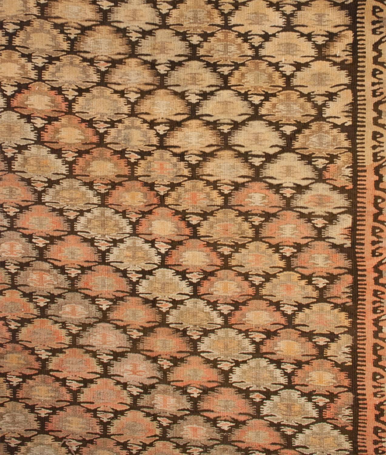 An incredible early 20th century Persian Qazvin Kilim runner with a masterfully woven pattern of stylized tree-of-life patterns woven in natural undid wool and vegetable dyed wool. The border is composed of multiple distinct patterns, each one unique, with geometric and floral patterns.