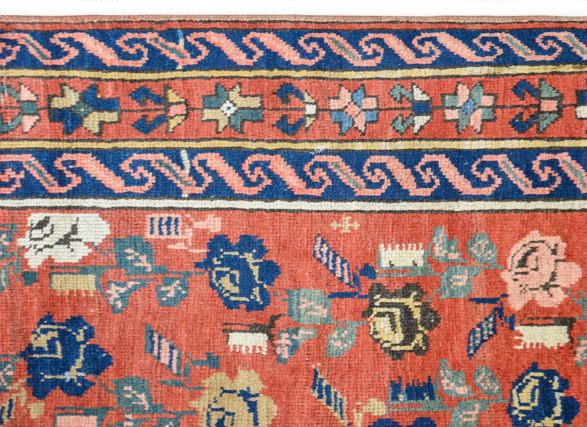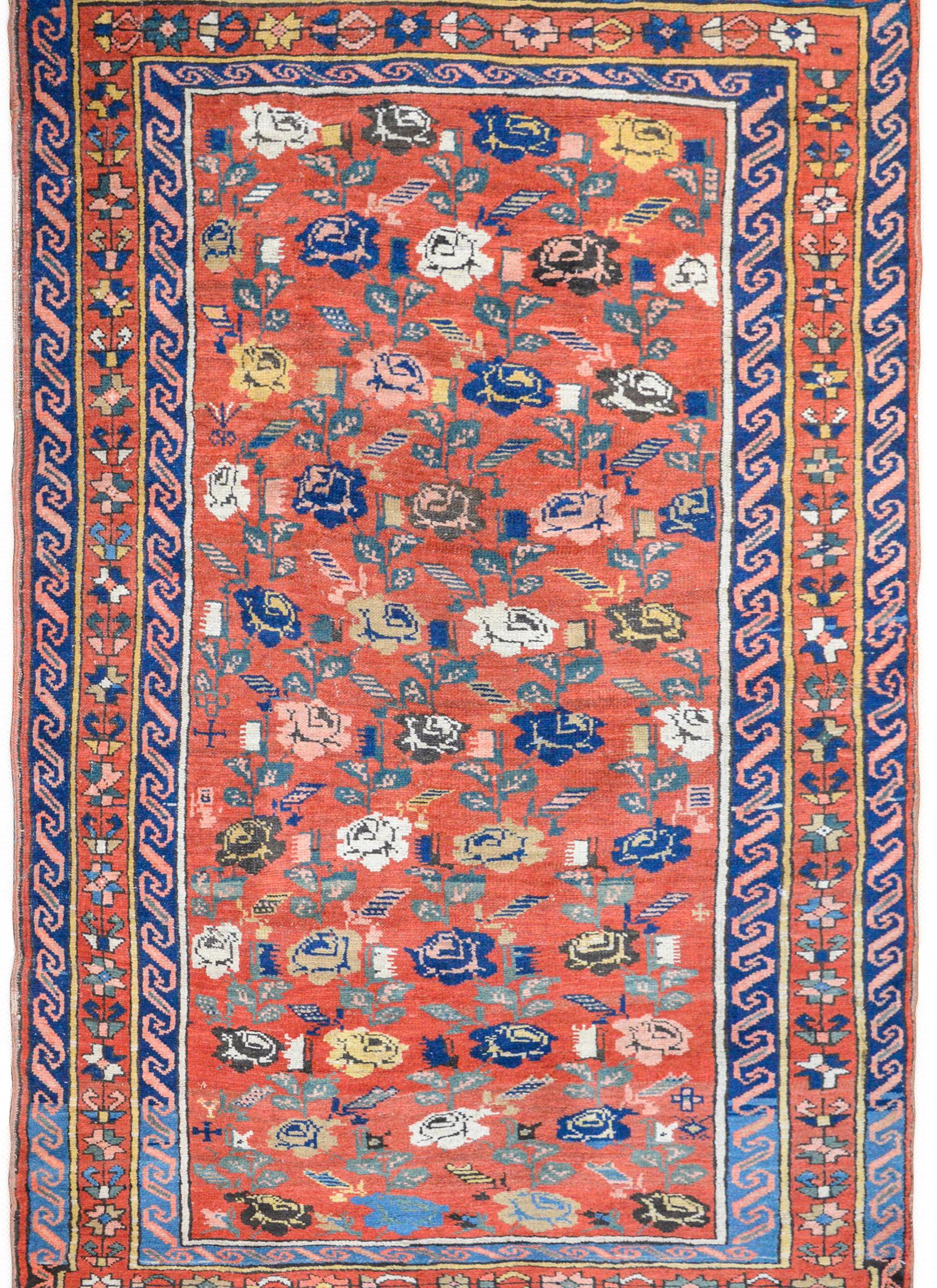 An extraordinary early 20th century Caucasian Karabagh rug with an all-over large scale rose pattern woven in white, brown, indigo, gold, and pink with green leaves, and all against a crimson background. The border is wonderful with a central stylized floral pattered stripe flanked by a pair of matching geometric pattered stripes.