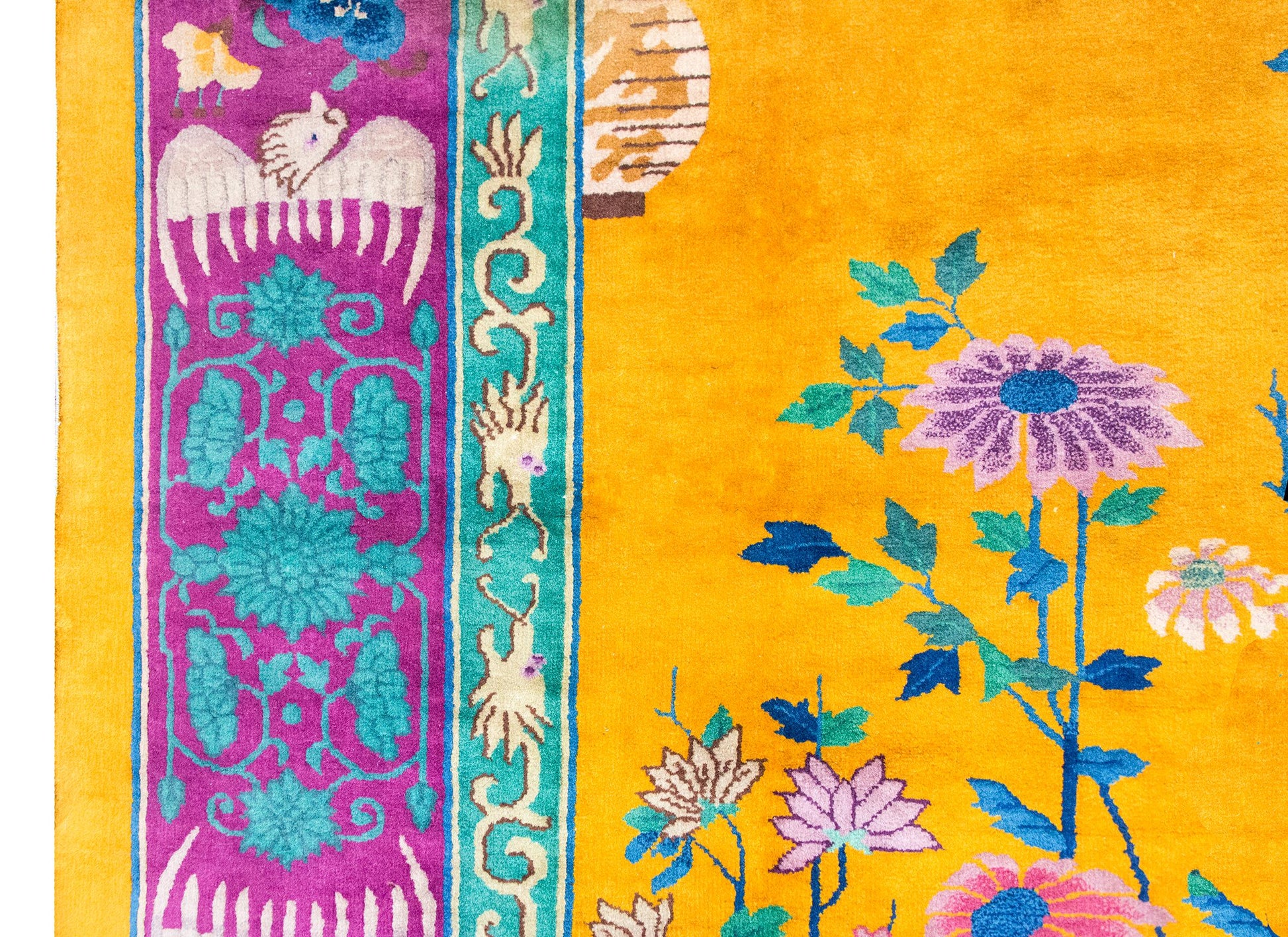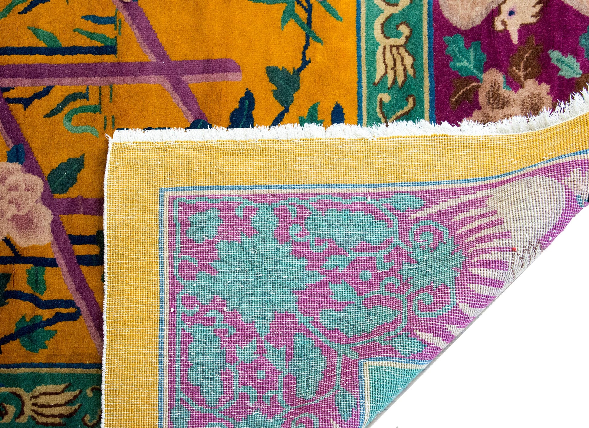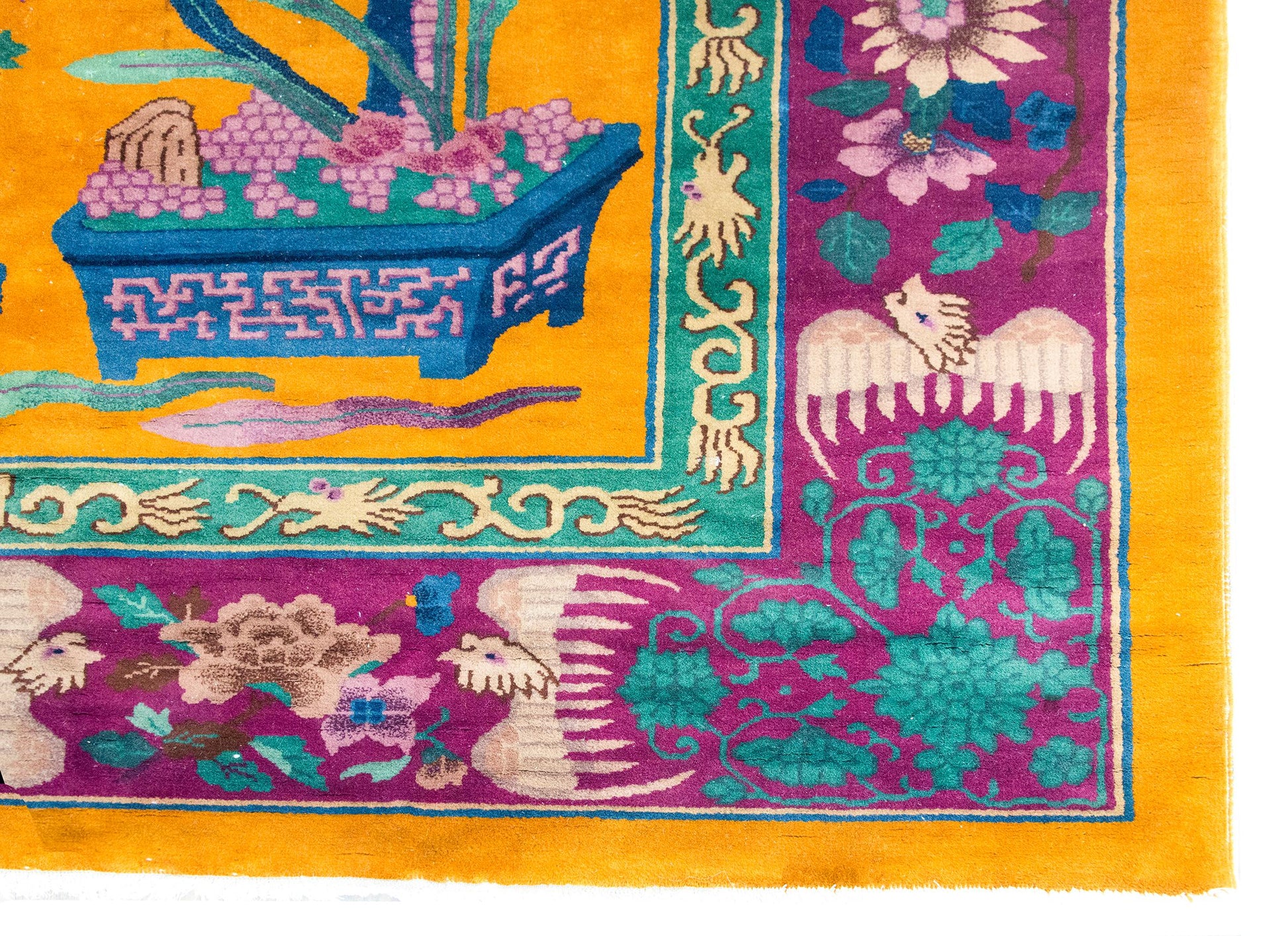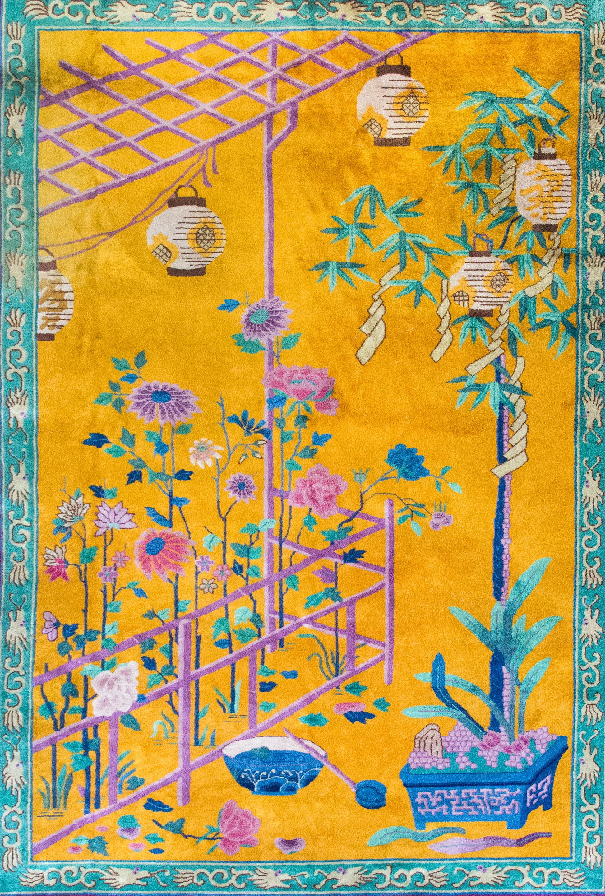 In over 40 years of dealing in fine rugs, few pieces have stopped us in our tracks like this early 20th-century Chinese Art Deco masterpiece. Woven in the 1920s, it depicts a lush garden of peonies and chrysanthemums, enclosed by a delicate fence and shaded beneath a lattice pergola. In the lower right corner, a potted bamboo plant stretches skyward, its branches adorned with floating paper lanterns—an ethereal, dreamlike touch. The border is truly otherworldly, with a dazzling bat-and-chrysanthemum motif alternating with radiant peonies. An inner stripe carries a stylized dragon pattern, adding movement and mythic energy. The palette is pure Art Deco fantasy: gold, indigo, violet, purple, and turquoise woven in rich, saturated hues. This rug is not only an exceptional example of Chinese craftsmanship, but also a definitive expression of 1920s Art Deco design—elegant, whimsical, and entirely unforgettable. A true standout, even among the best.