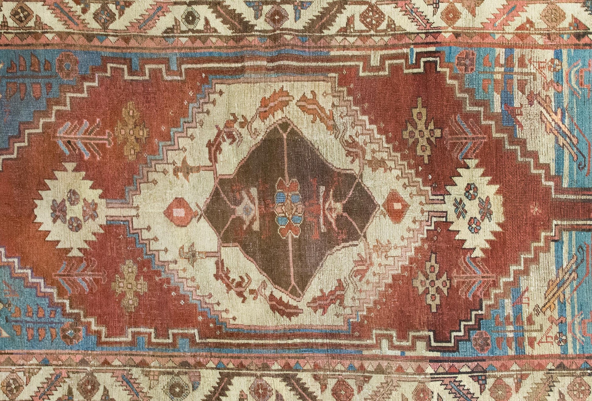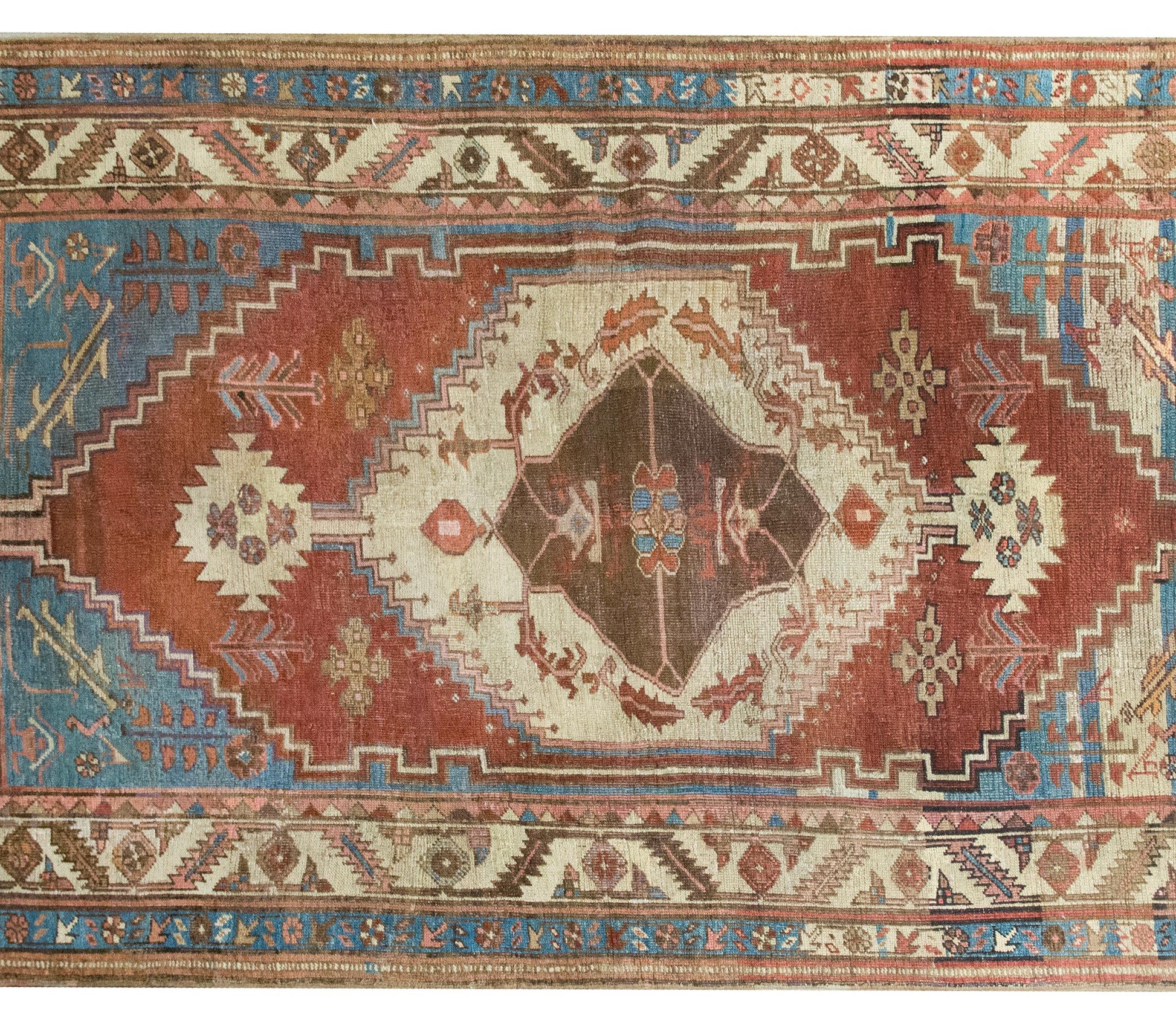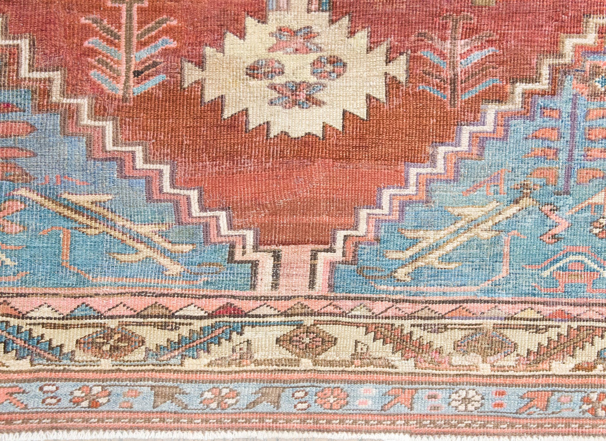 This incredible late 19th-century Persian Bakshaish rug is a masterpiece of tribal weaving, featuring a breathtaking large-scale floral medallion set against a rich brick-red field adorned with more stylized blossoms and vines. Surrounding this vibrant composition is one of the most outstanding borders we’ve seen in some time—a central band of repeated stylized leaves and floral motifs, flanked by two distinct geometric and floral-patterned stripes. The entire piece is woven in a refined palette of muted reds, varying shades of indigo, soft pinks, cream, and warm browns, creating a harmonious balance of color and design.