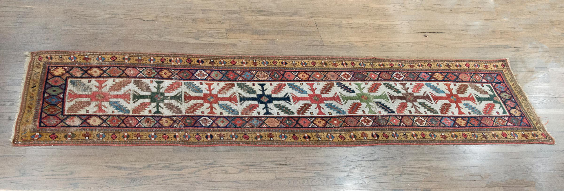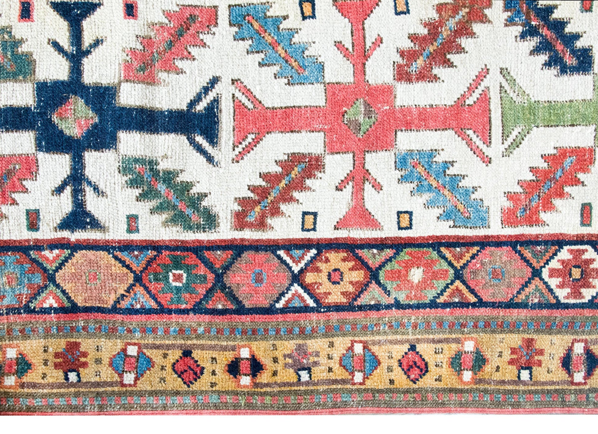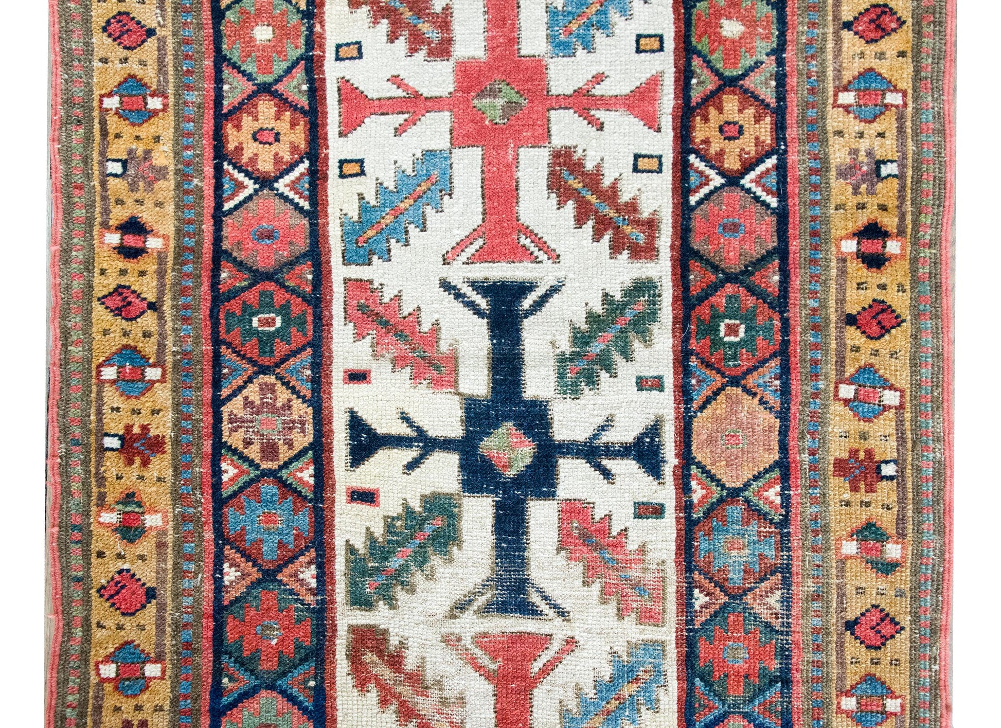 An iconic late 19th-century Kuba runner from Azerbaijan, handwoven in richly dyed wool, with a mesmerizing central field of repeated stylized leaves pointing toward small, floating crosses—each motif slightly varied, like a visual rhythm played out across the length of the rug. The border is distinctly Kuba: narrow, dense, and intricate, filled with petite floral forms and tribal abstractions that feel both ancient and alive. Woven in tones of crimson, deep and pale indigo, green, gold, and white, the palette is vibrant without shouting. Kuba rugs hail from a mountainous region in northeastern Azerbaijan, home to a diverse mix of ethnic groups, many of whom have maintained nomadic or semi-nomadic traditions. Their rugs are prized for their graphic clarity, technical precision, and deeply symbolic patterns—each one a personal expression, passed through generations. This runner, with its balance of geometry and movement, is a masterclass in restraint, rhythm, and cultural memory.