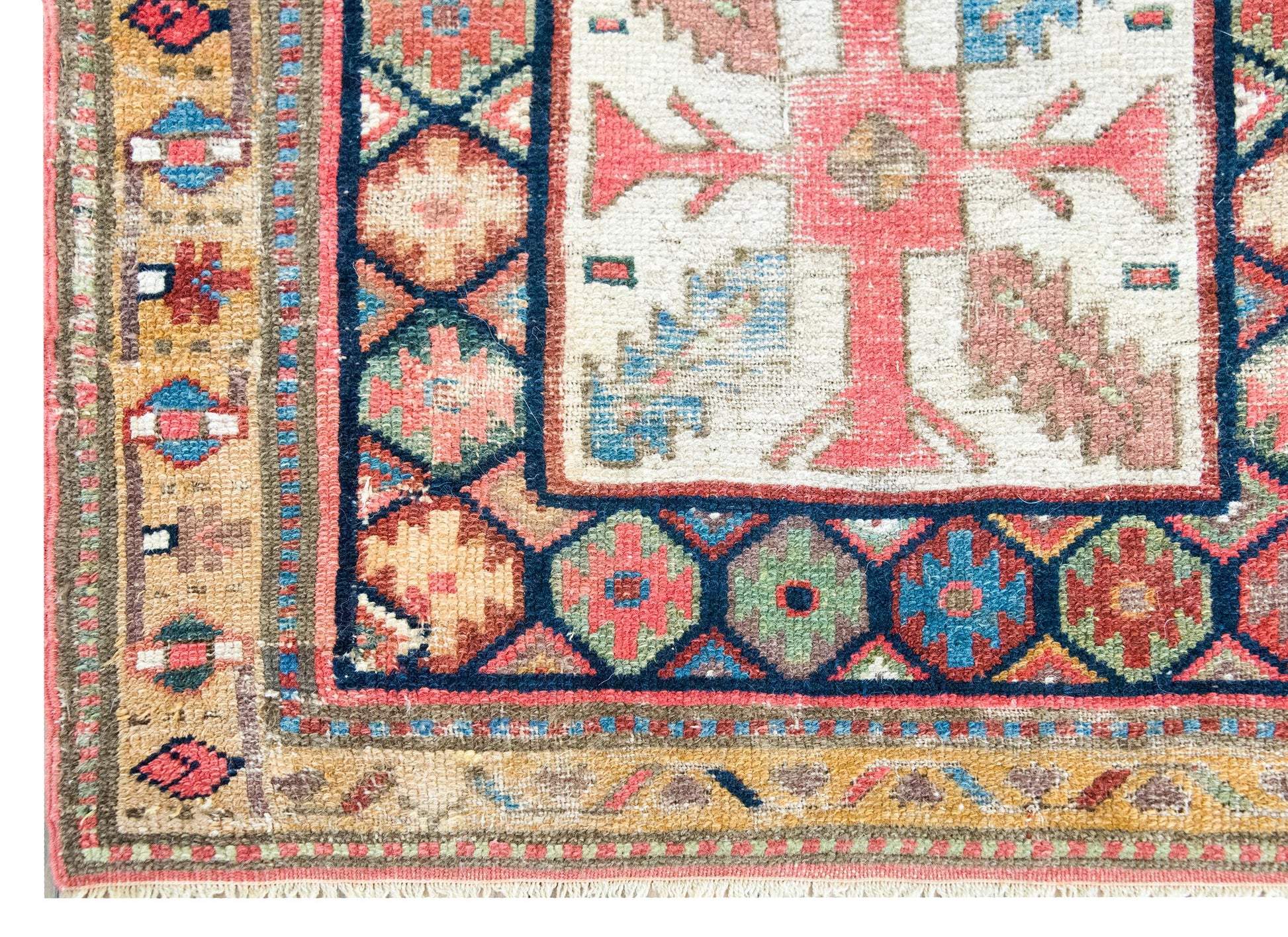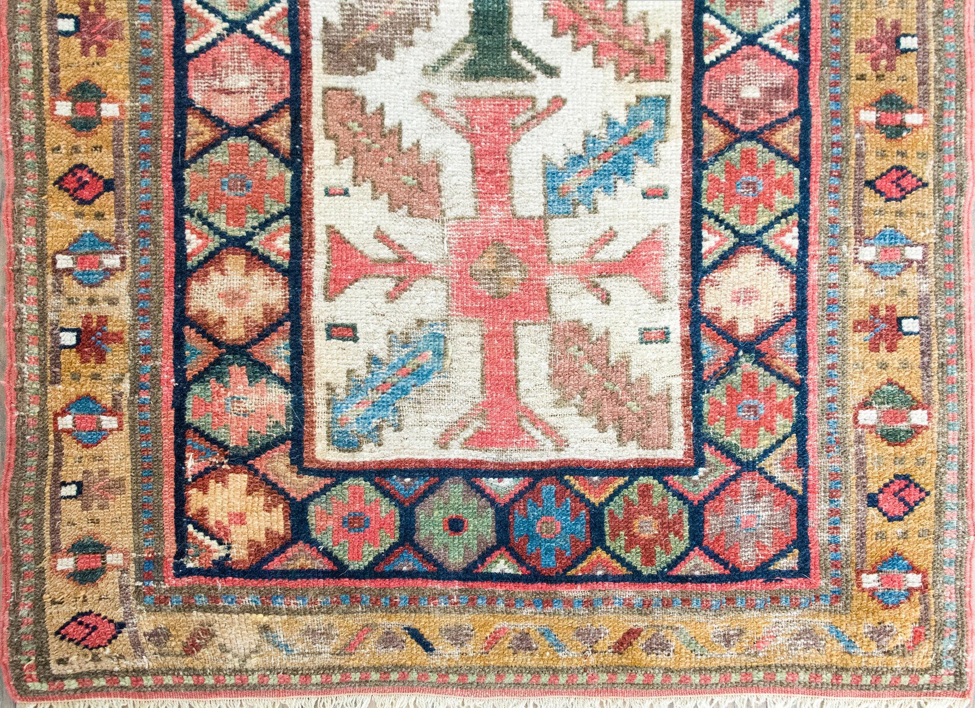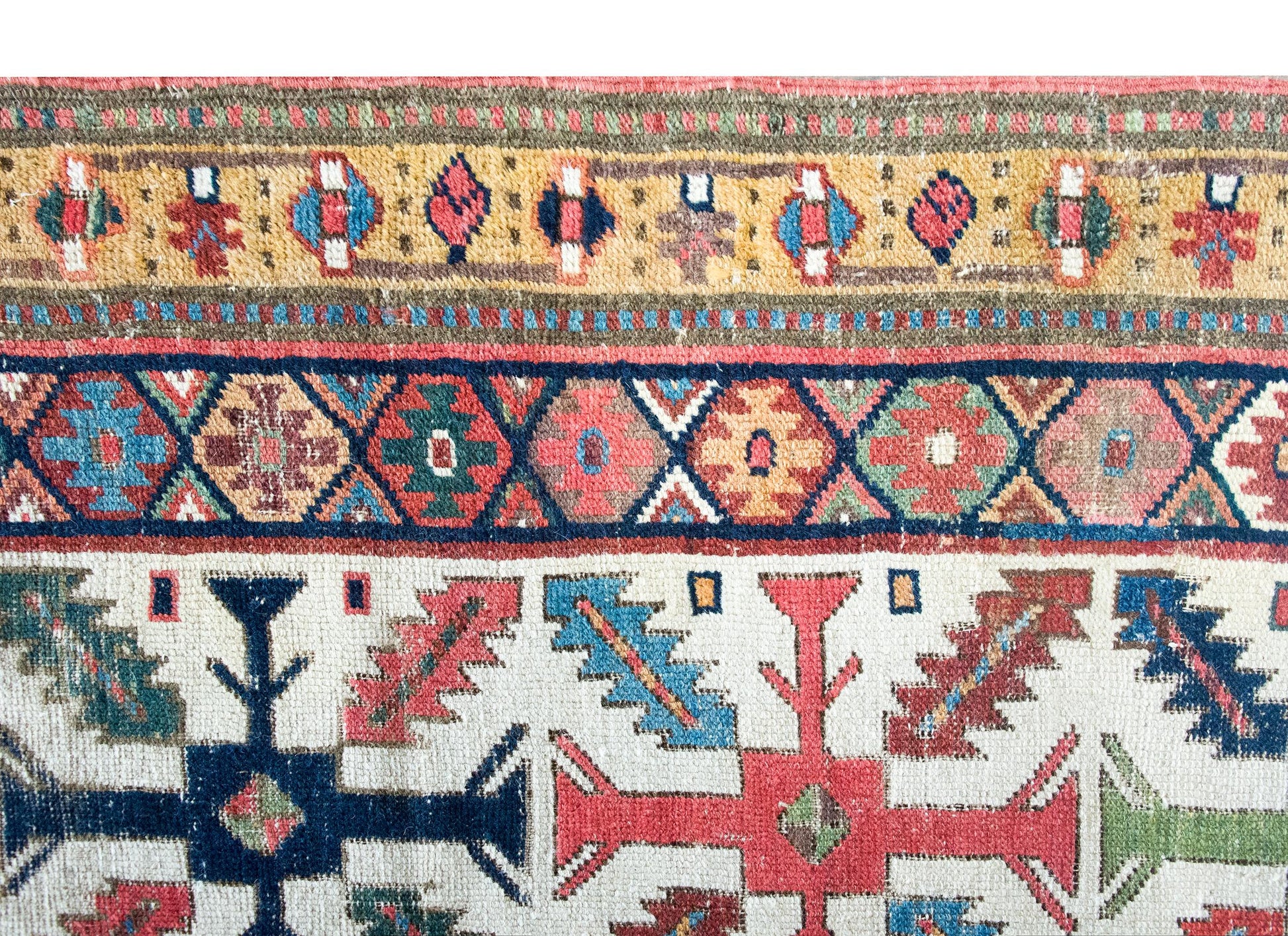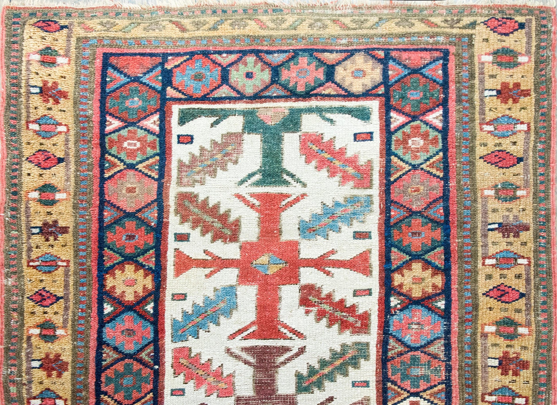 An iconic late 19th-century Kuba runner from Azerbaijan, handwoven in richly dyed wool, with a mesmerizing central field of repeated stylized leaves pointing toward small, floating crosses—each motif slightly varied, like a visual rhythm played out across the length of the rug. The border is distinctly Kuba: narrow, dense, and intricate, filled with petite floral forms and tribal abstractions that feel both ancient and alive. Woven in tones of crimson, deep and pale indigo, green, gold, and white, the palette is vibrant without shouting. Kuba rugs hail from a mountainous region in northeastern Azerbaijan, home to a diverse mix of ethnic groups, many of whom have maintained nomadic or semi-nomadic traditions. Their rugs are prized for their graphic clarity, technical precision, and deeply symbolic patterns—each one a personal expression, passed through generations. This runner, with its balance of geometry and movement, is a masterclass in restraint, rhythm, and cultural memory.