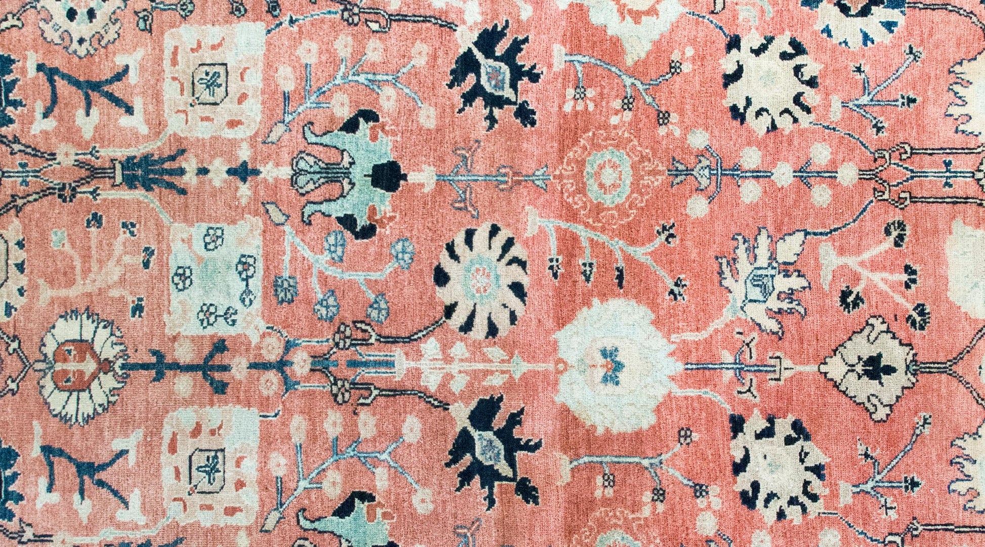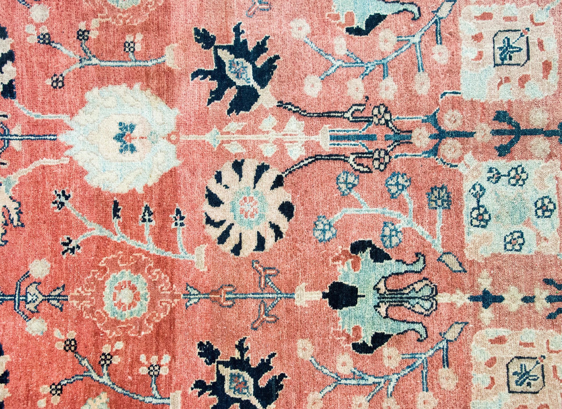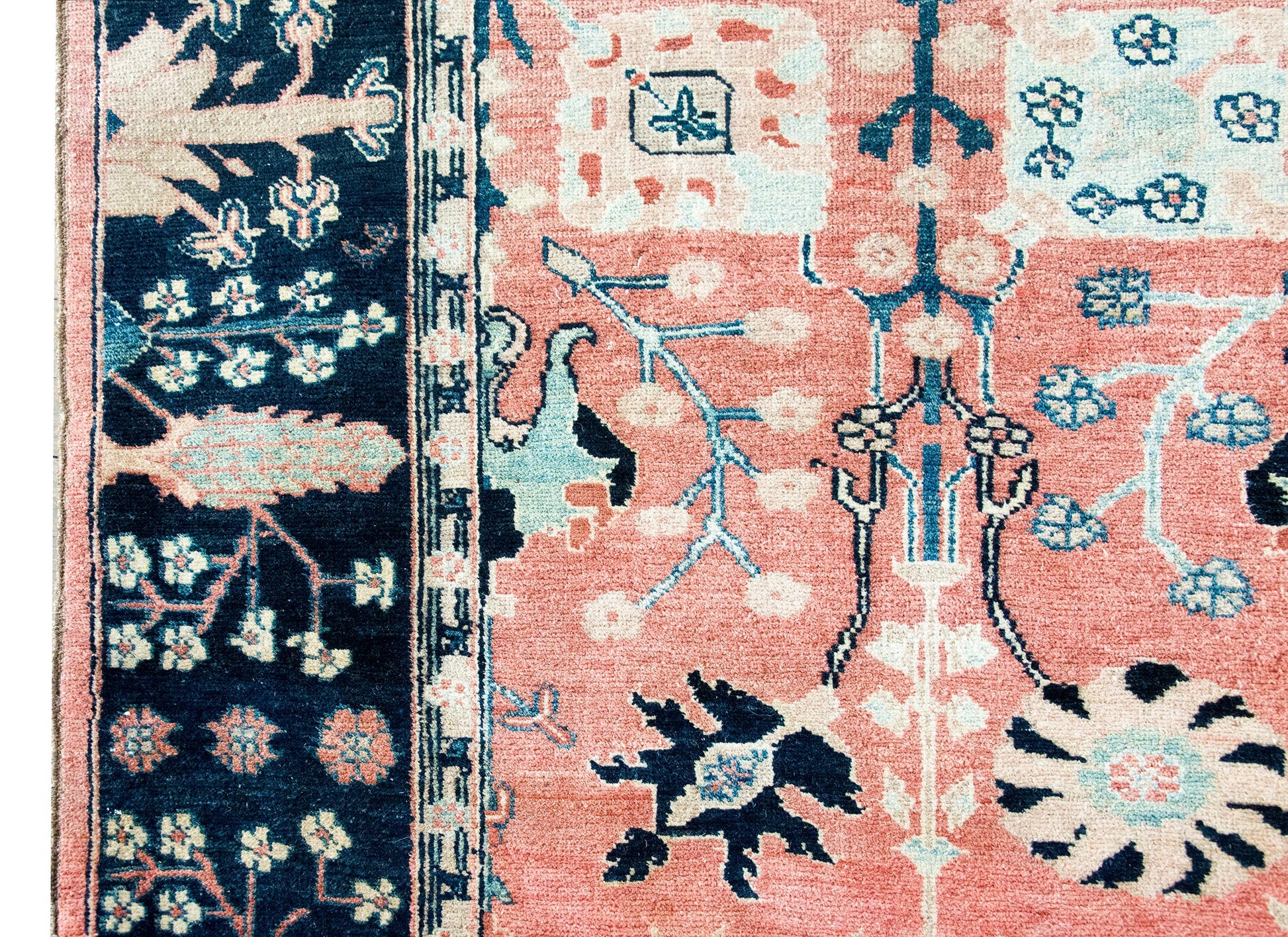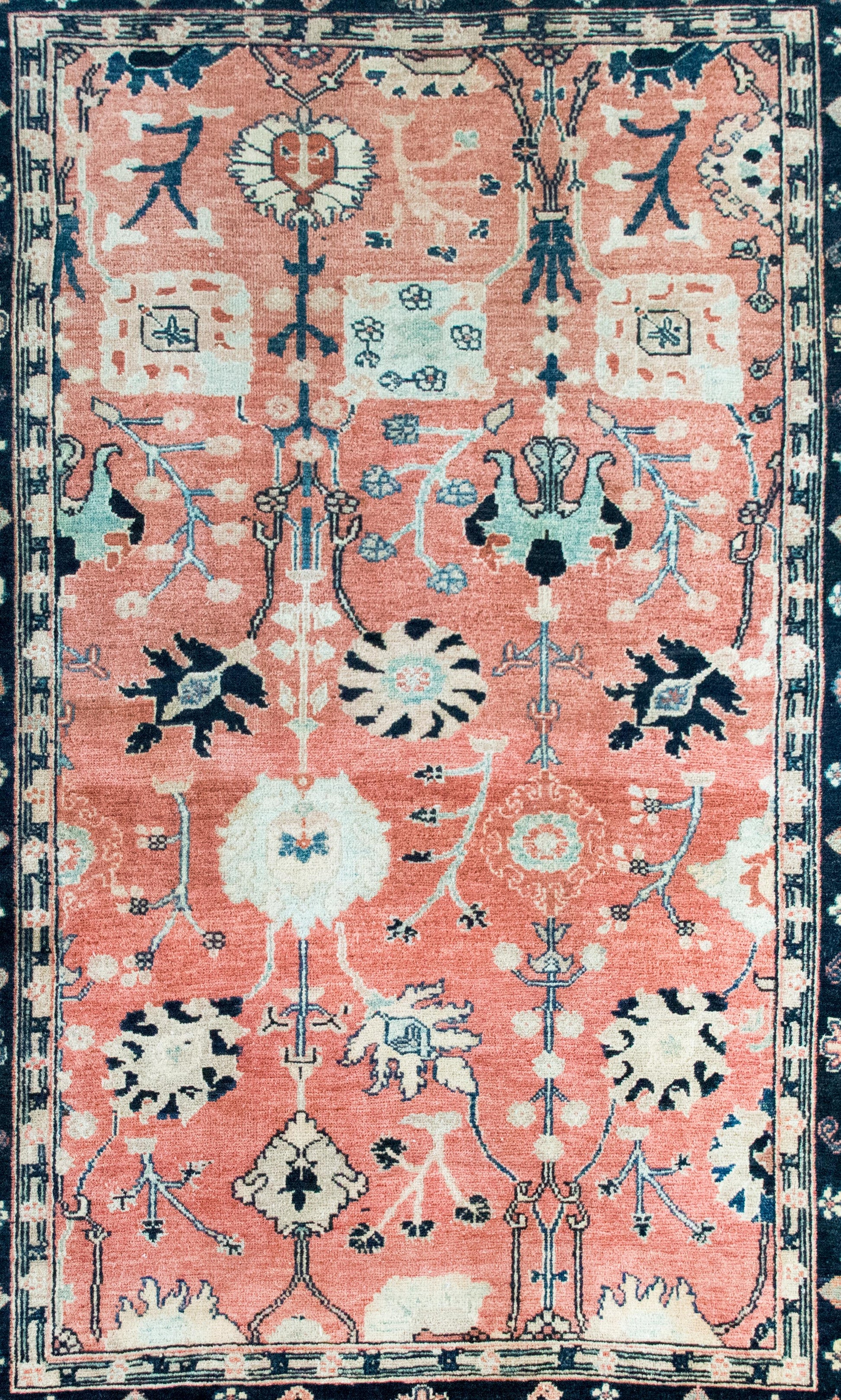 This vintage Indian wool rug, hand-knotted in the late 20th century, draws inspiration from the classic Persian Sarouk Farahan tradition. An asymmetrical arrangement of large-scale flowers and scrolling vines stretches across a pale salmon field, rendered in a muted palette of beige, black, and light indigo. The wide black border, filled with more florals and tendrils, creates a striking frame—rich yet restrained. Though woven in India, its soul is unmistakably Persian. For centuries, the artistry of Persian rug weaving—its fluid botanical motifs, intricate symmetry, and saturated dyes—has shaped weaving traditions across the globe. In India, the influence took hold in the Mughal era and evolved into a robust industry of master weavers interpreting these age-old designs with regional nuance. This rug is a beautiful continuation of that legacy—faithful to the elegance of its source, but softened through a distinctly Indian hand and an eye for gentle color.