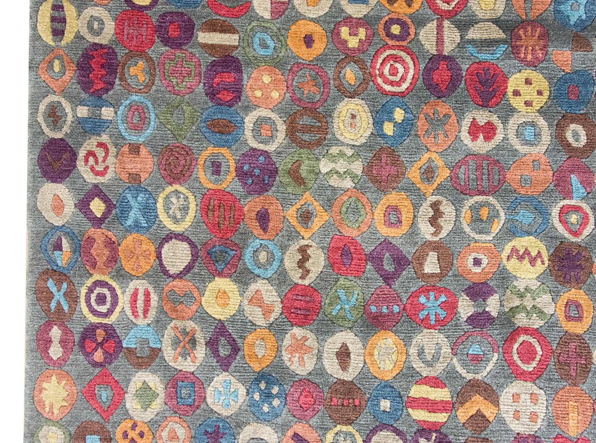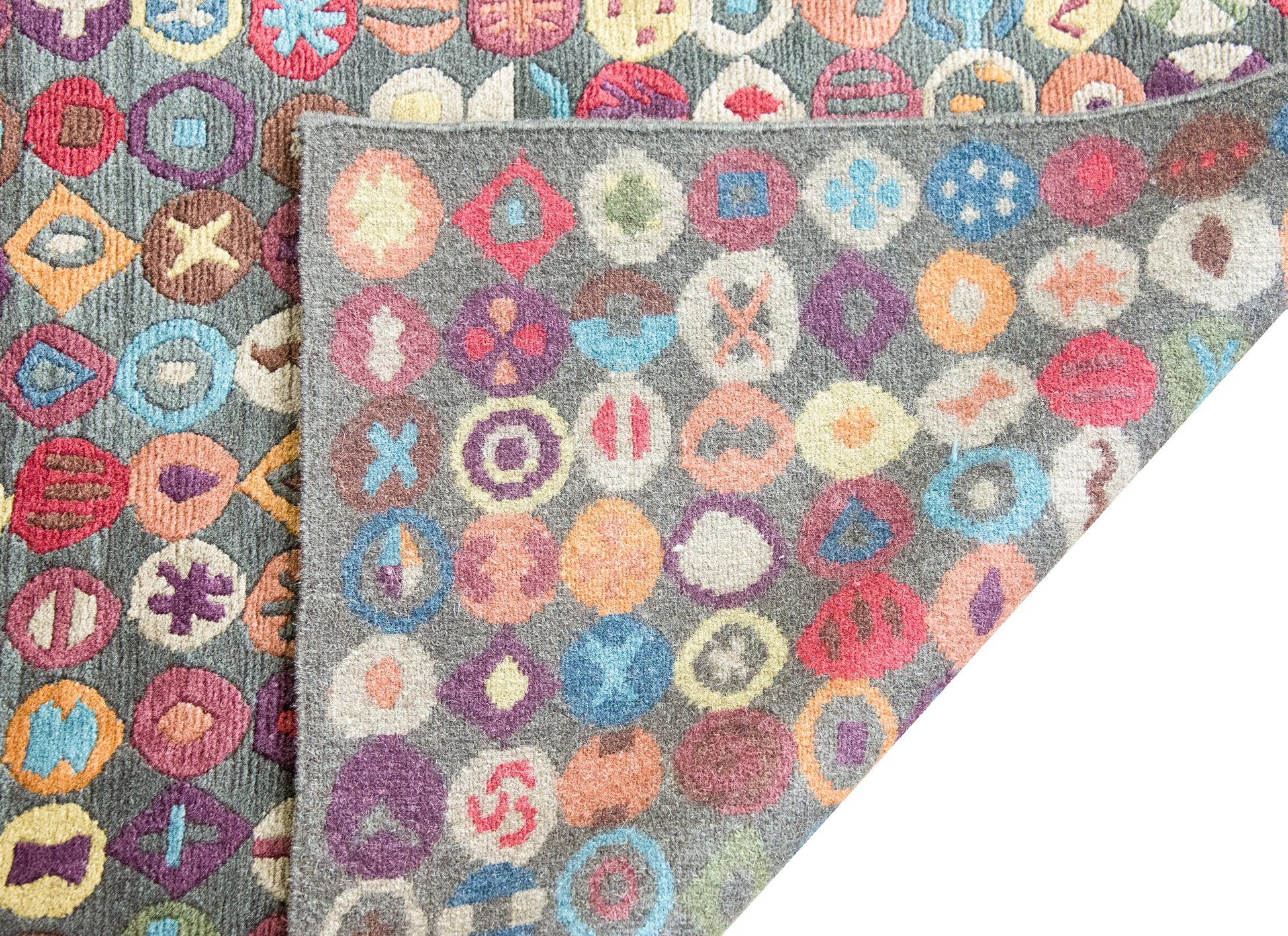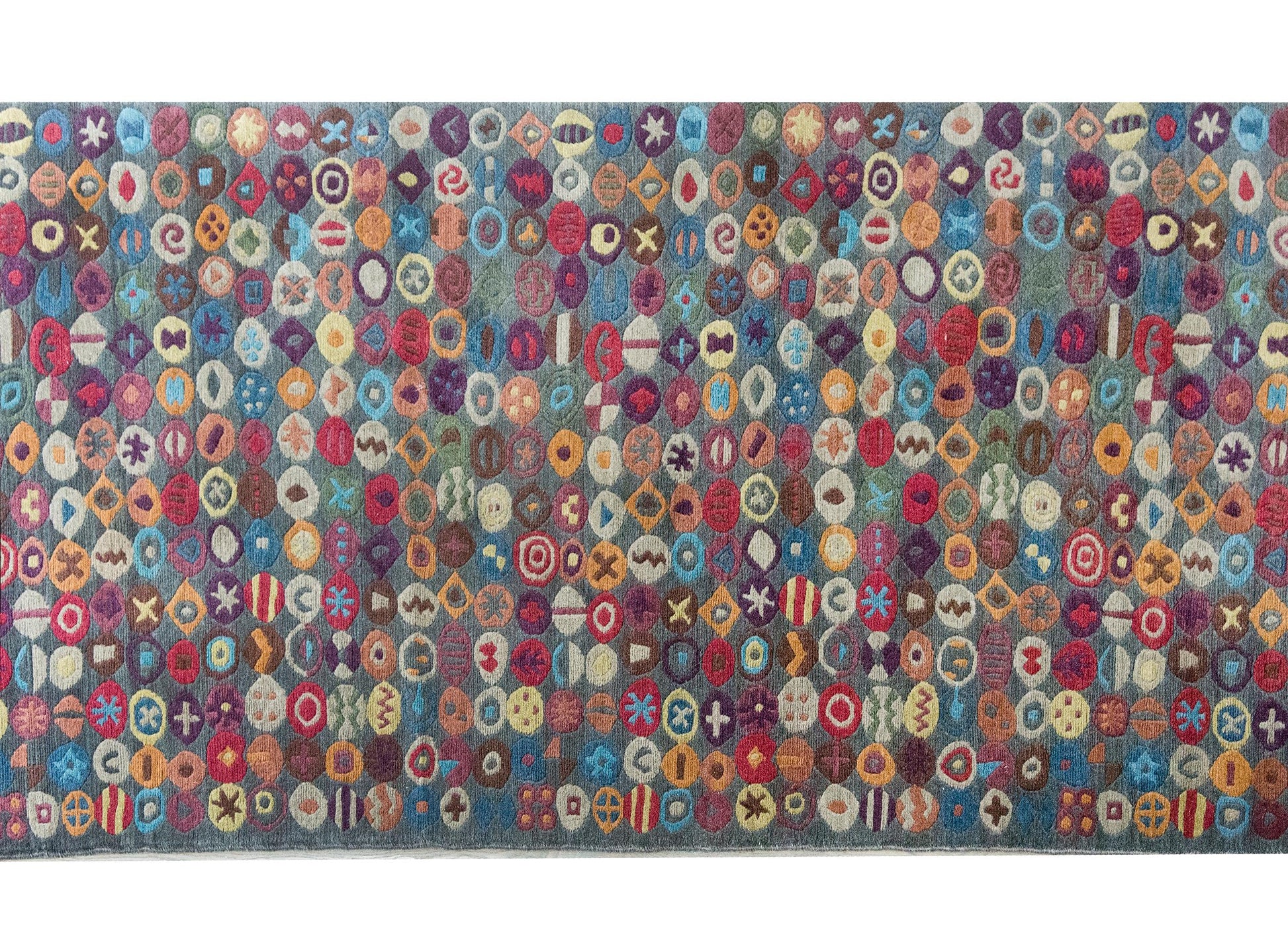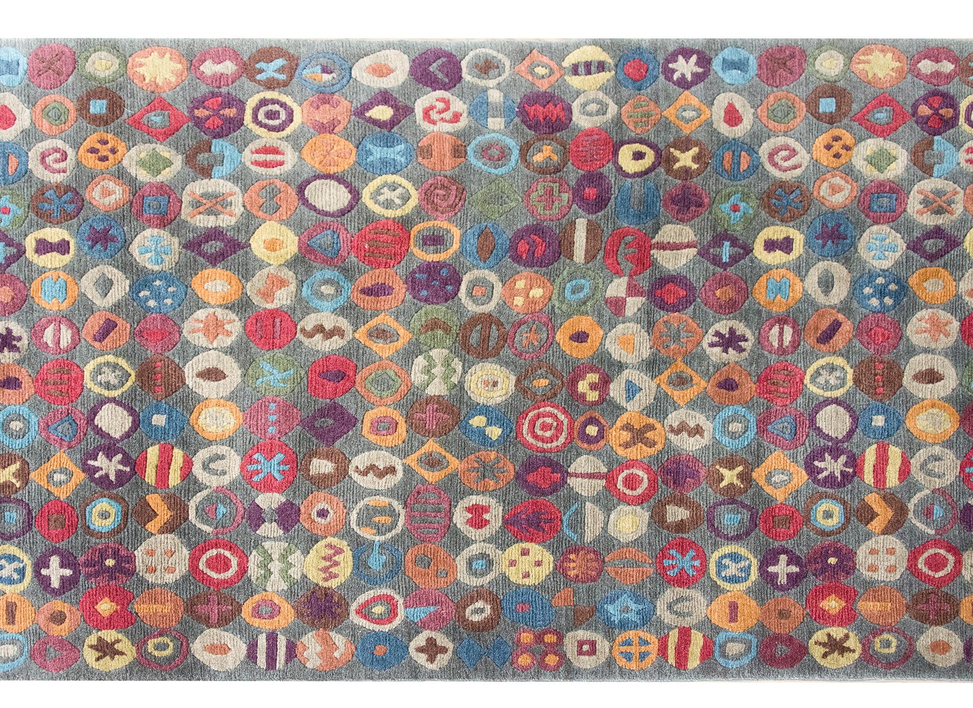 This late 20th-century Tibetan hand-knotted wool runner is a stunning celebration of vibrant color and intricate design. Woven with hundreds of small circular details reminiscent of ancient runes, the pattern offers a unique interplay of cultural inspiration and modern artistry. Each circular motif is meticulously rendered, creating a rhythmic, almost meditative quality to the design.