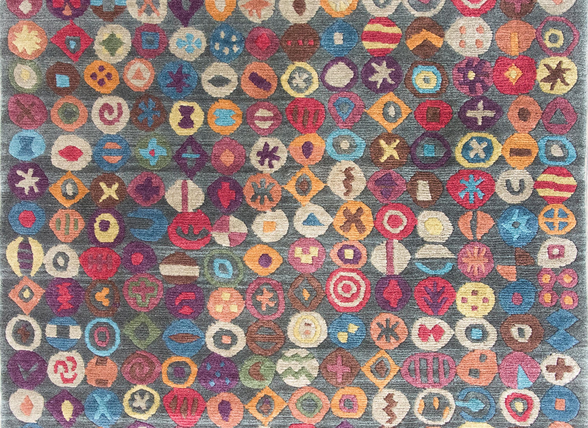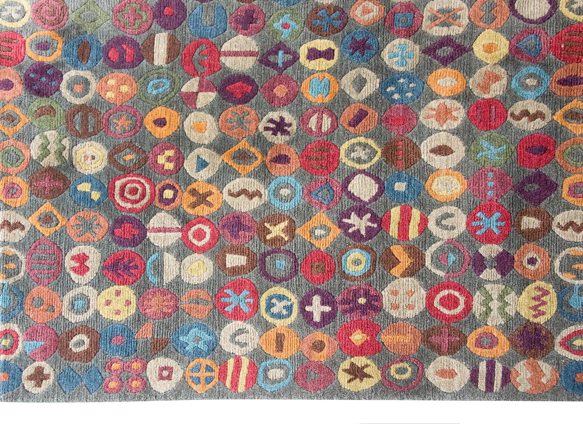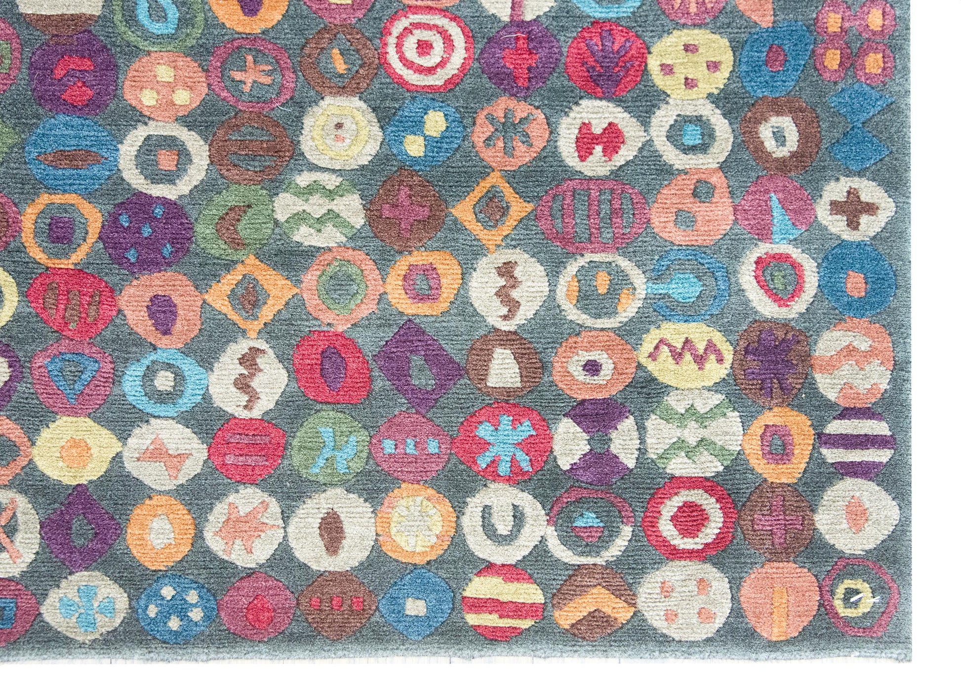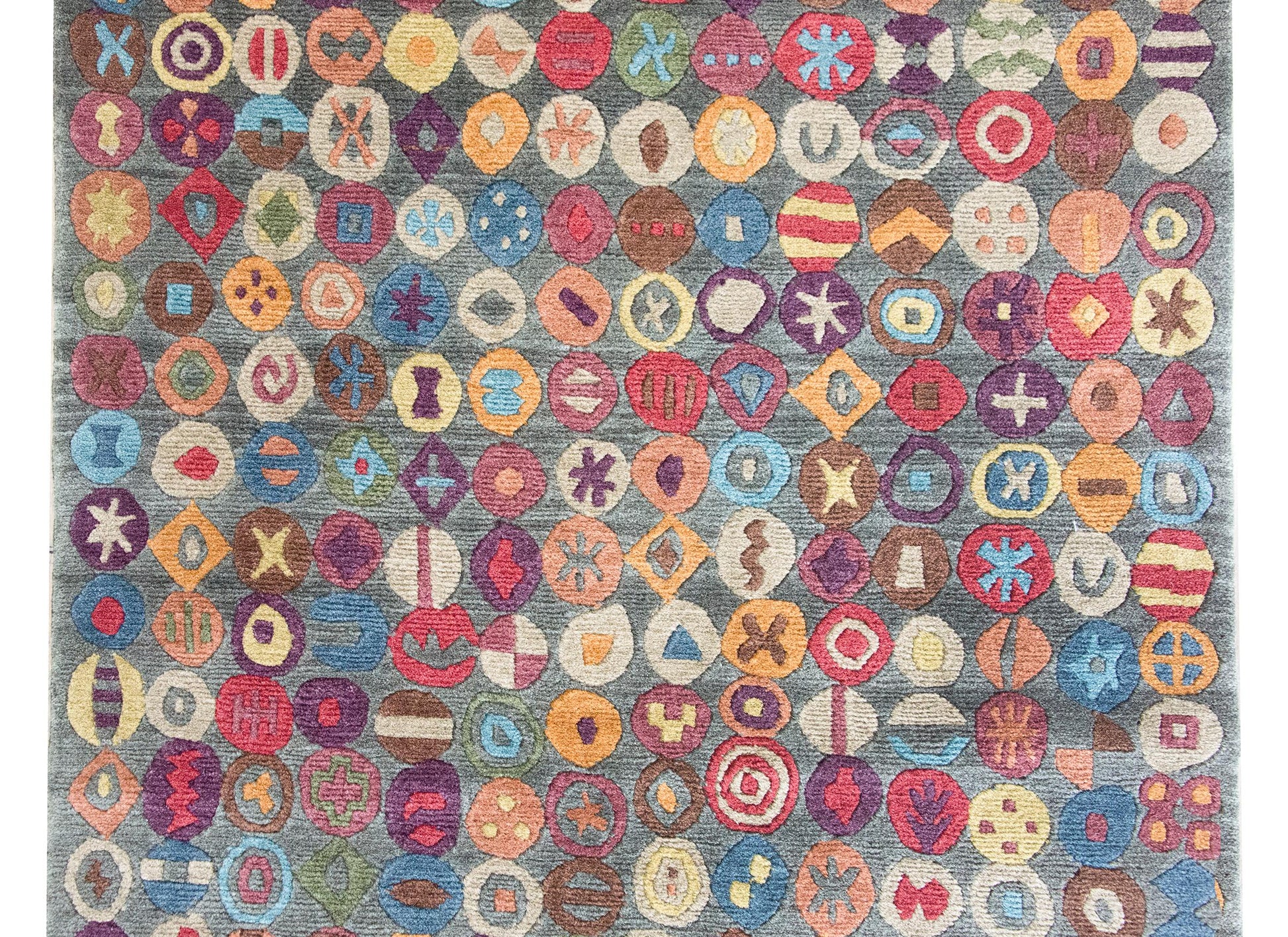 This late 20th-century Tibetan hand-knotted wool runner is a stunning celebration of vibrant color and intricate design. Woven with hundreds of small circular details reminiscent of ancient runes, the pattern offers a unique interplay of cultural inspiration and modern artistry. Each circular motif is meticulously rendered, creating a rhythmic, almost meditative quality to the design.