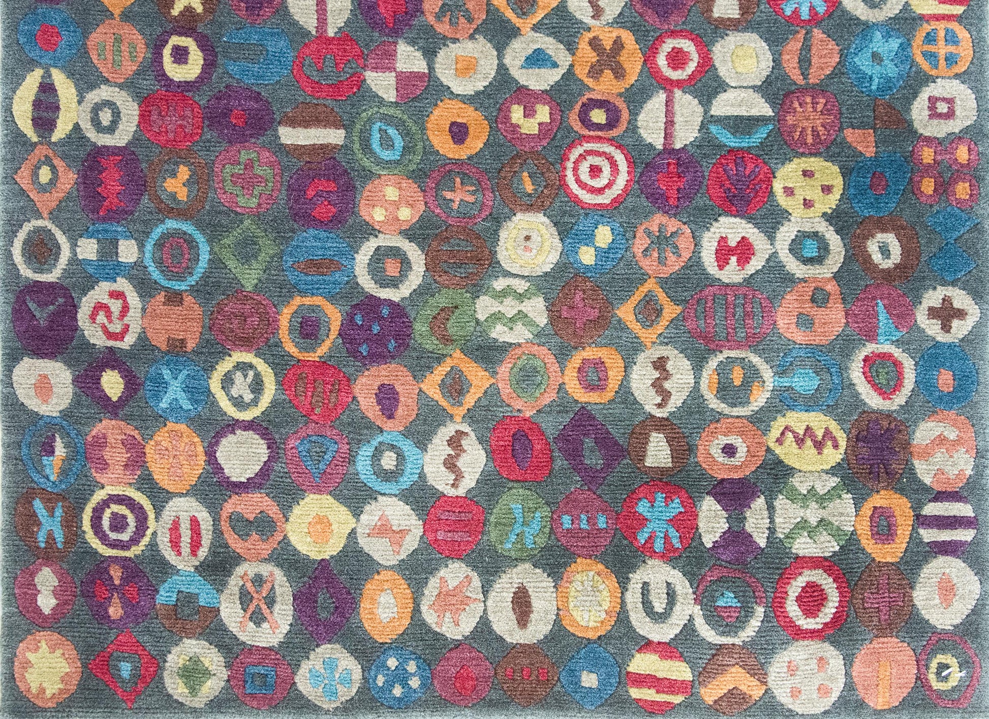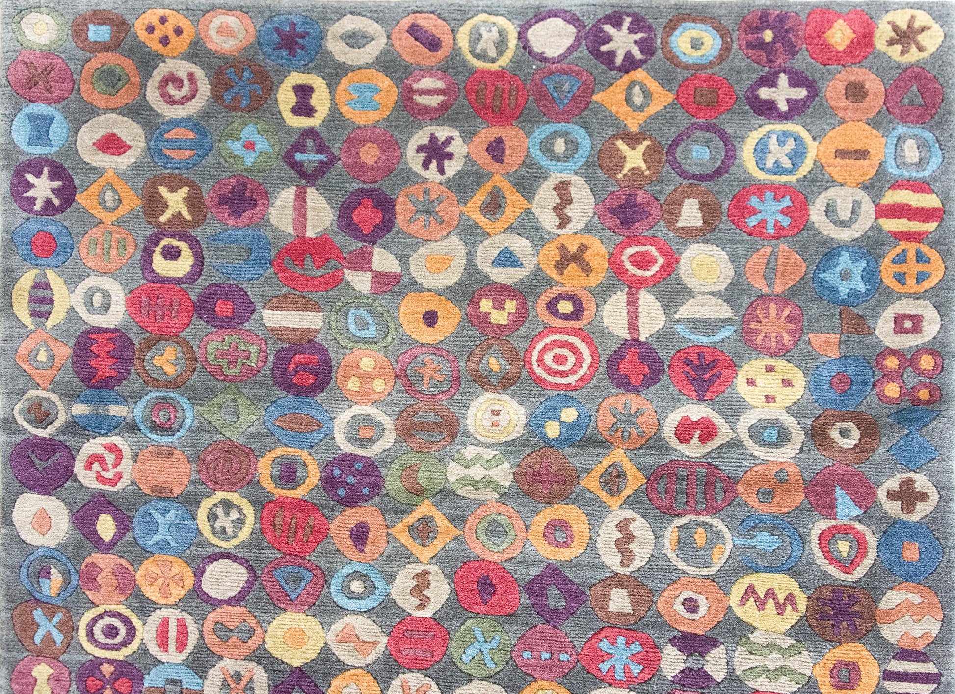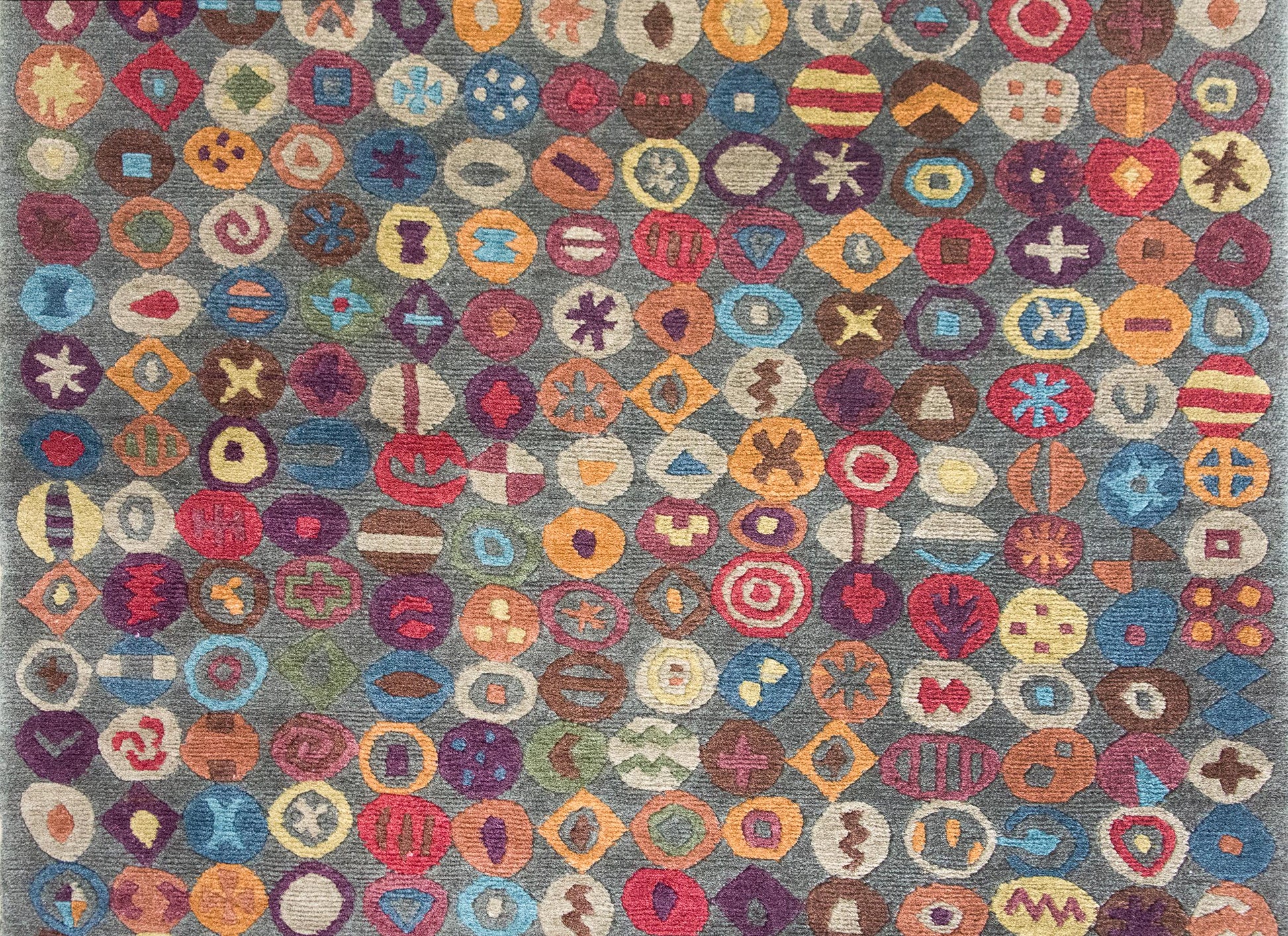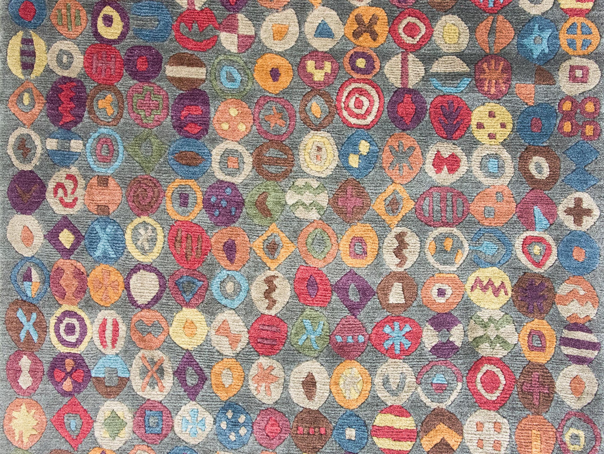 This late 20th-century Tibetan hand-knotted wool runner is a stunning celebration of vibrant color and intricate design. Woven with hundreds of small circular details reminiscent of ancient runes, the pattern offers a unique interplay of cultural inspiration and modern artistry. Each circular motif is meticulously rendered, creating a rhythmic, almost meditative quality to the design.