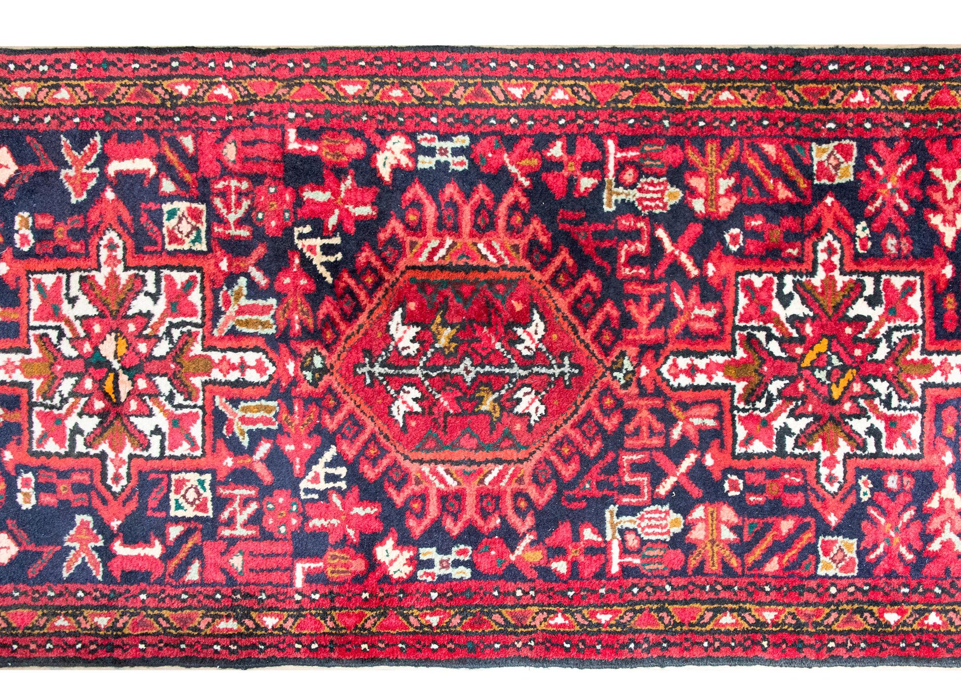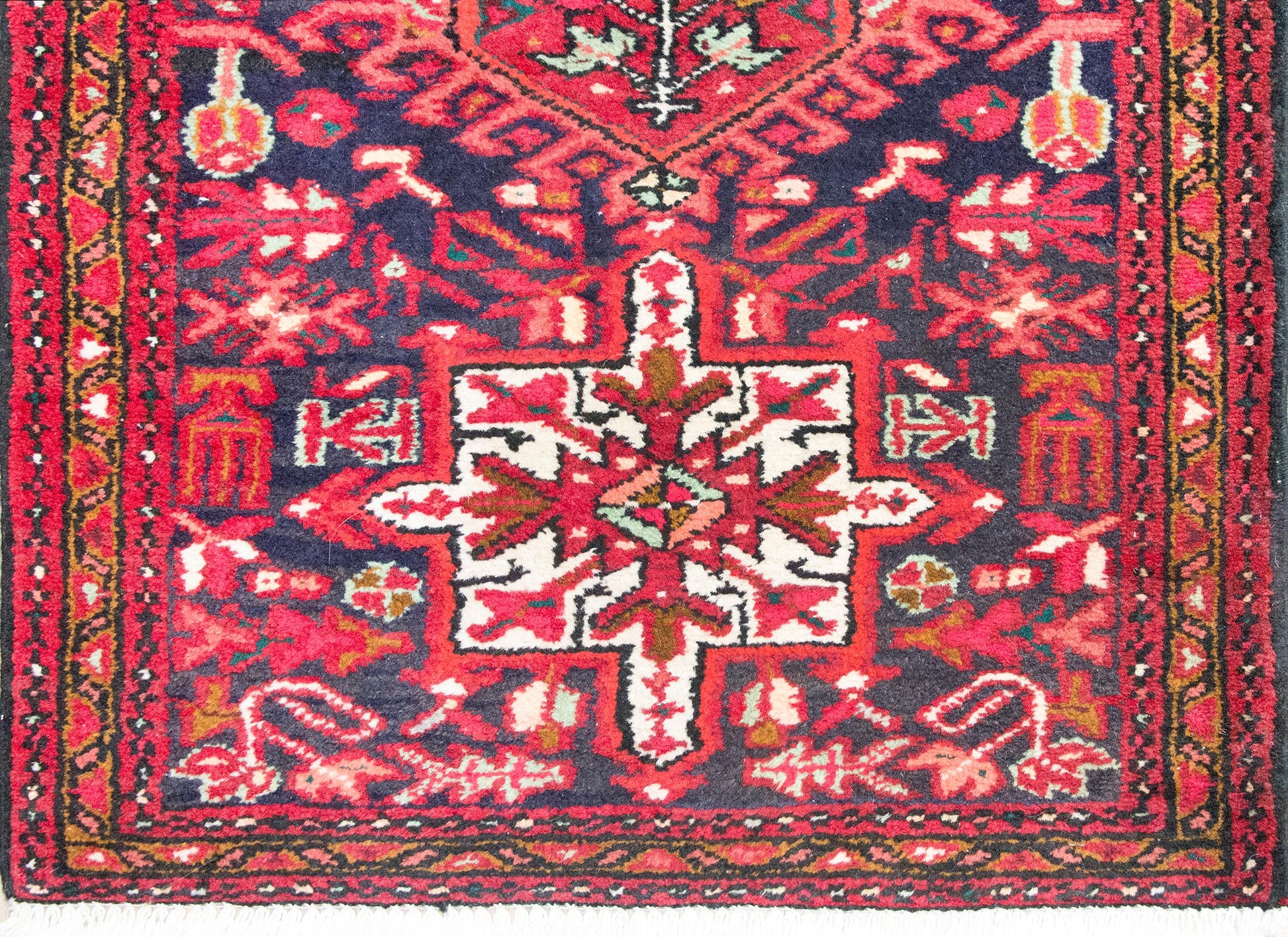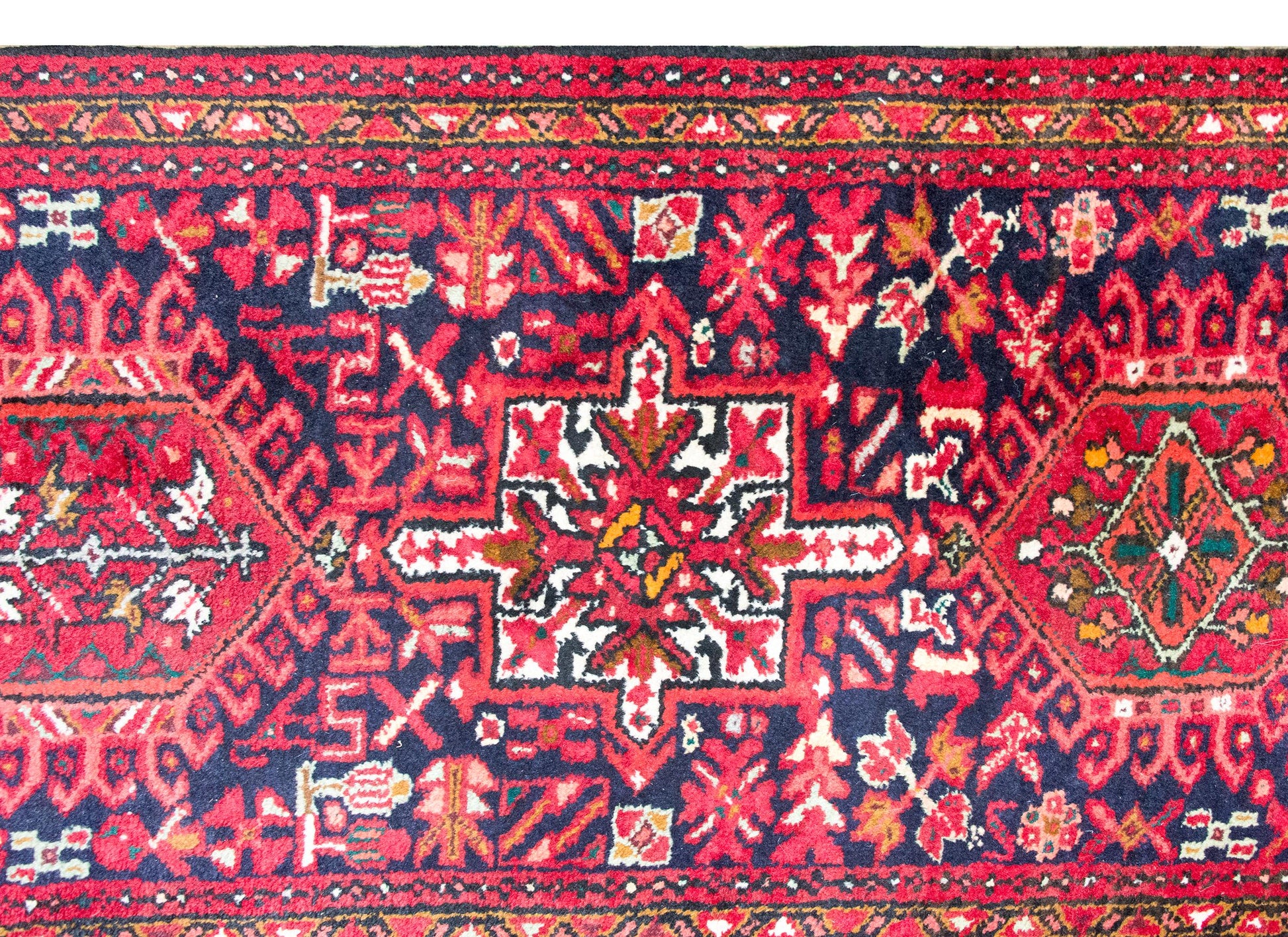 A beautiful early 20th century Persian Heriz runner with multiple stylized floral medallion running the length of the runner, living amidst a field of more stylized flowers and leaves, and surrounded by a simple thin border with petite geometric patterned stripes, and all woven in varying shades of crimson, indigo, gold, white, and green colored wool.