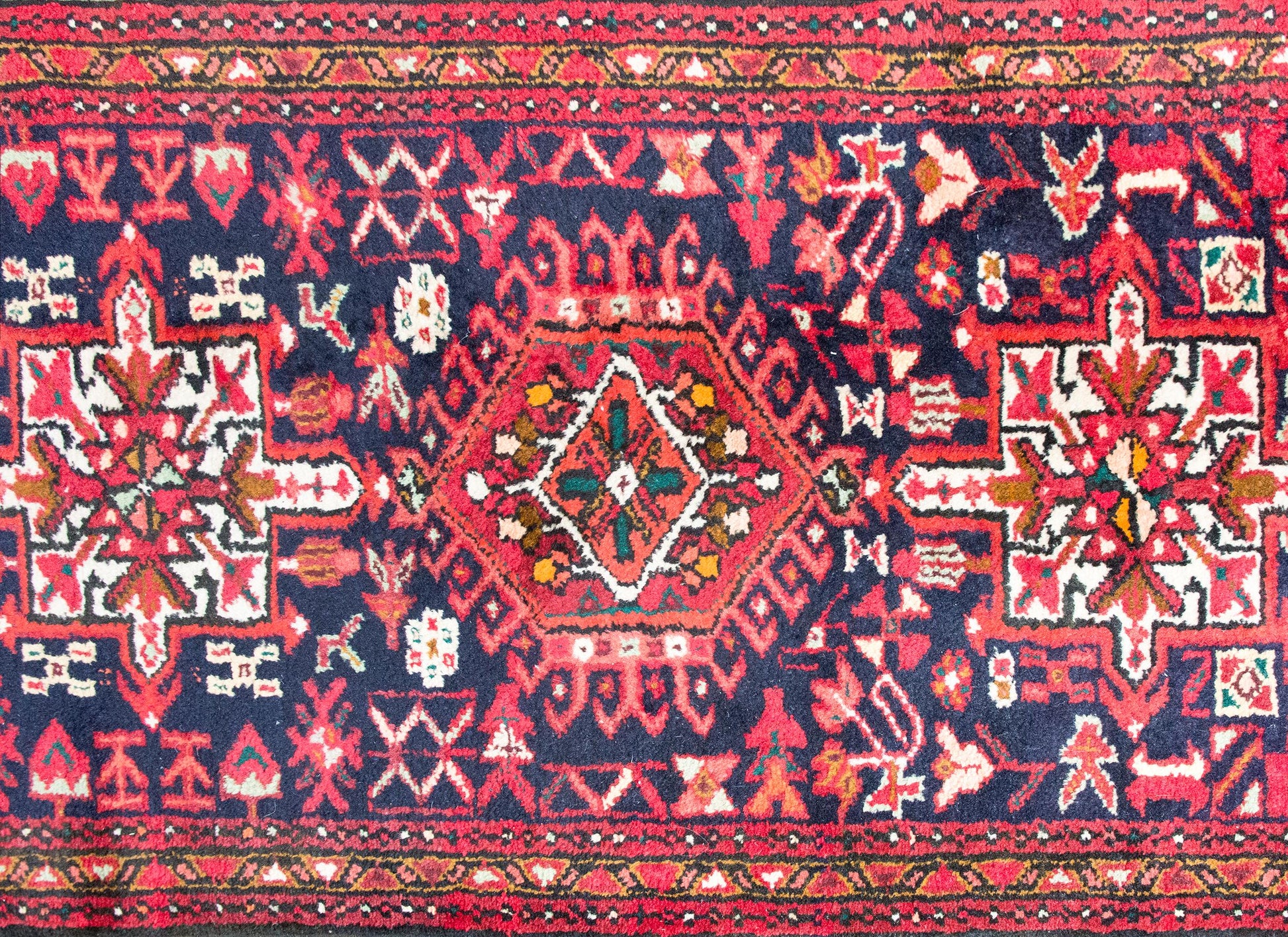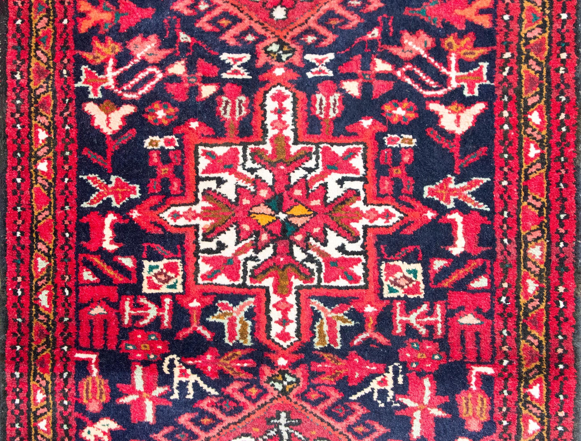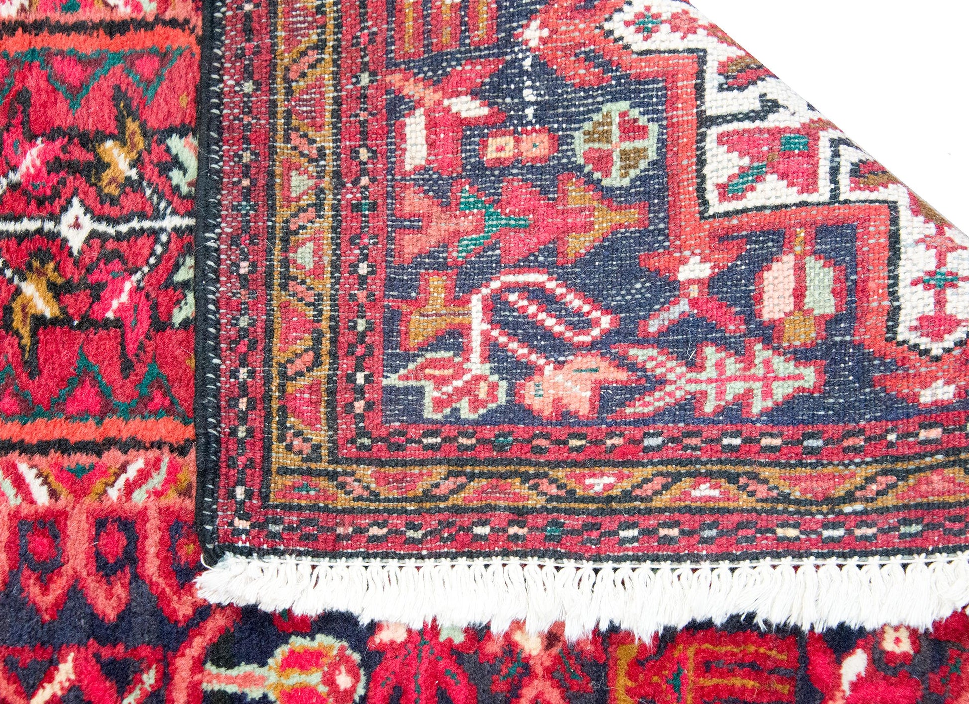 A beautiful early 20th century Persian Heriz runner with multiple stylized floral medallion running the length of the runner, living amidst a field of more stylized flowers and leaves, and surrounded by a simple thin border with petite geometric patterned stripes, and all woven in varying shades of crimson, indigo, gold, white, and green colored wool.