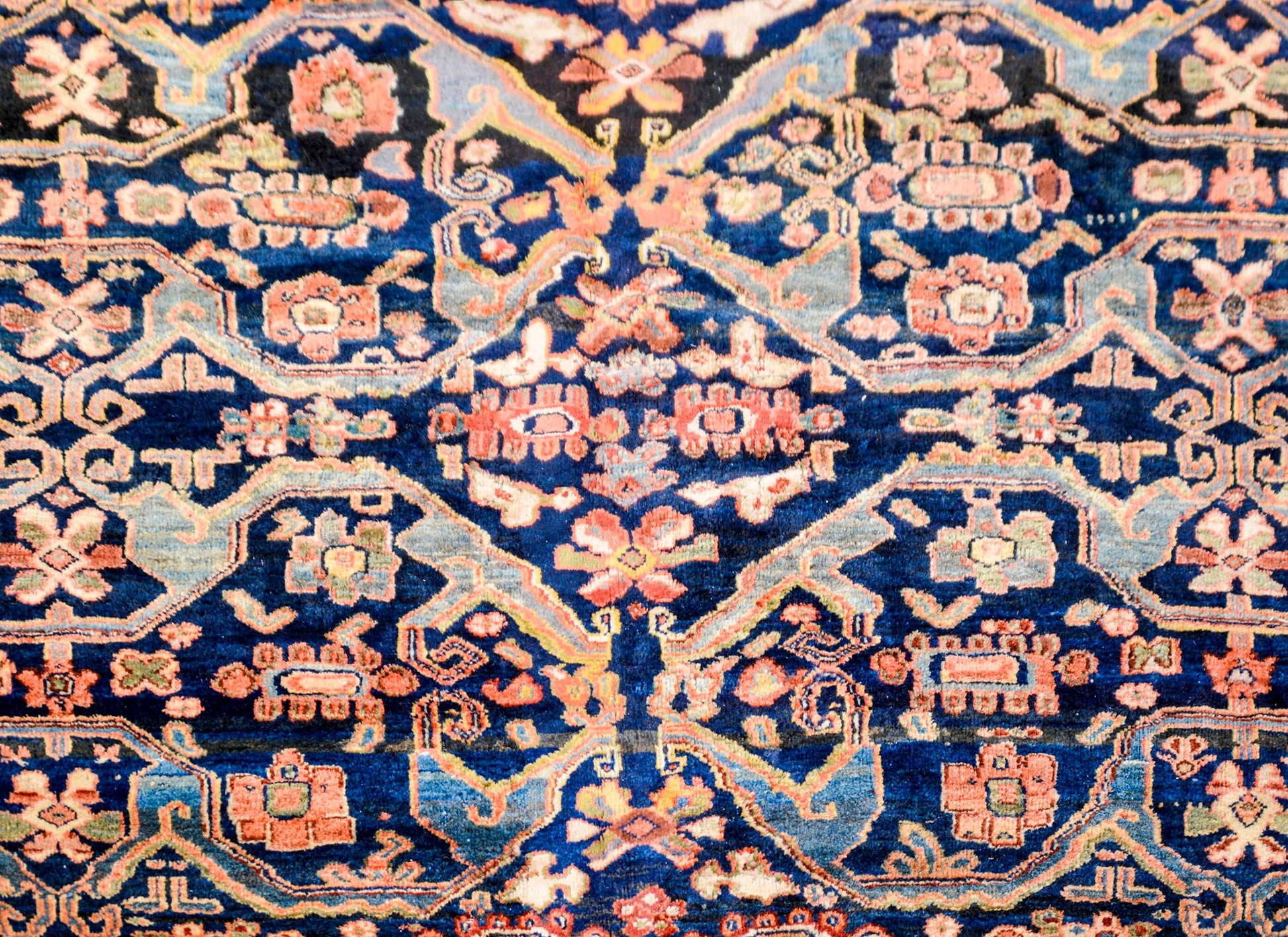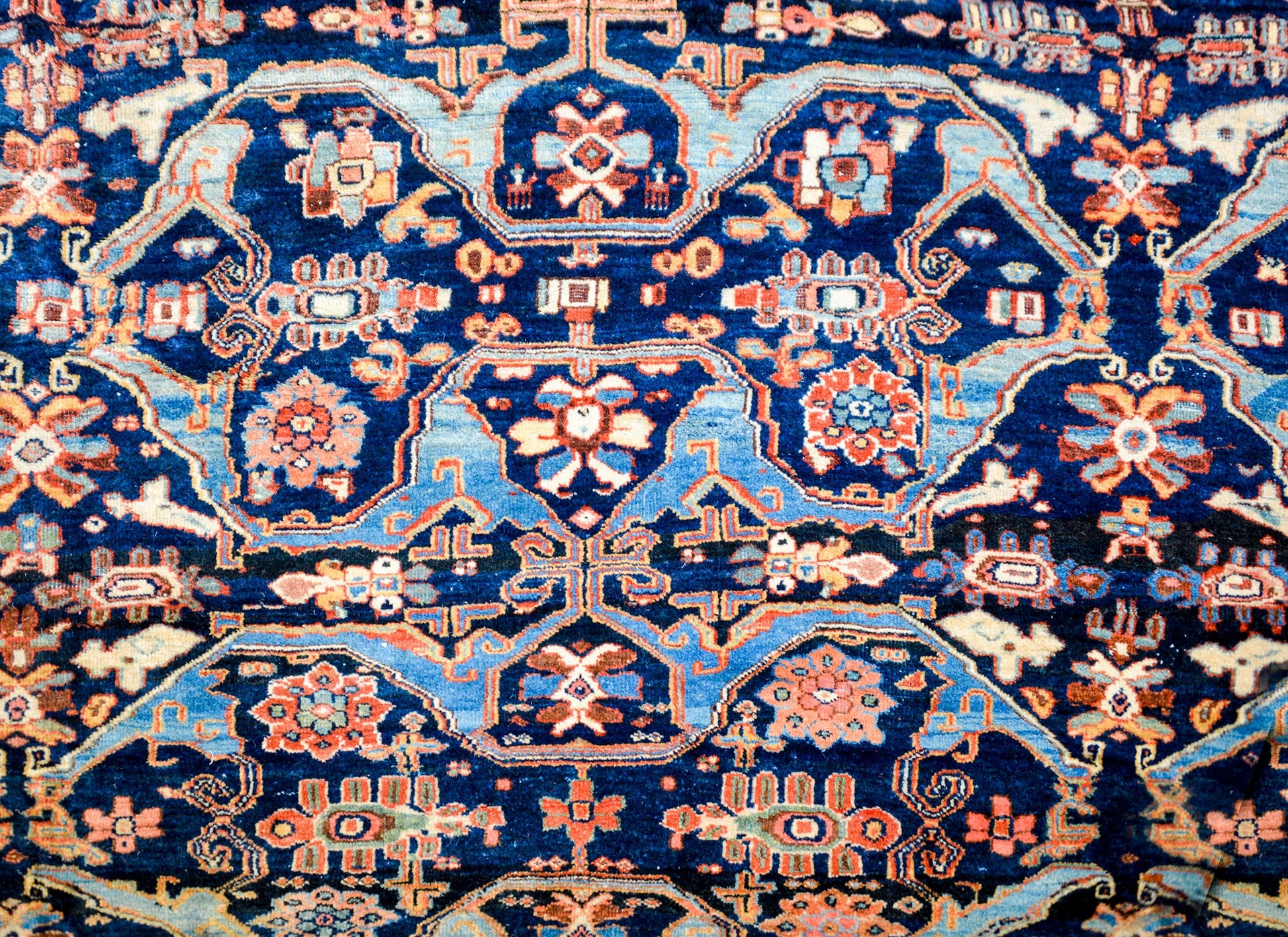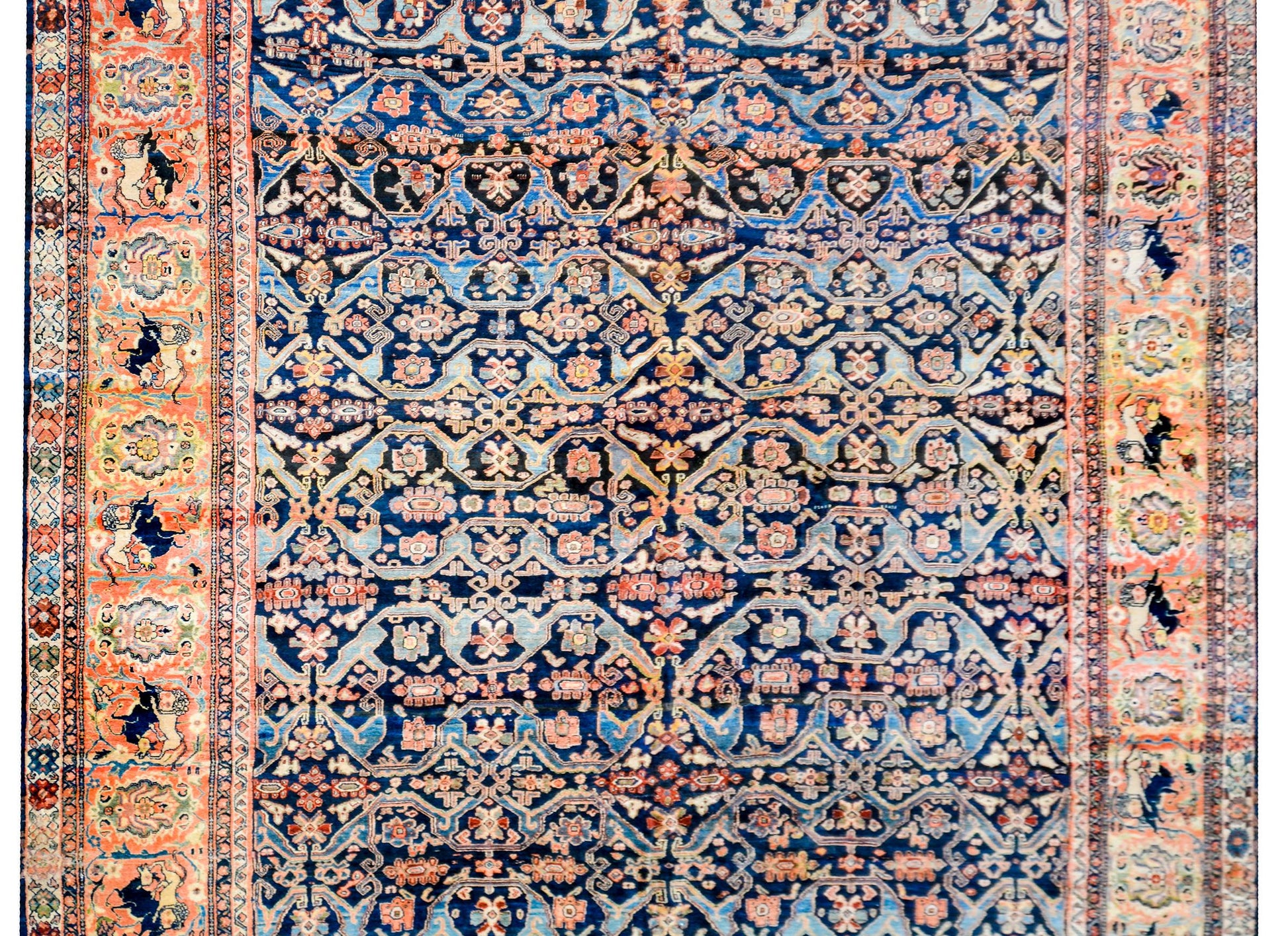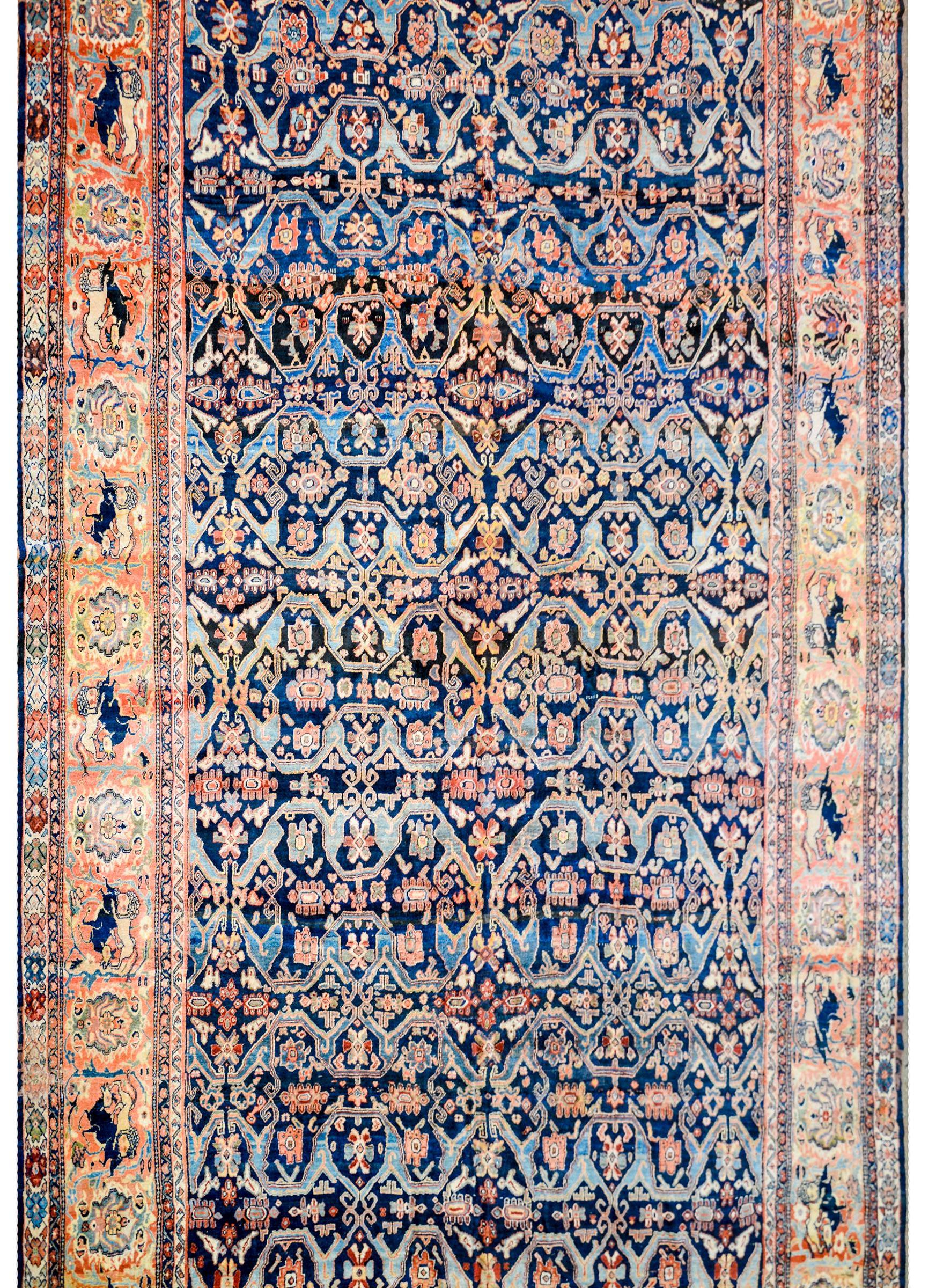 An unbelievable early 20th century Persian Sultanabad rug with a fantastic tribal pattern with a densely woven field of stylized flowers with a lacy trellis pattern woven with an abrash indigo color. The border is fantastic with a wide stripe containing alternating large-scale flowers and lions attacking deer, on a coral colored background, flanked by three matching pairs of petite floral patterned stripes.