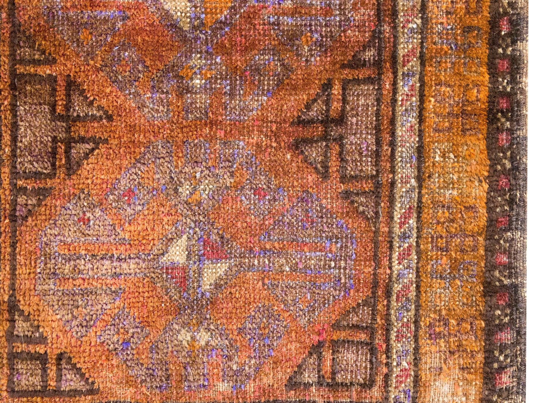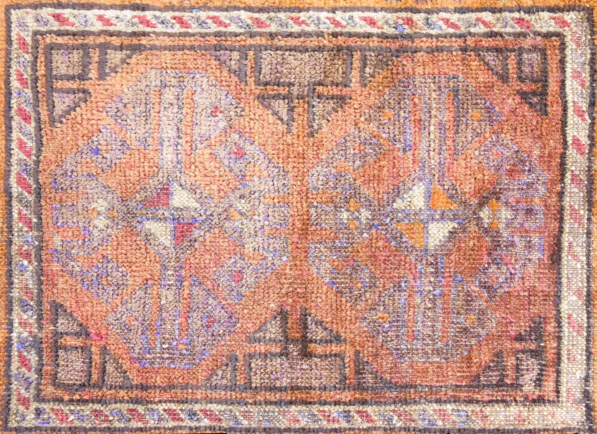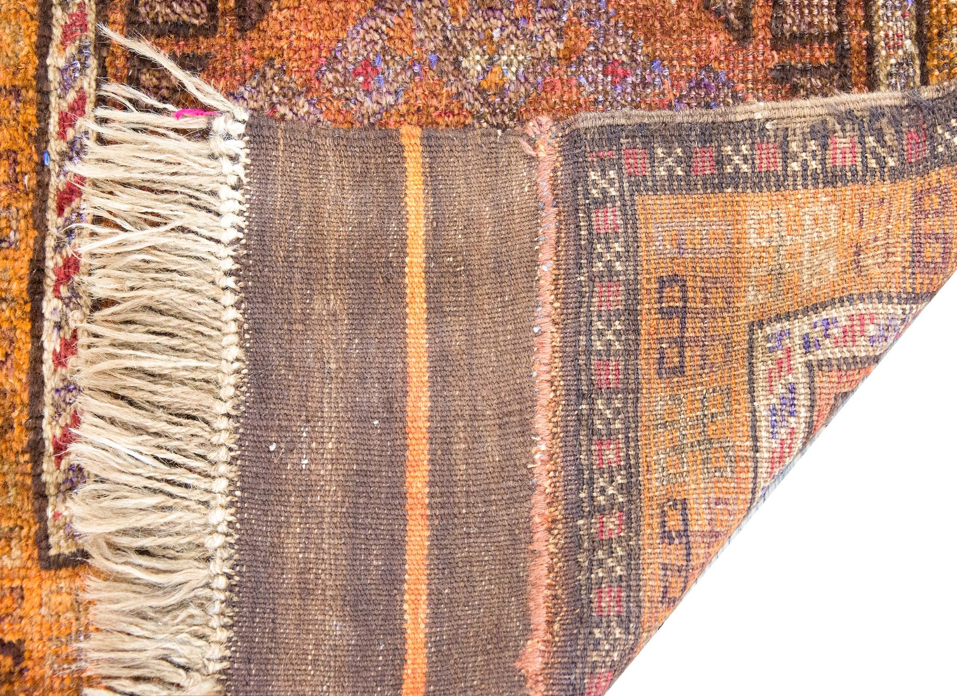 A simple but sophisticated vintage Persian Afghani Baluch rug with two large octagonal floral medallions in the center, surrounded by a simple border with three disc tin geometric floral patterned stripes, flanked with kilim woven ends, and all woven in natural browns, oranges, creams, crimsons, and white wools.