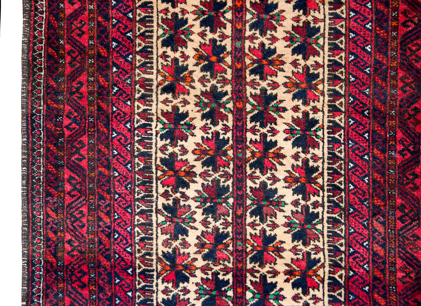 A beautiful mid-20th century Persian Baluch rug with a central stylized floral field surrounded by several petite geometric patterned stripes, and all woven in brilliant crimson, indigo, cream, green, and orange wool.