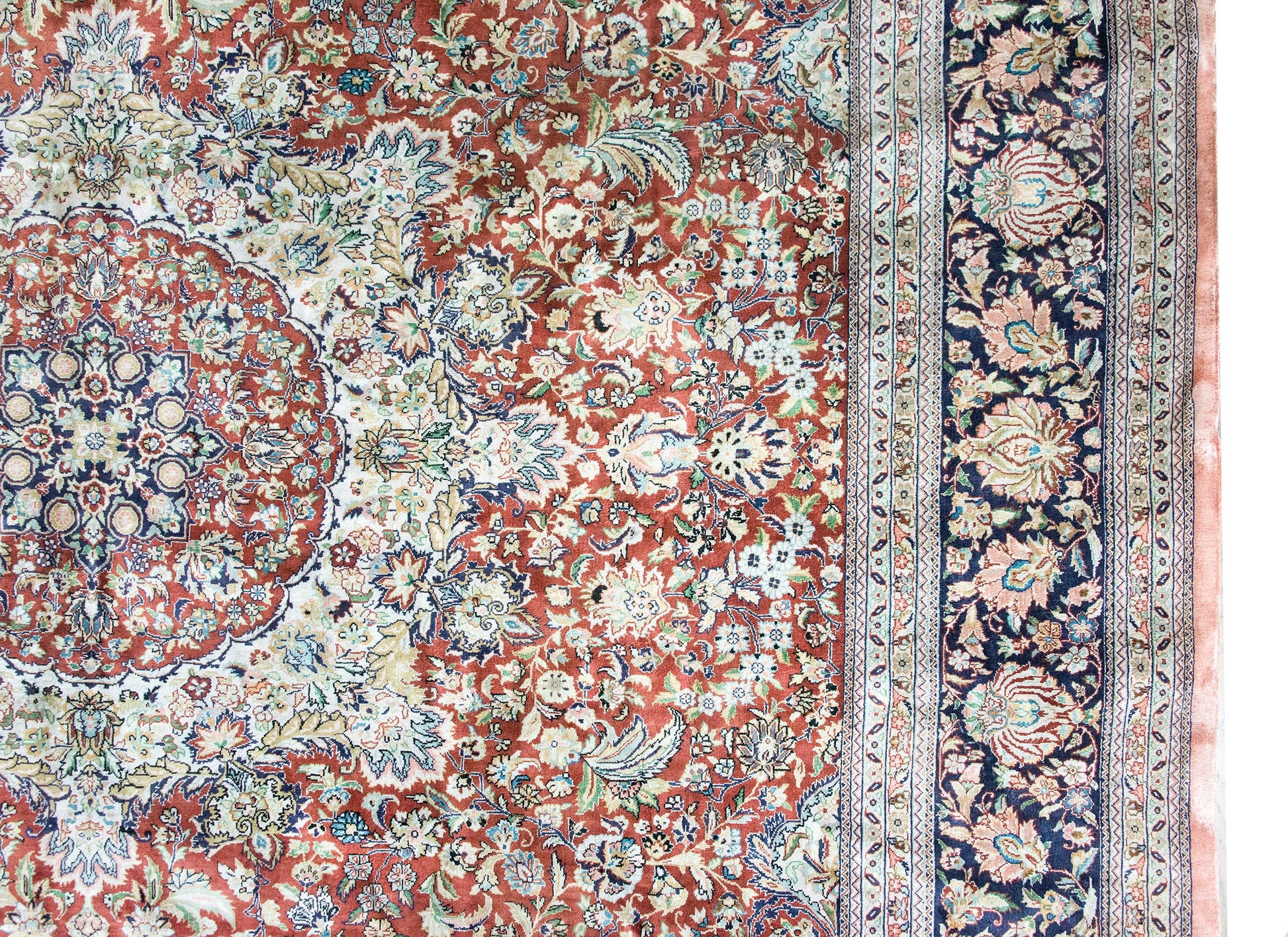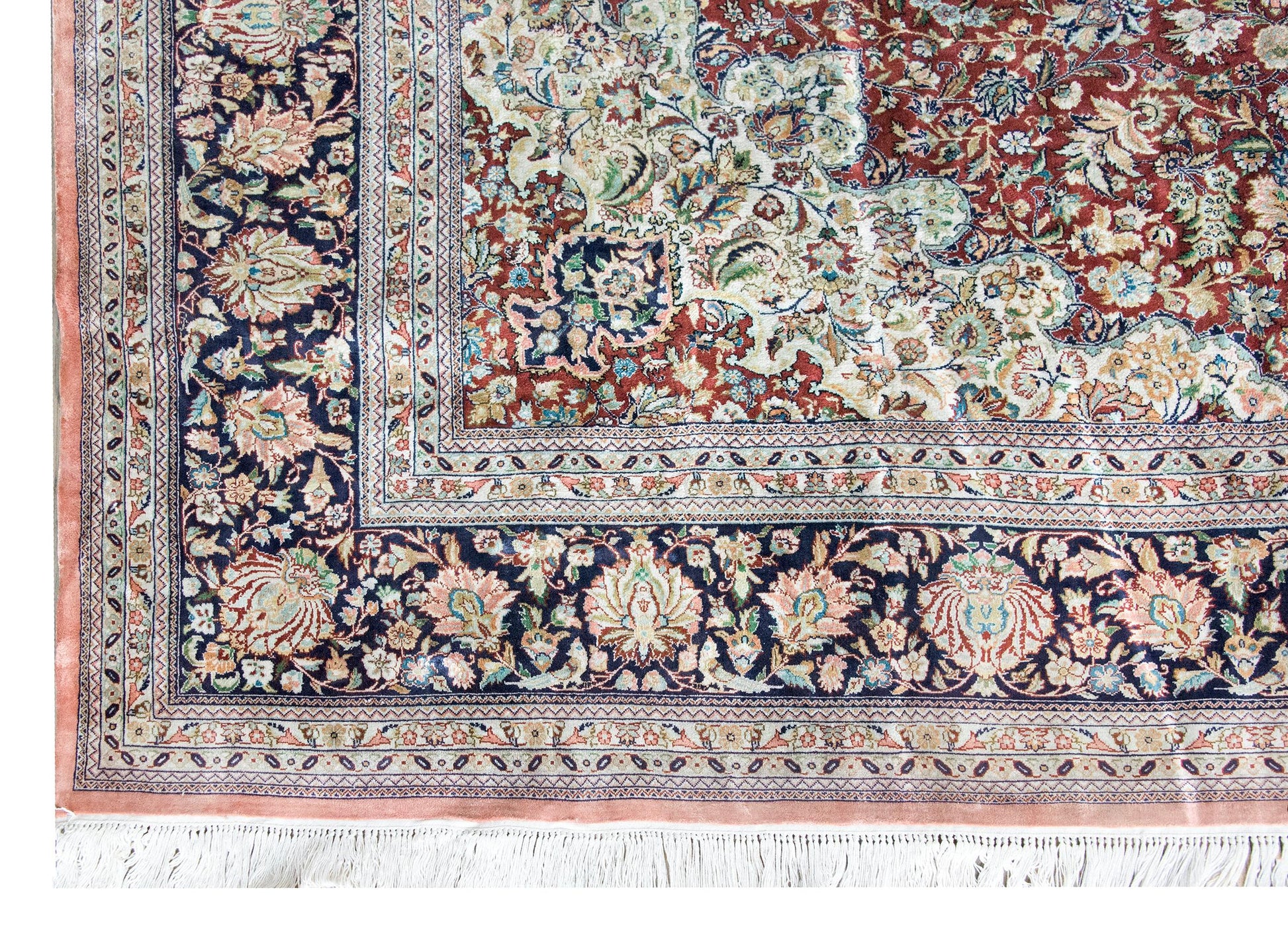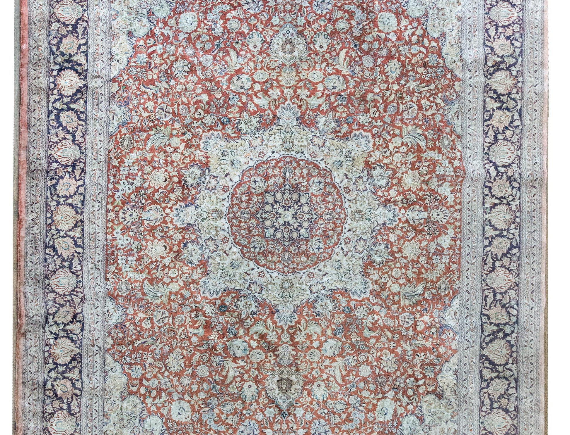 A wonderful late 20th century Persian hand-knotted silk rug featuring a central medallion woven with myriad flowers, and living amidst a field of similar floral clusters. The border is complex with a wide central repeated floral pattern, flanked by pairs of matching petite floral patterned stripes, and all woven in rust, indigo, green, gold, and cream colored silk.