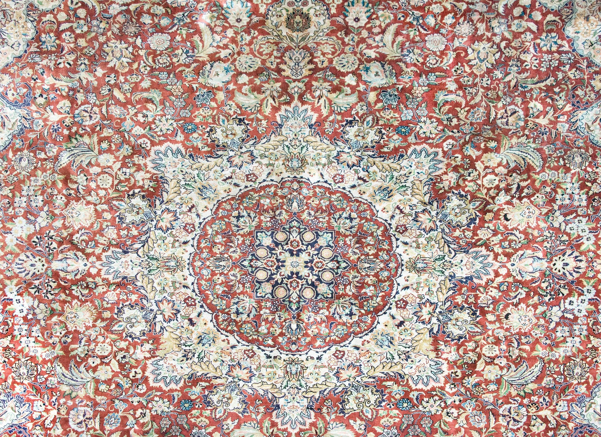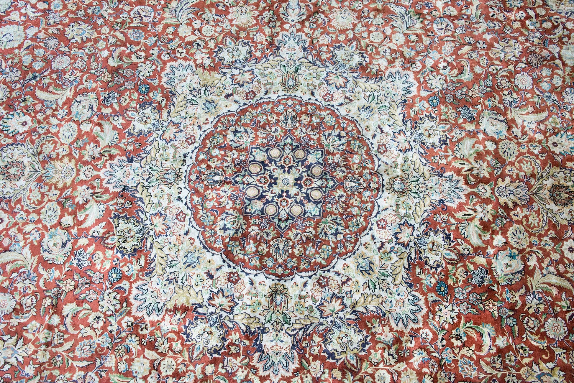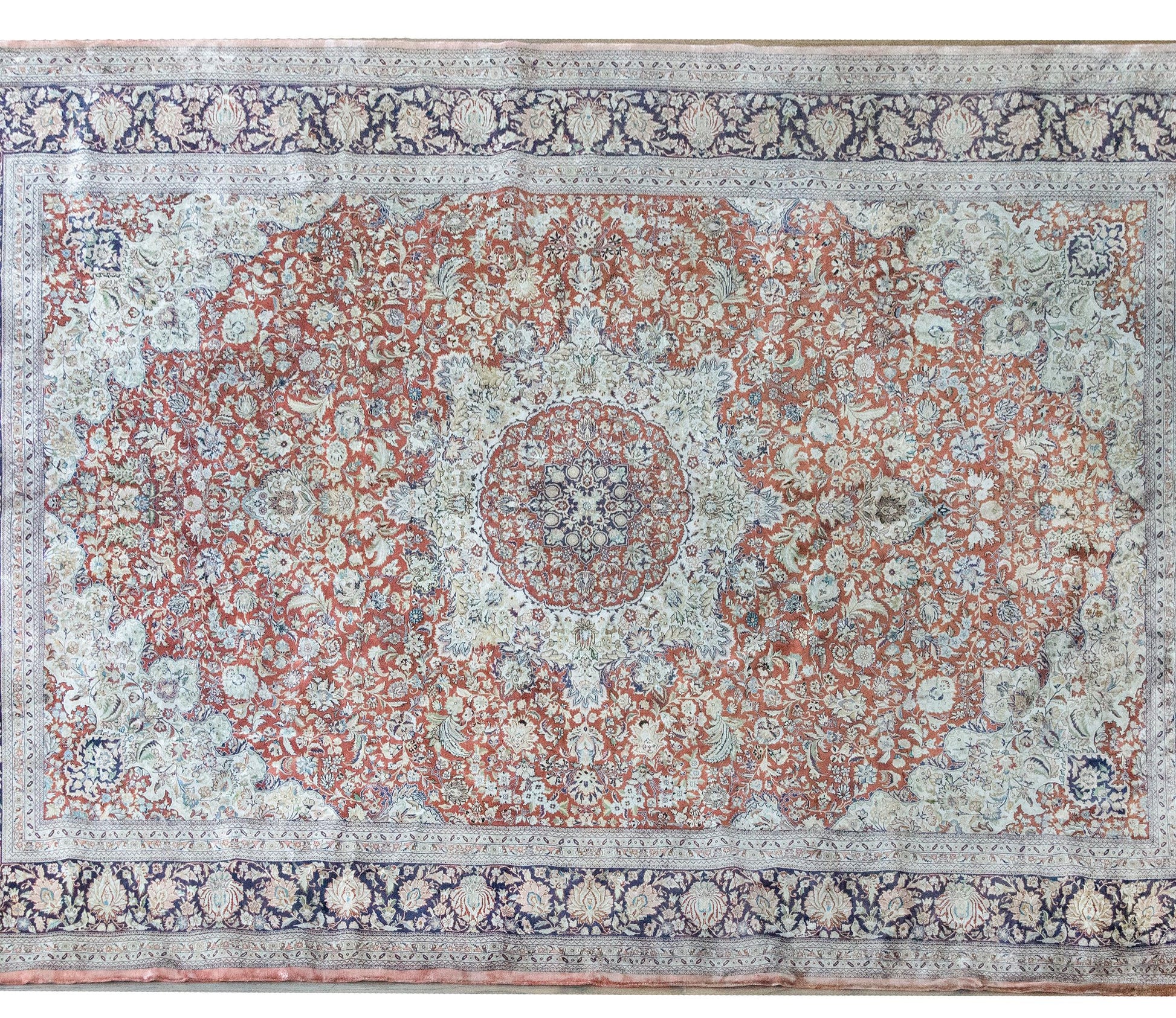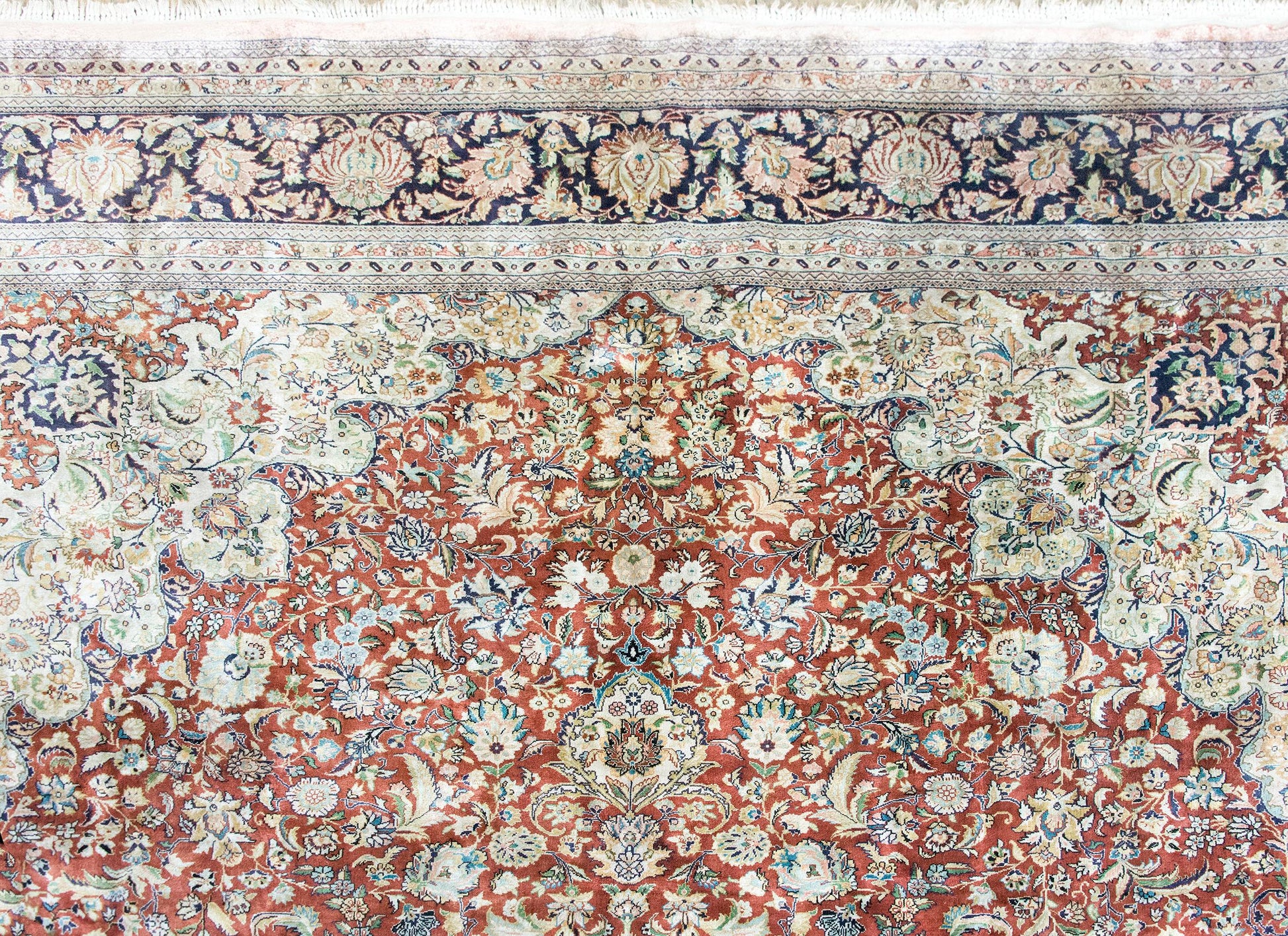 A wonderful late 20th century Persian hand-knotted silk rug featuring a central medallion woven with myriad flowers, and living amidst a field of similar floral clusters. The border is complex with a wide central repeated floral pattern, flanked by pairs of matching petite floral patterned stripes, and all woven in rust, indigo, green, gold, and cream colored silk.