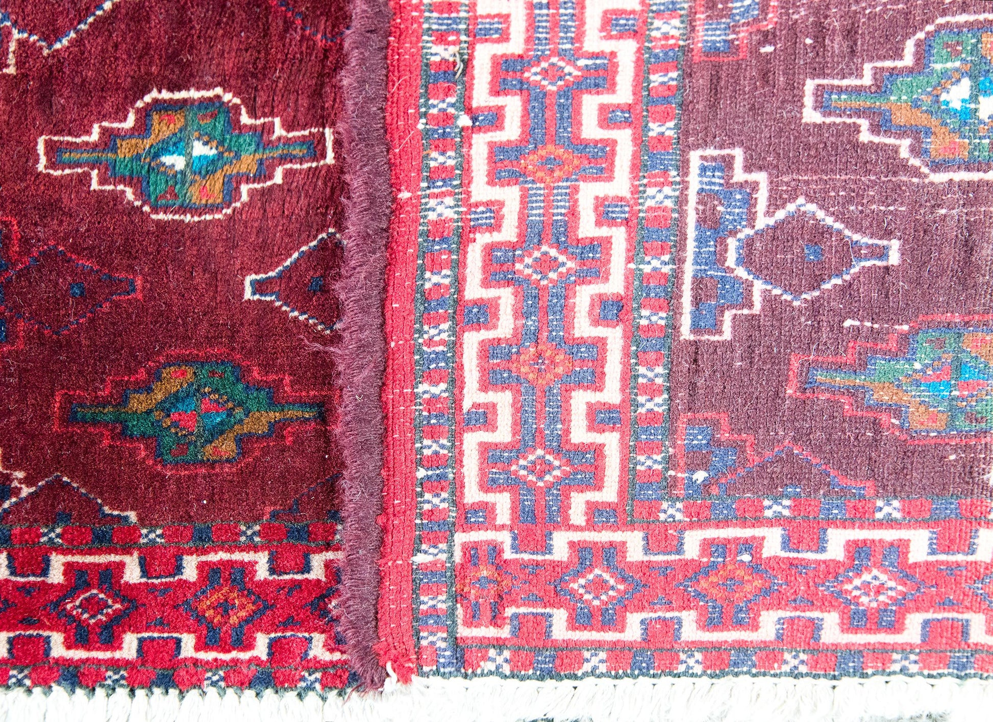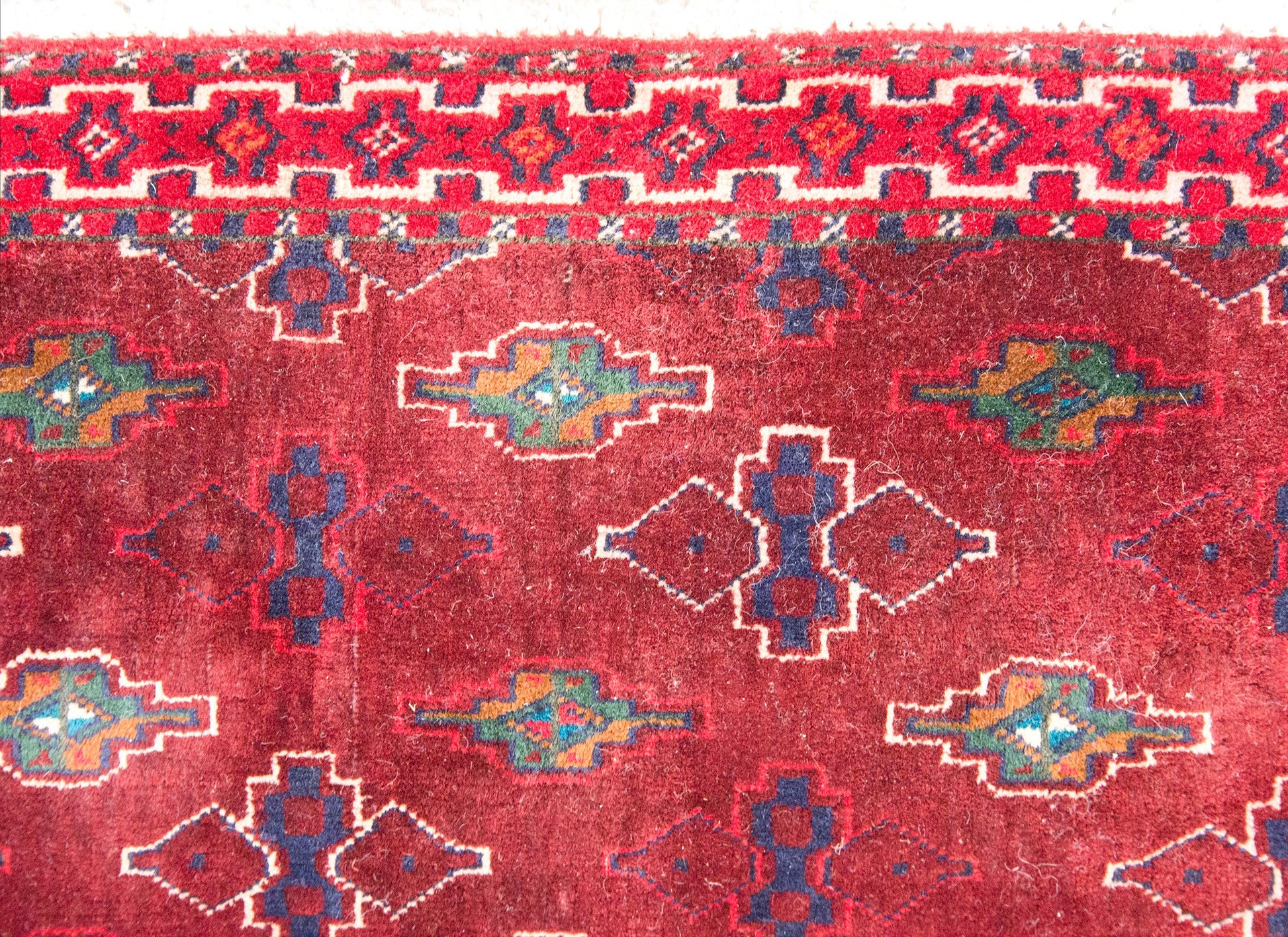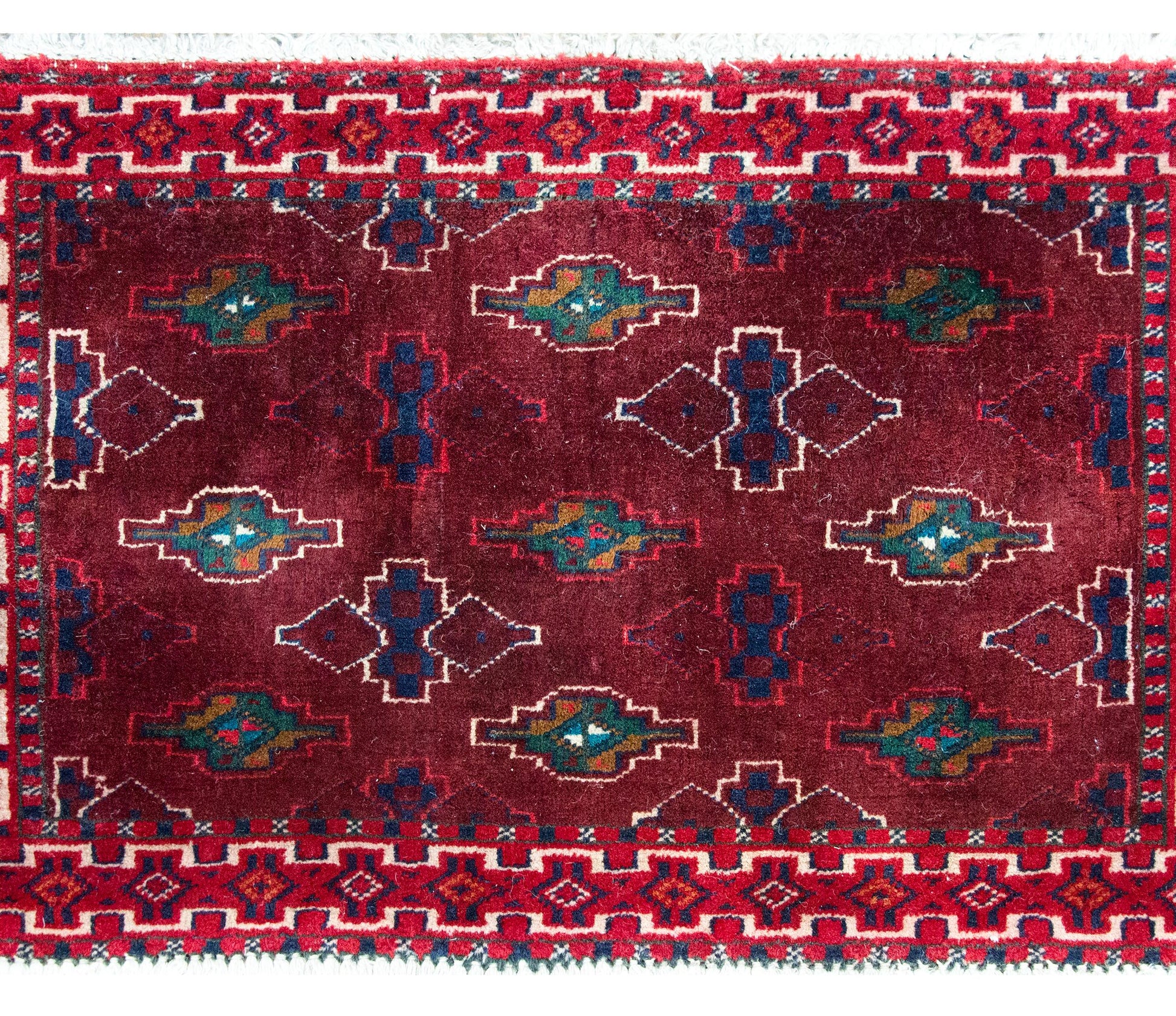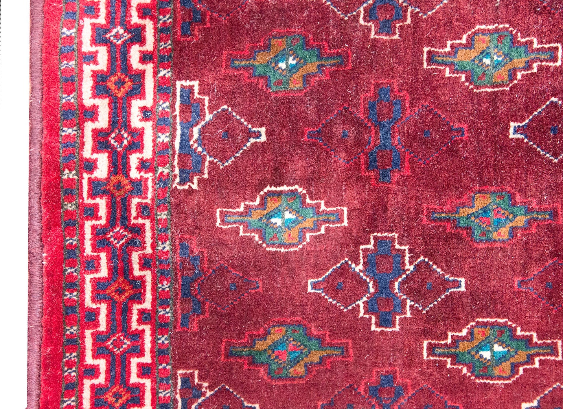 A charming petite Persian Turkmen rug with a field covered in a repeated tribal design and surrounded by a border with geometric patterns, and all woven in rich crimsons, indigos, greens, golds, and white wools.