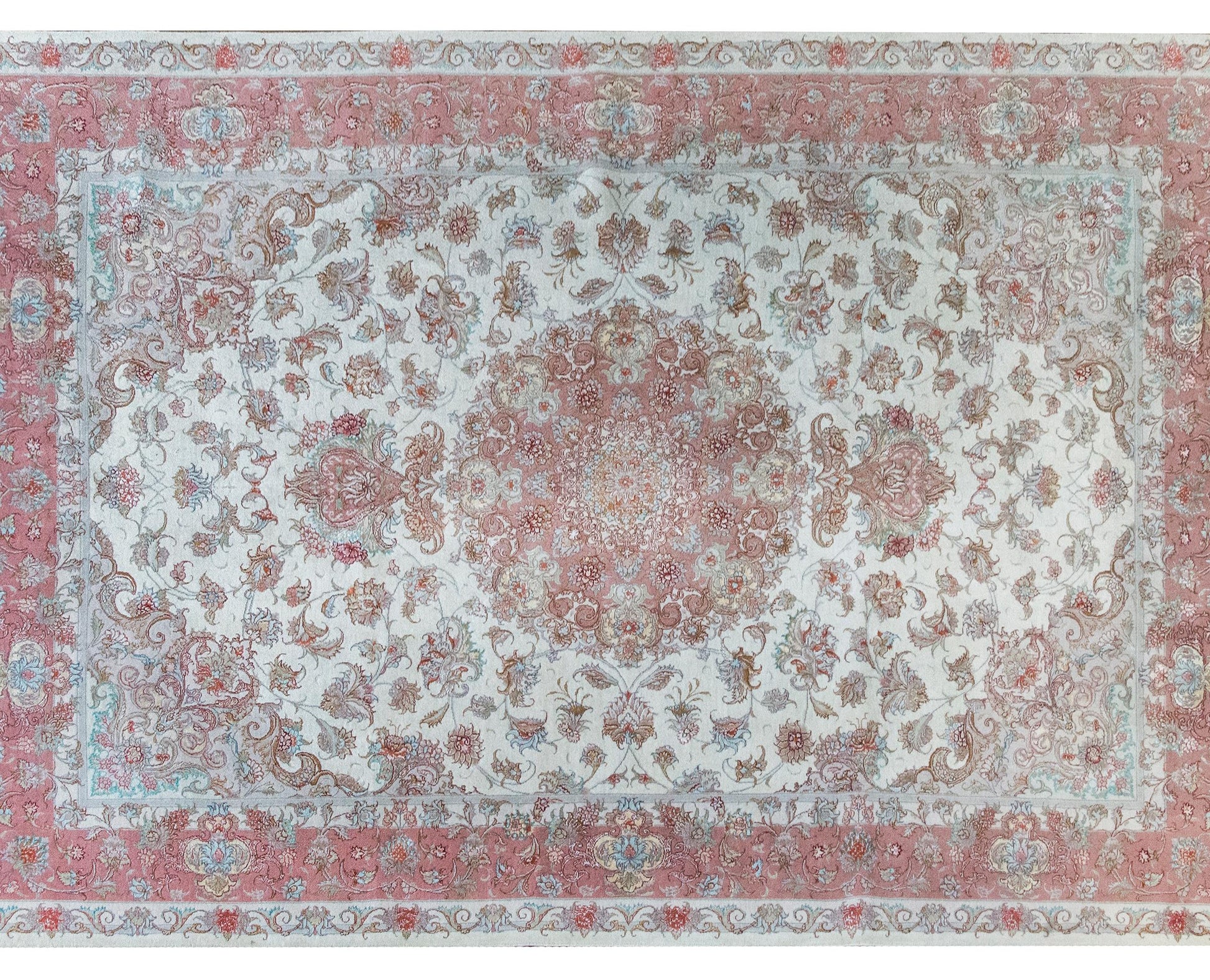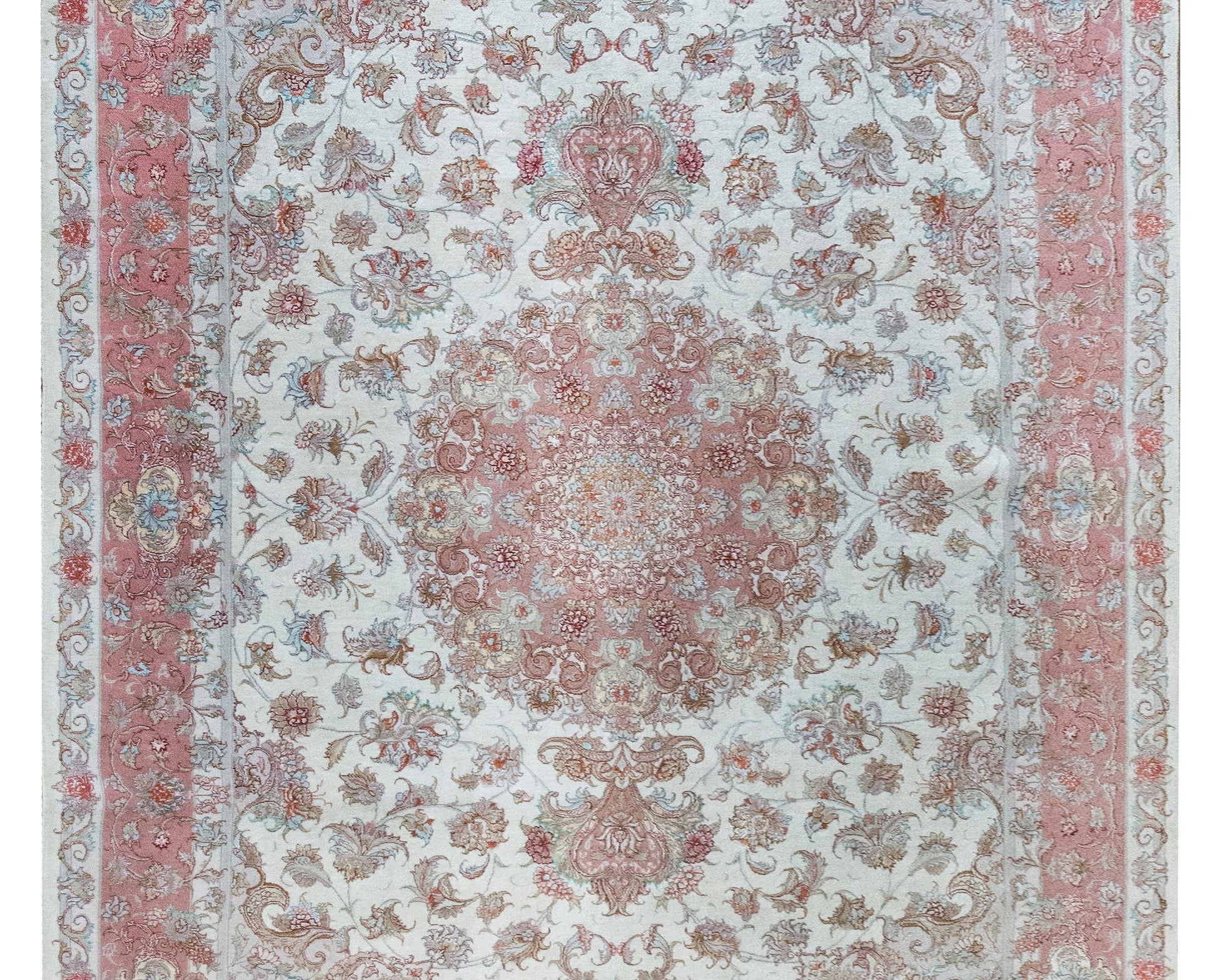 This vintage late 20th-century Persian Tabriz rug features a mesmerizing central floral medallion, woven with intricate blossoms, curling leaves, and delicate scrolling vines. The medallion blooms within a creamy white wool field, itself bursting with a garden of even more finely rendered floral motifs. A wide border surrounds the composition, echoing the same graceful flowers and vines, creating a harmonious and richly layered design. Woven in a refined palette of pink, burgundy, cream, green, and deep indigo, the rug balances elegance and vibrancy with ease.
