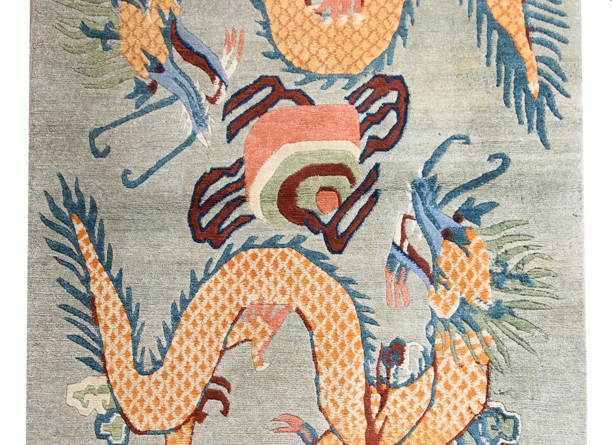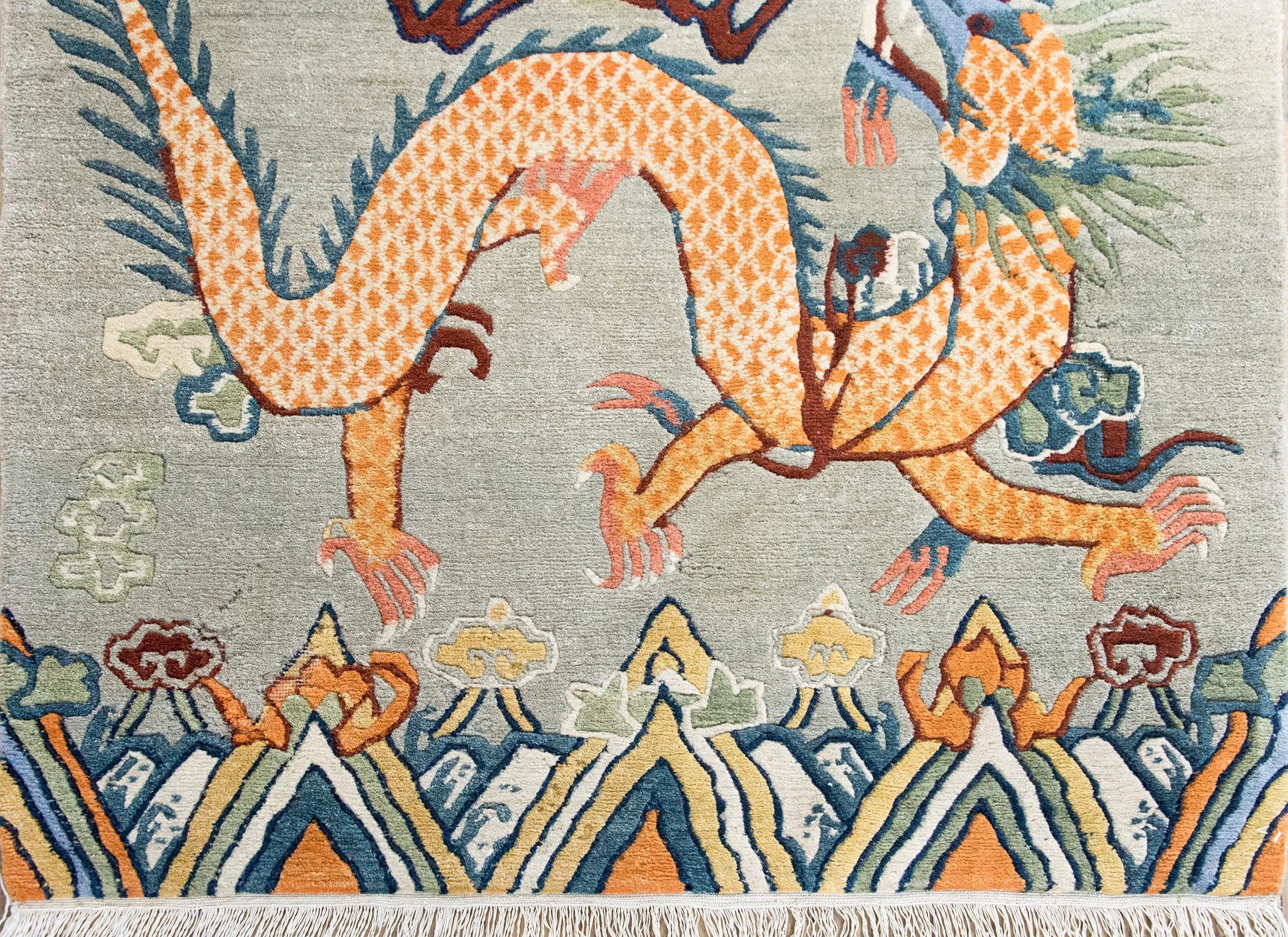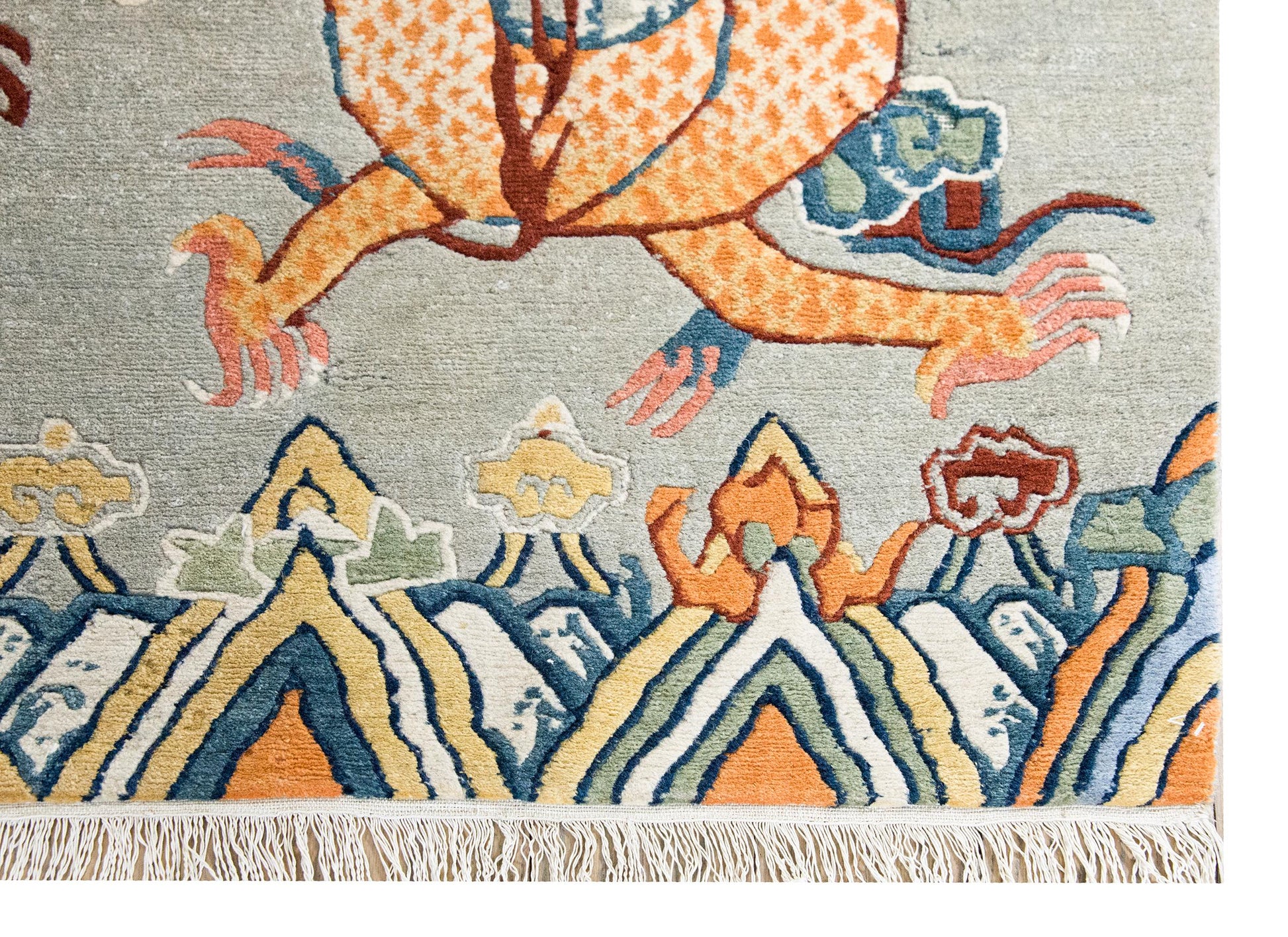 A striking late 20th century Tibetan hand-knotted wool rug with double dragons swirling around a pearl of truth, and with turbulent storm clouds at each end, and all woven in indigos, oranges, reds, and greens.