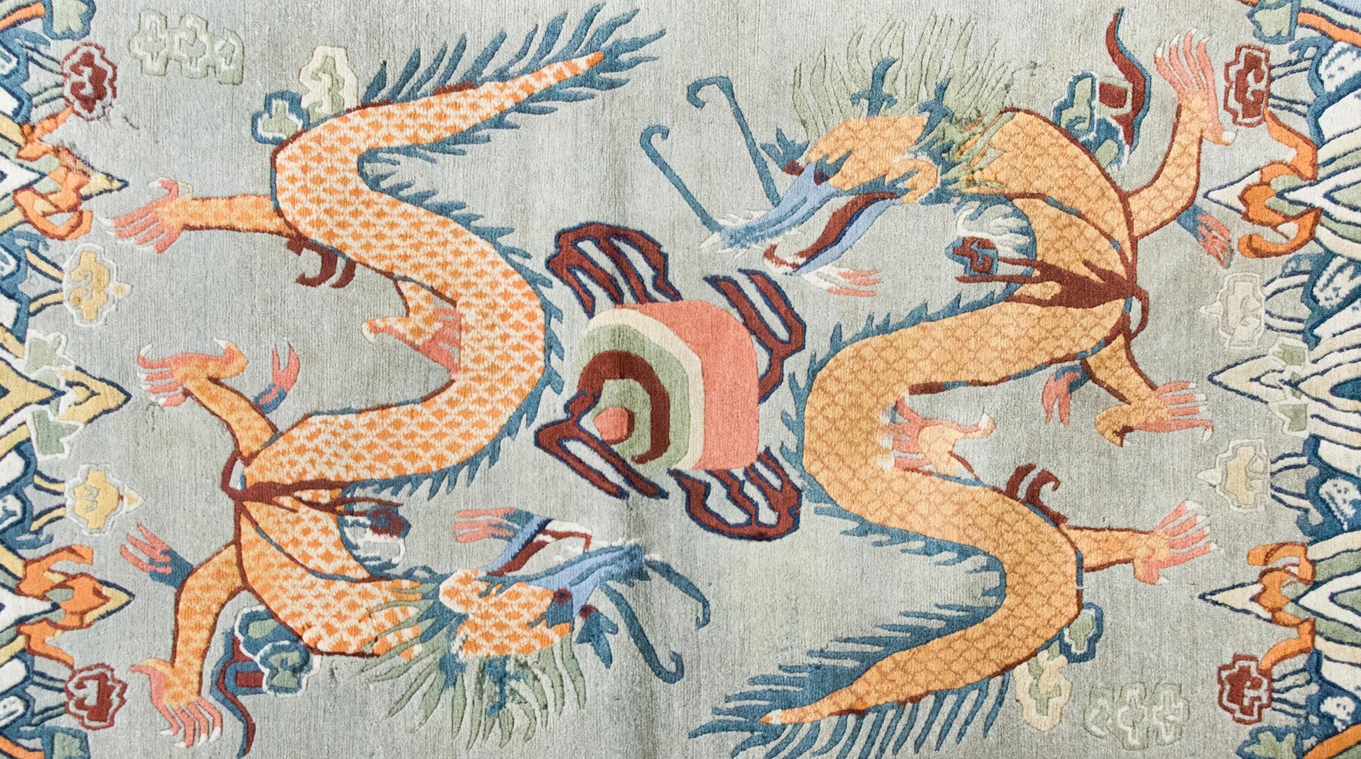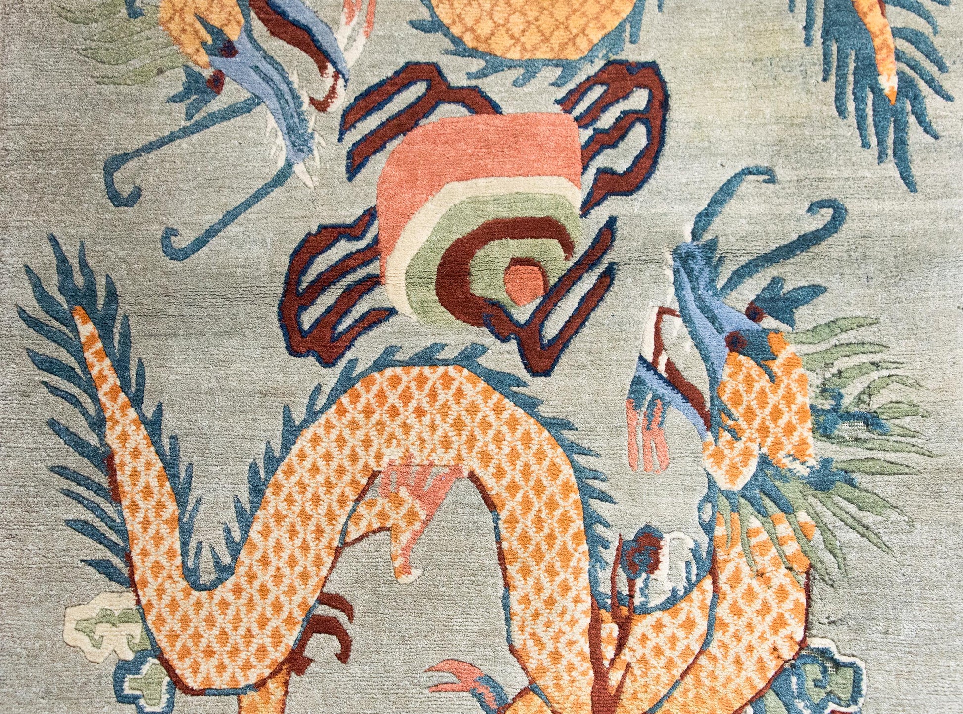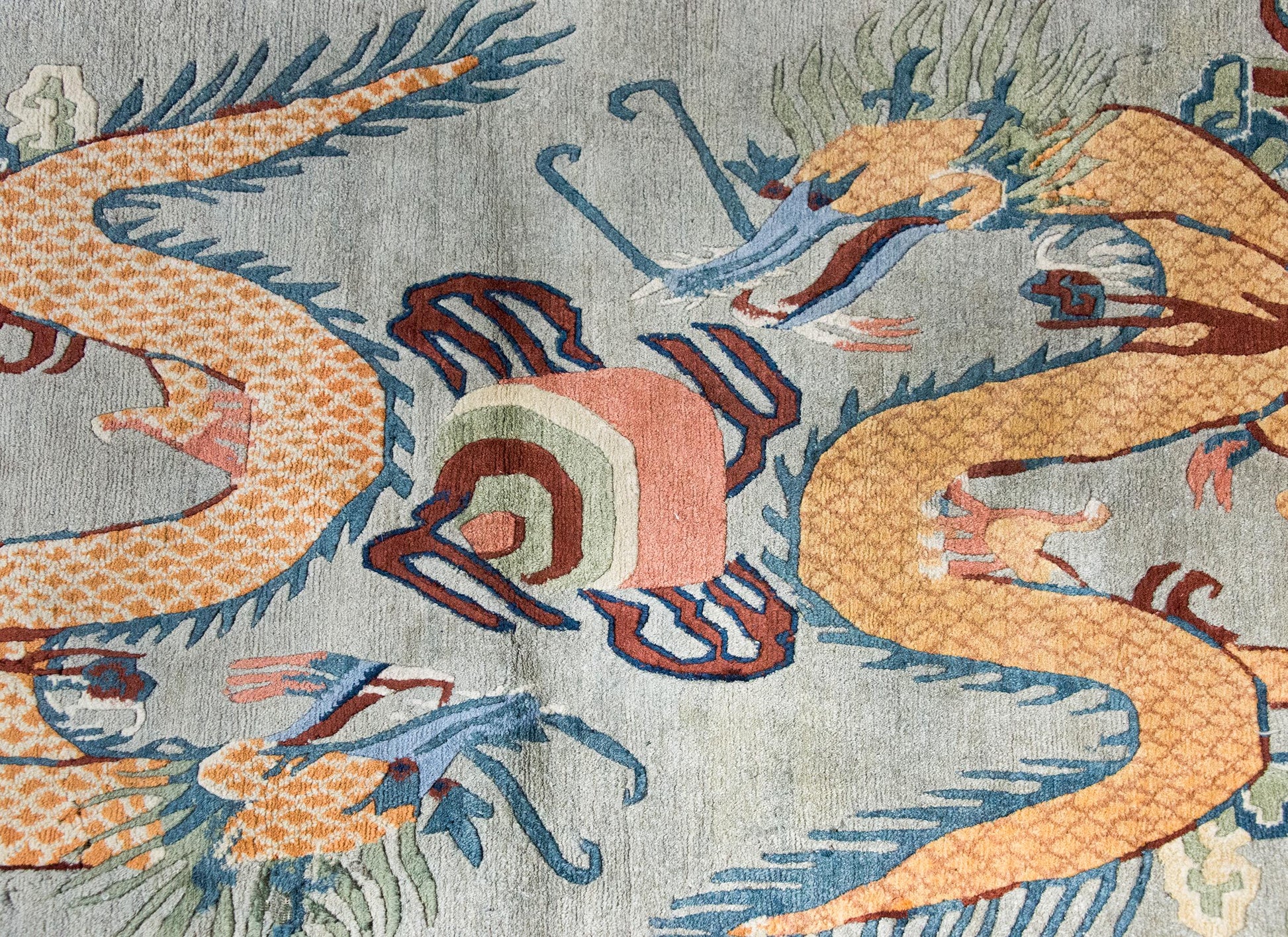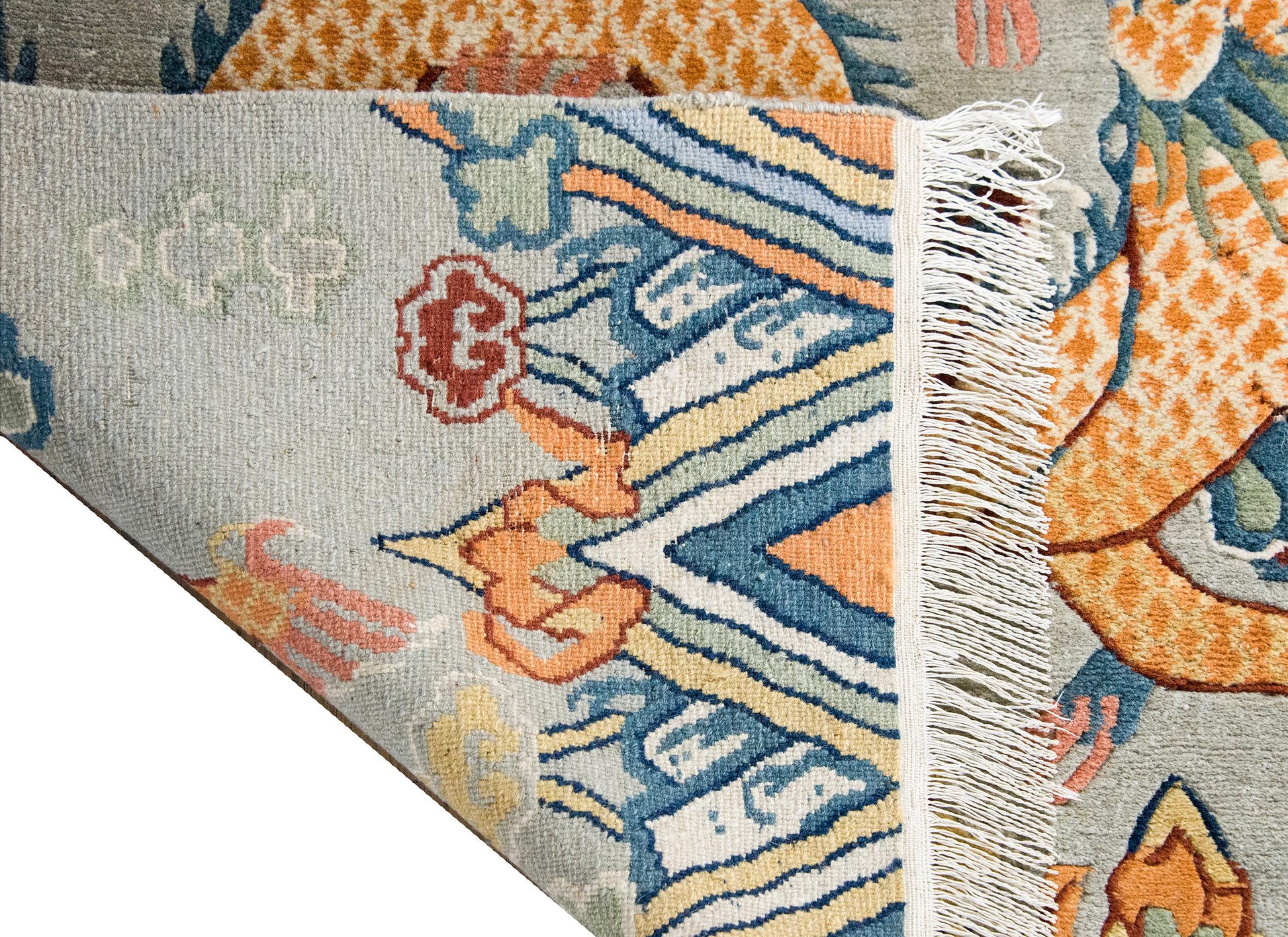 A striking late 20th century Tibetan hand-knotted wool rug with double dragons swirling around a pearl of truth, and with turbulent storm clouds at each end, and all woven in indigos, oranges, reds, and greens.