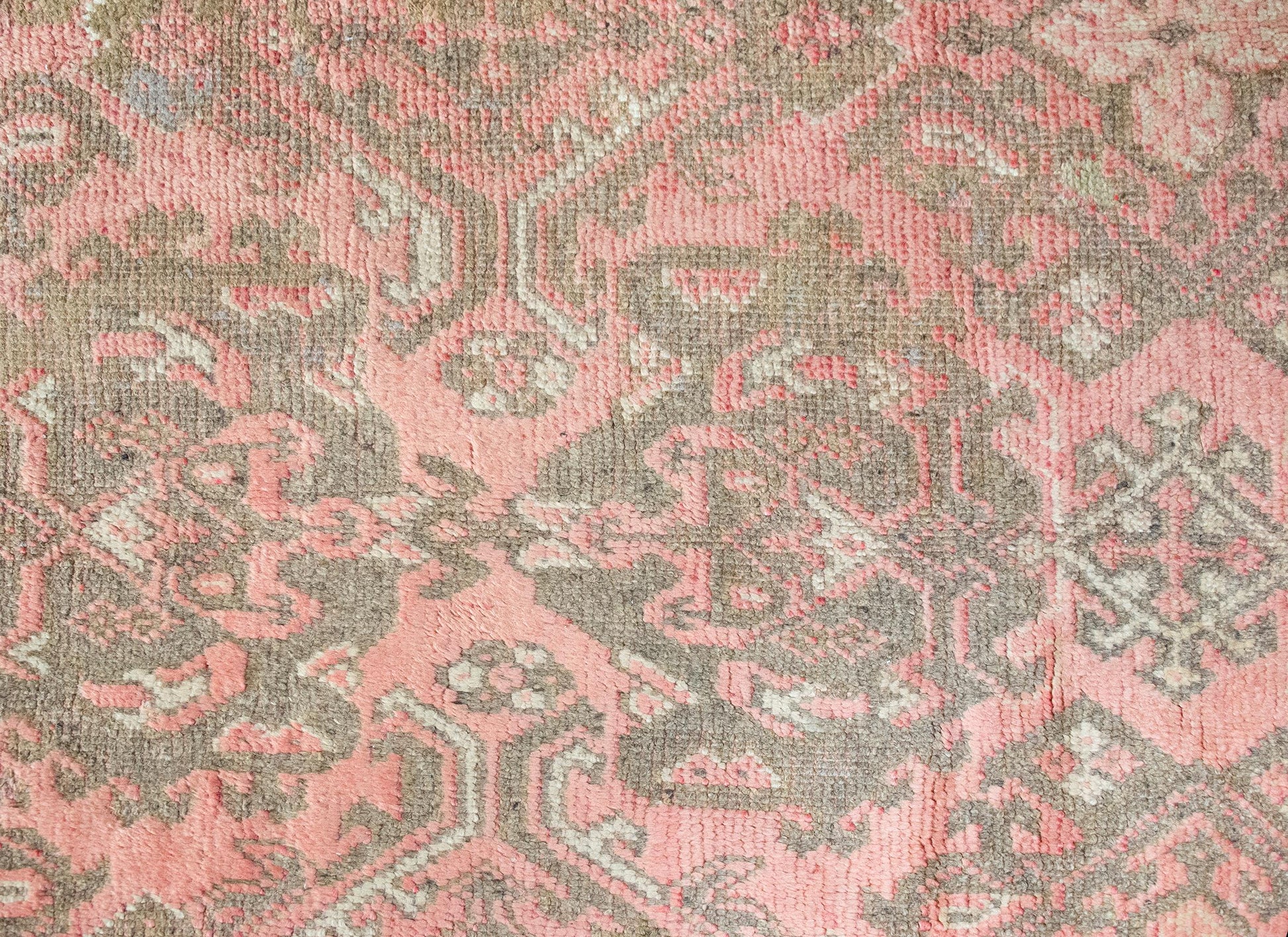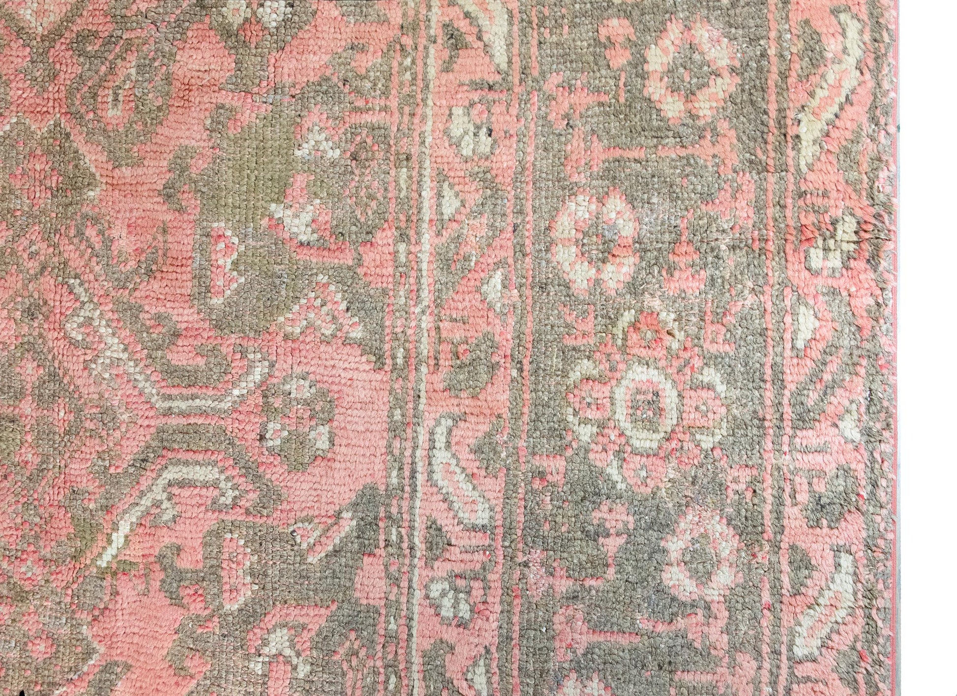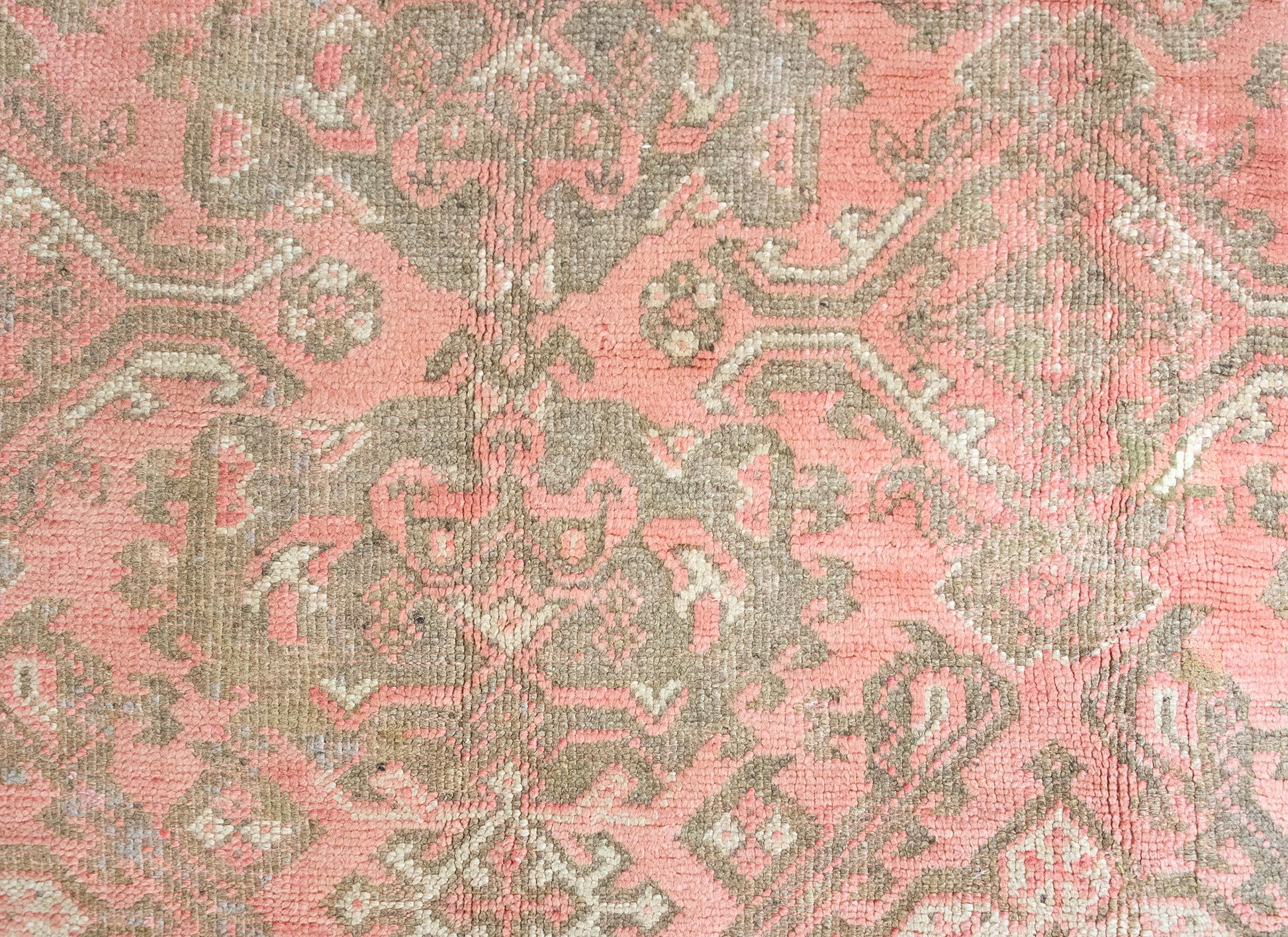 An incredible early 20th century Turkish Oushak rug with an all-over large-scale tone-on-tone mirrored floral pattern surrounded by a similarly patterned border, and all woven in muted shades or coral and brown wool.