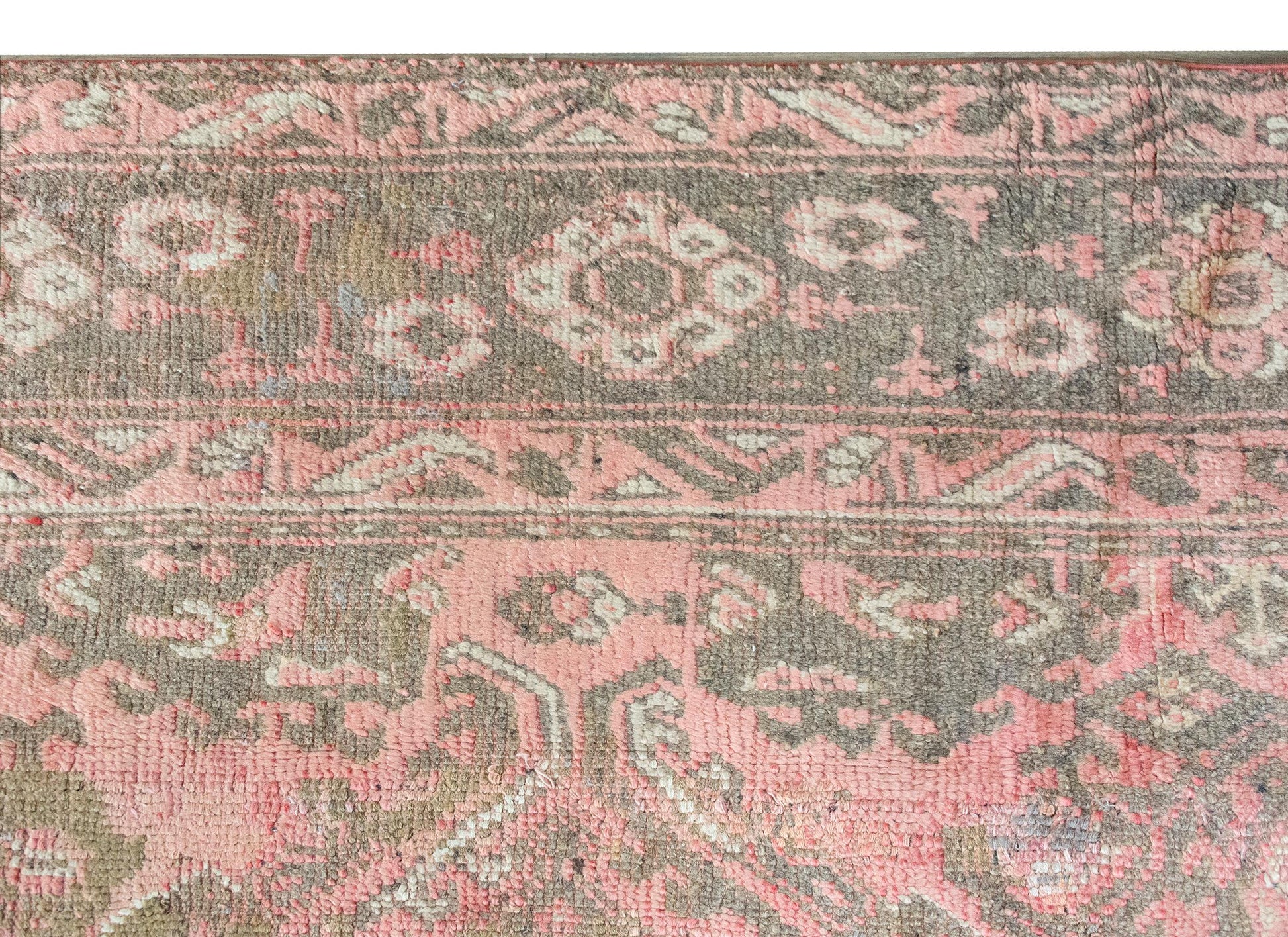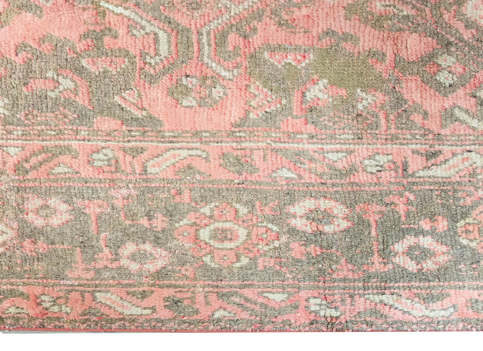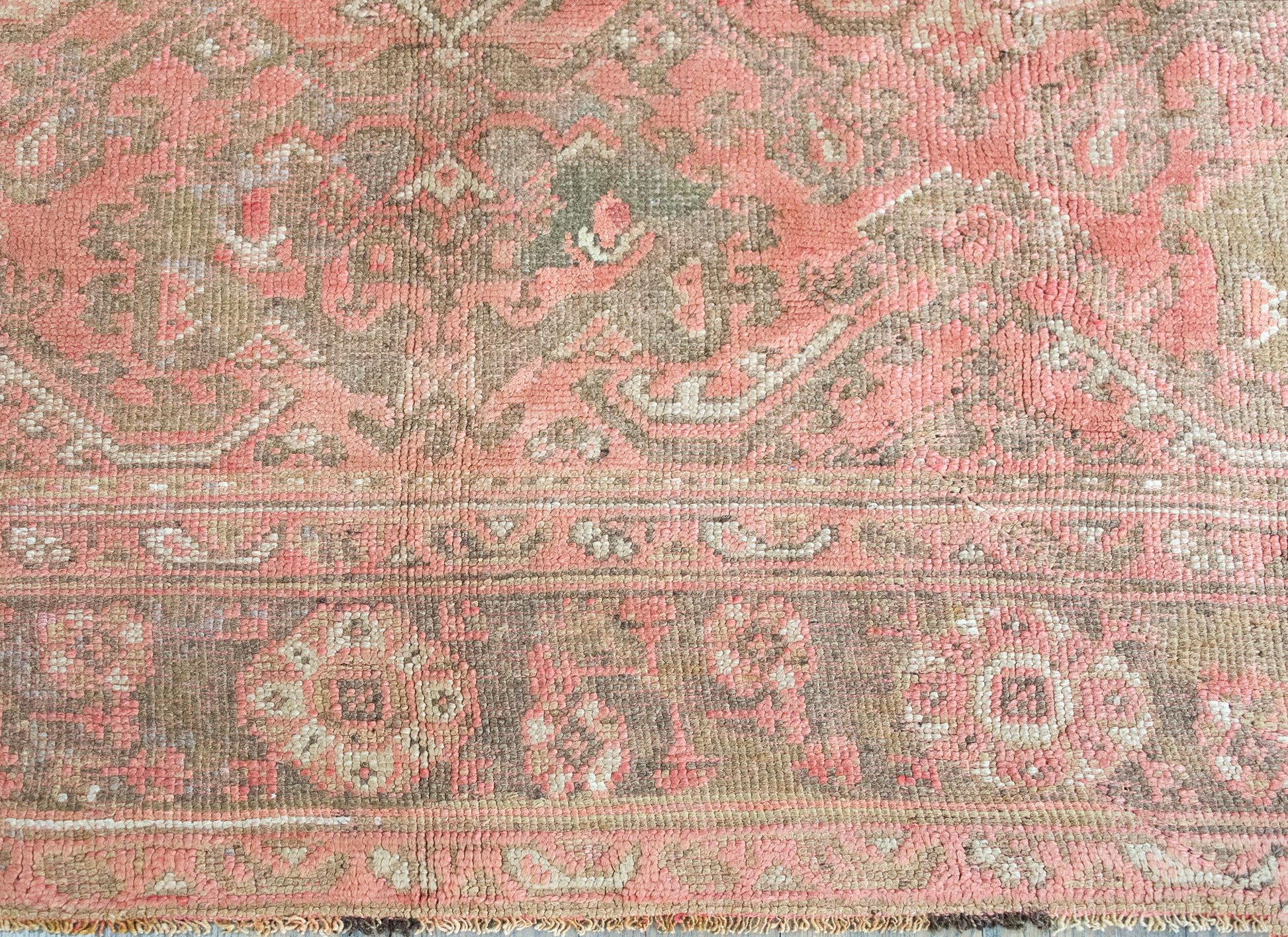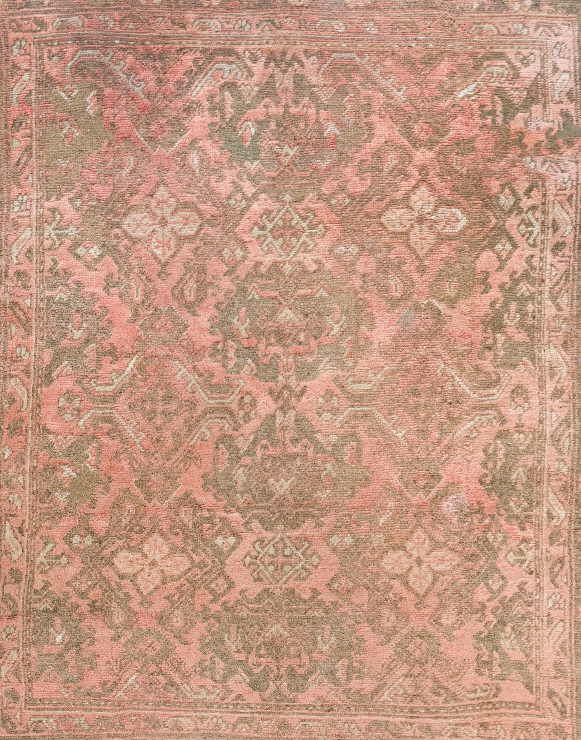 An incredible early 20th century Turkish Oushak rug with an all-over large-scale tone-on-tone mirrored floral pattern surrounded by a similarly patterned border, and all woven in muted shades or coral and brown wool.